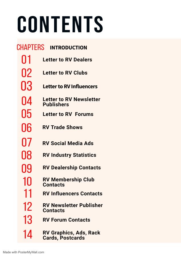 INFLUENCERS: Everyone knows the POWER of Influencers, Use the Letter included here to send to influencers. You can find tons of influencers in minutes by going to YouTube and Search RV Lifestyle, or RV Tips, etc and you will see RV Videos that get millions of viewsnow the producers of these videos are looking for ways to monetize their videos and you will offer the perfect product at the perfect time. One RV Influencer can generate you hundreds of thousands of $ in sales.
