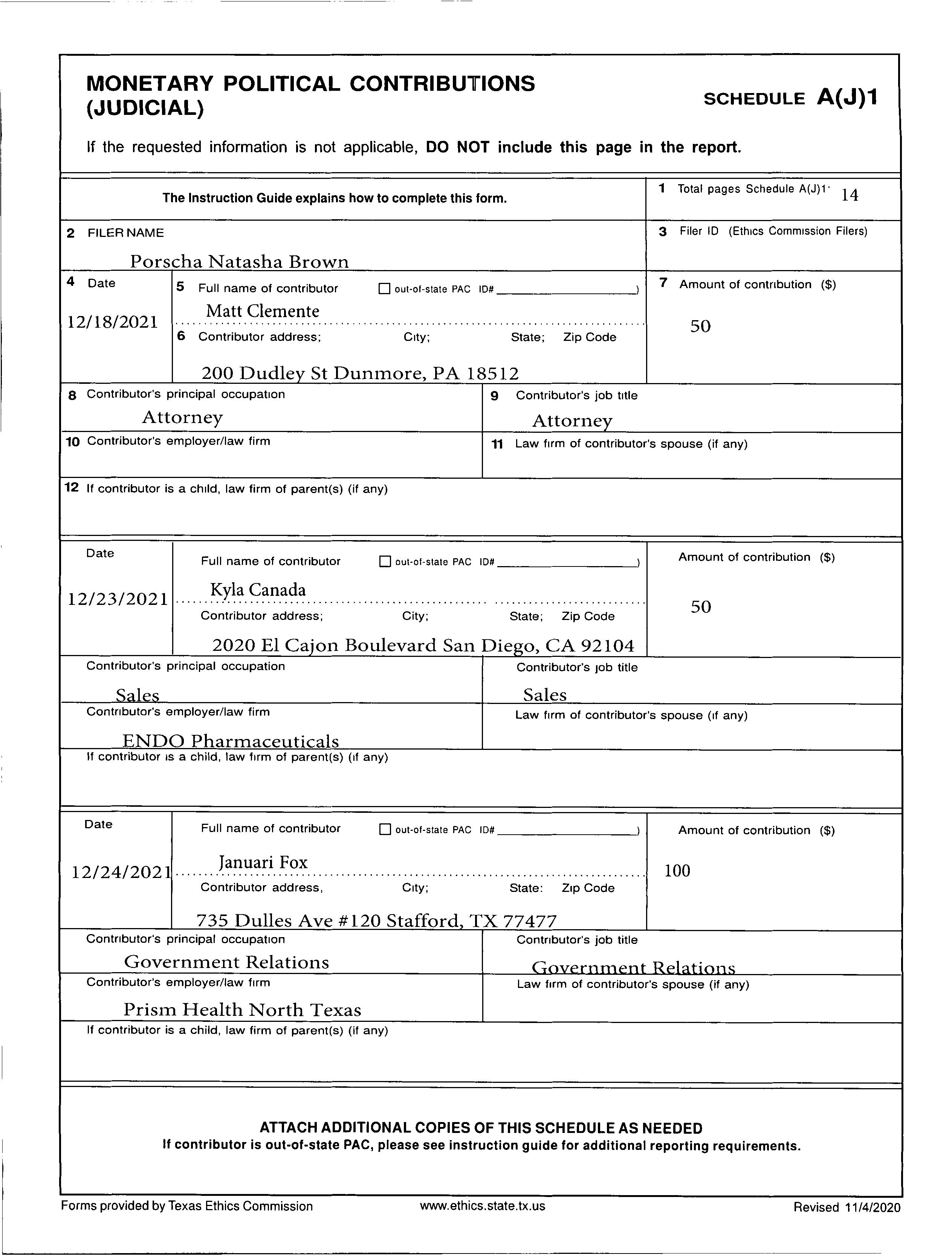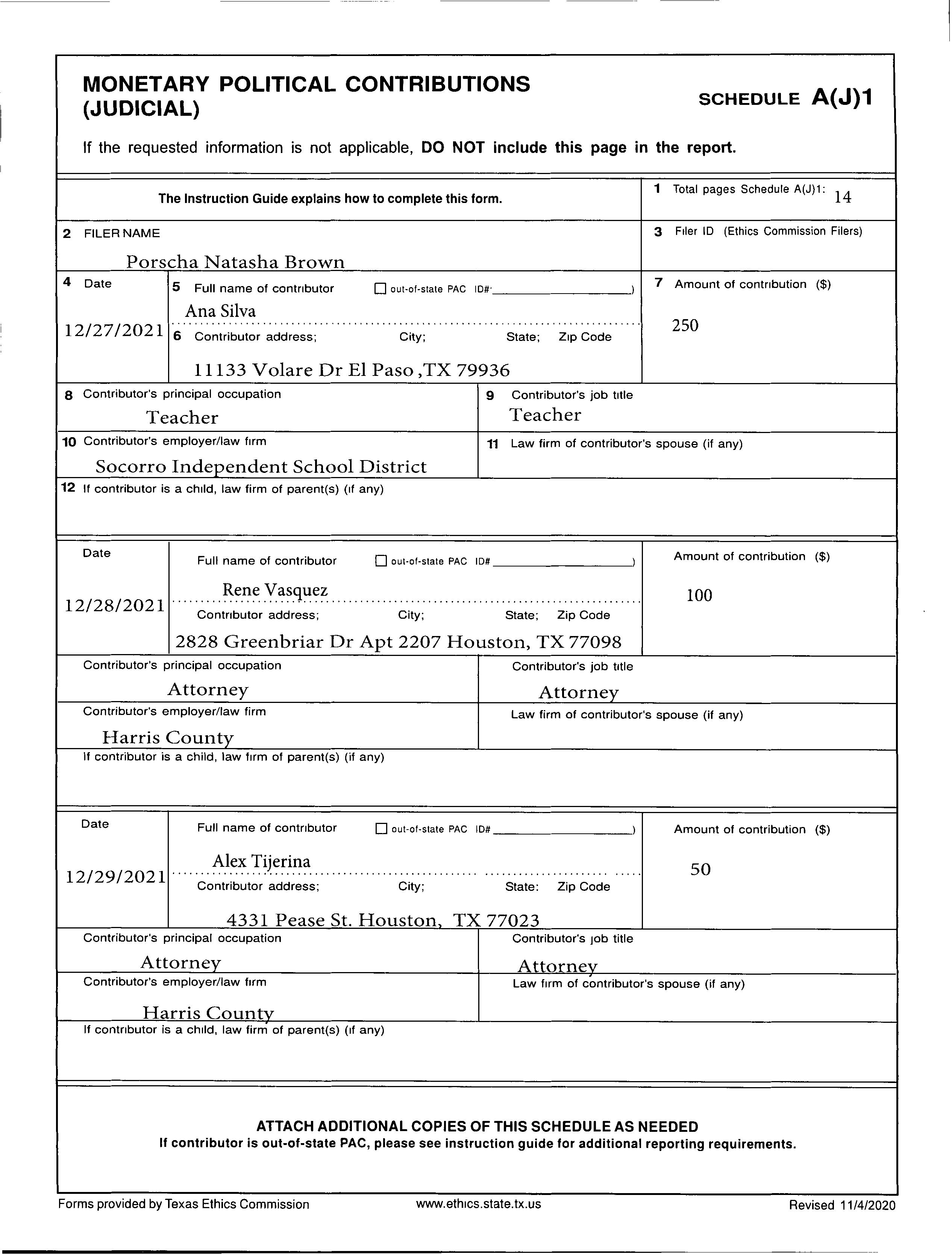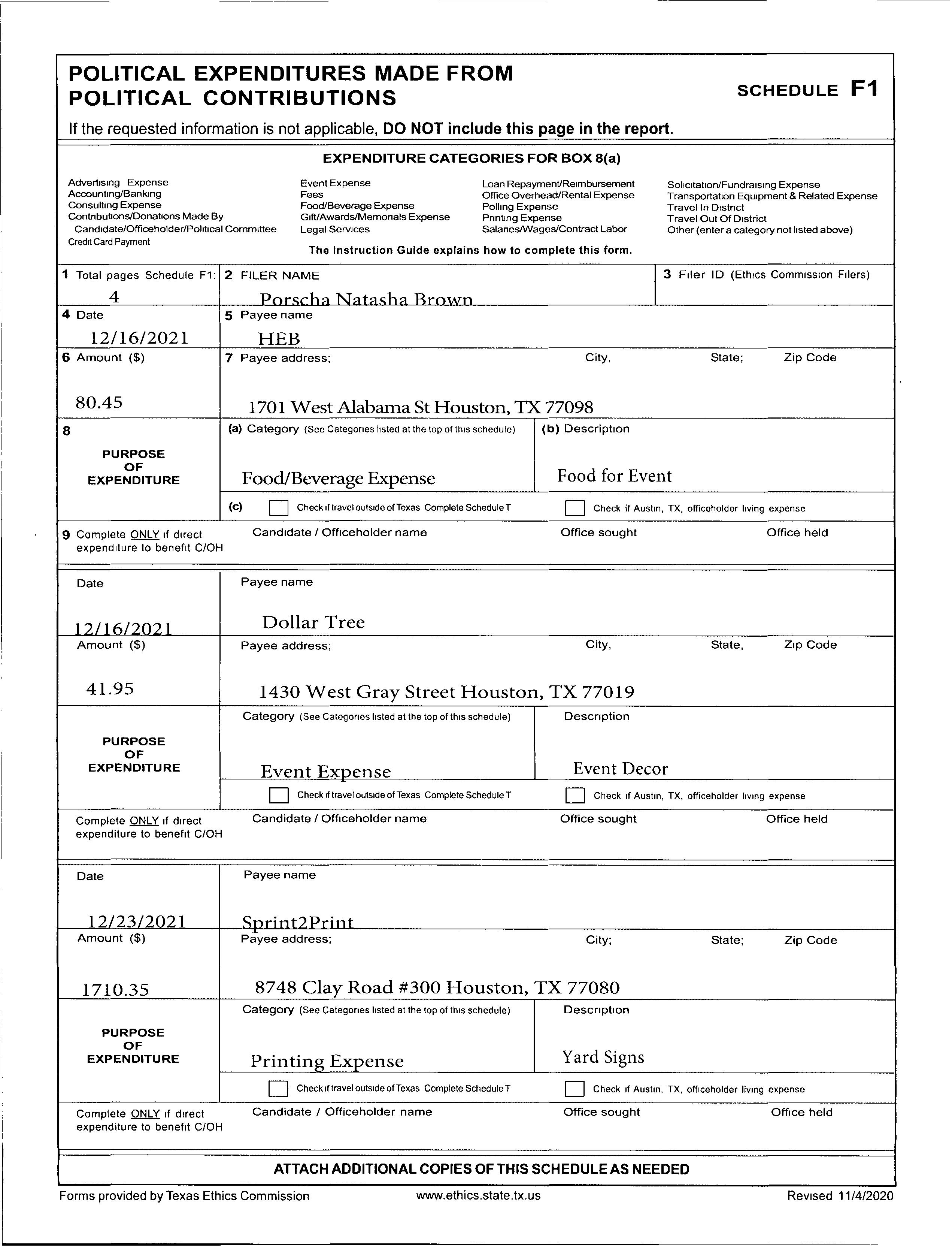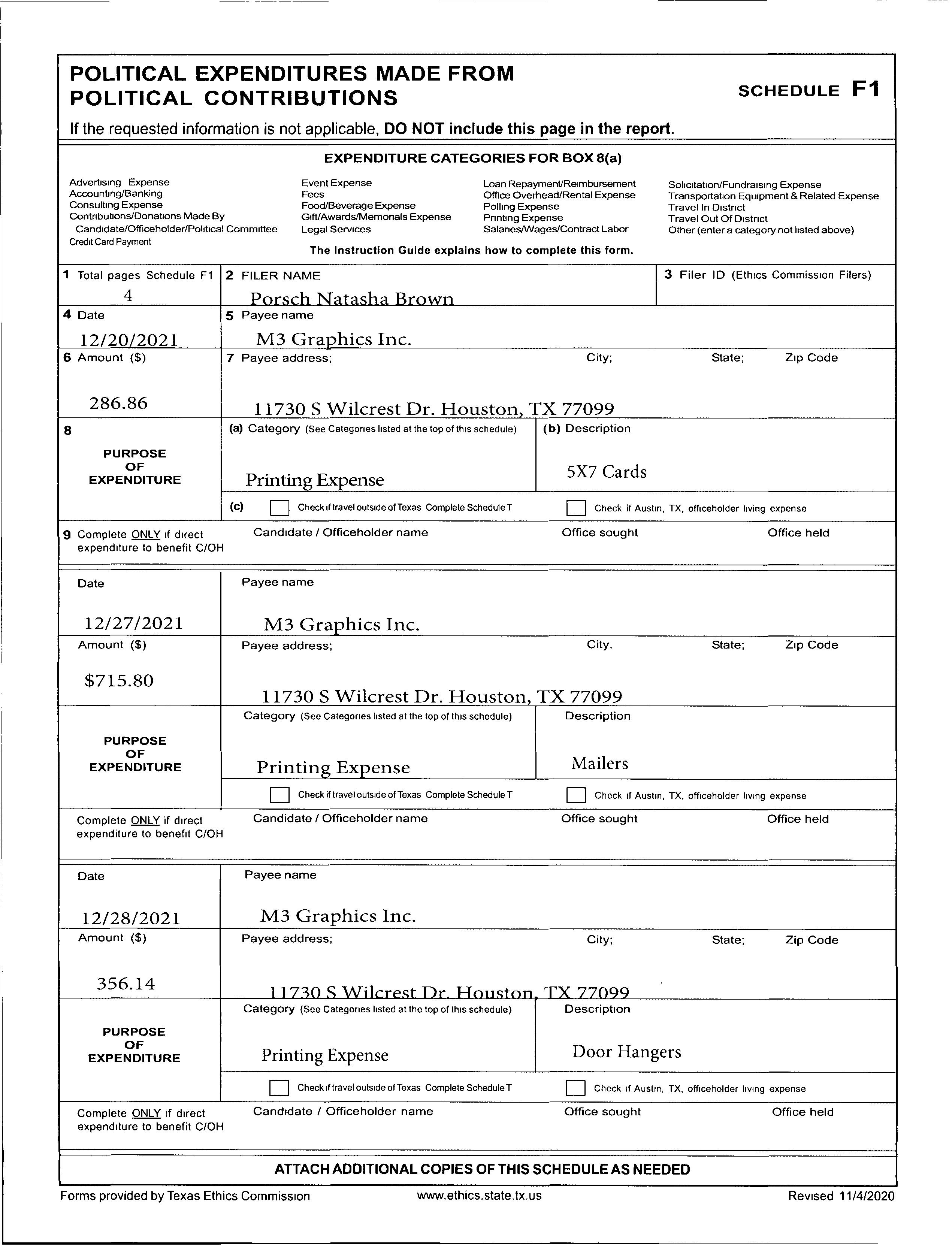 This campaign finance report was filed by Porscha Natasha Brown on January 18, 2022, with the Harris County Elections Administrator in the race for Judge, County Criminal Court at Law No.3. Aubrey R Taylor Communications is the publisher of Houston Business Connections Newspaper.