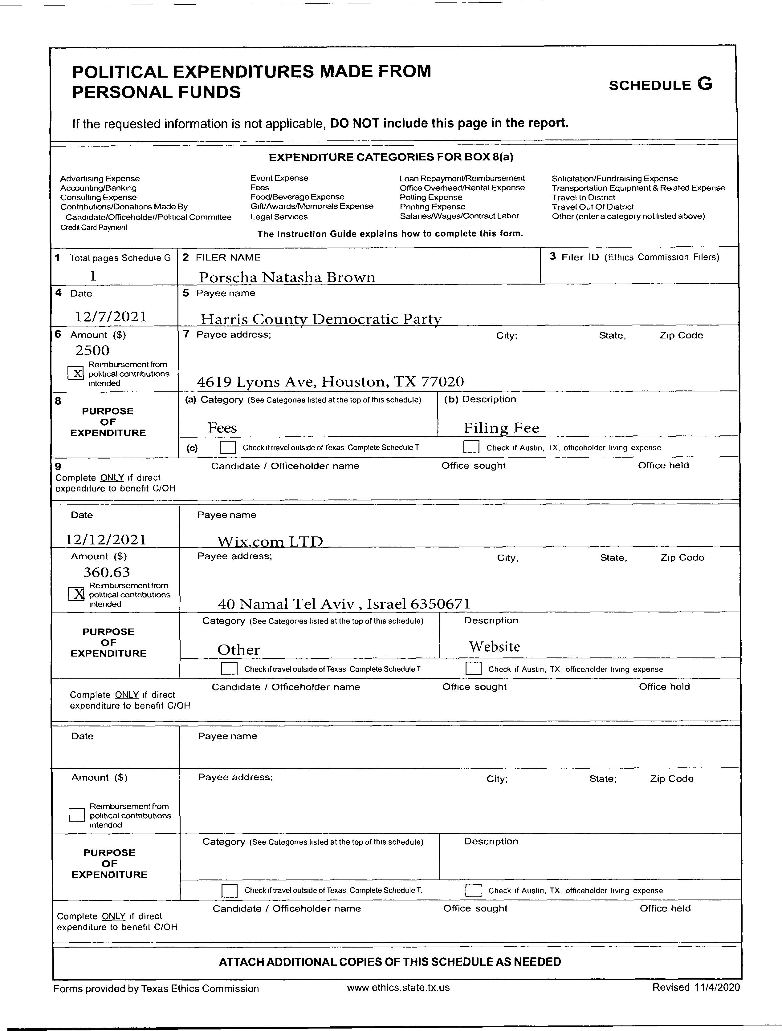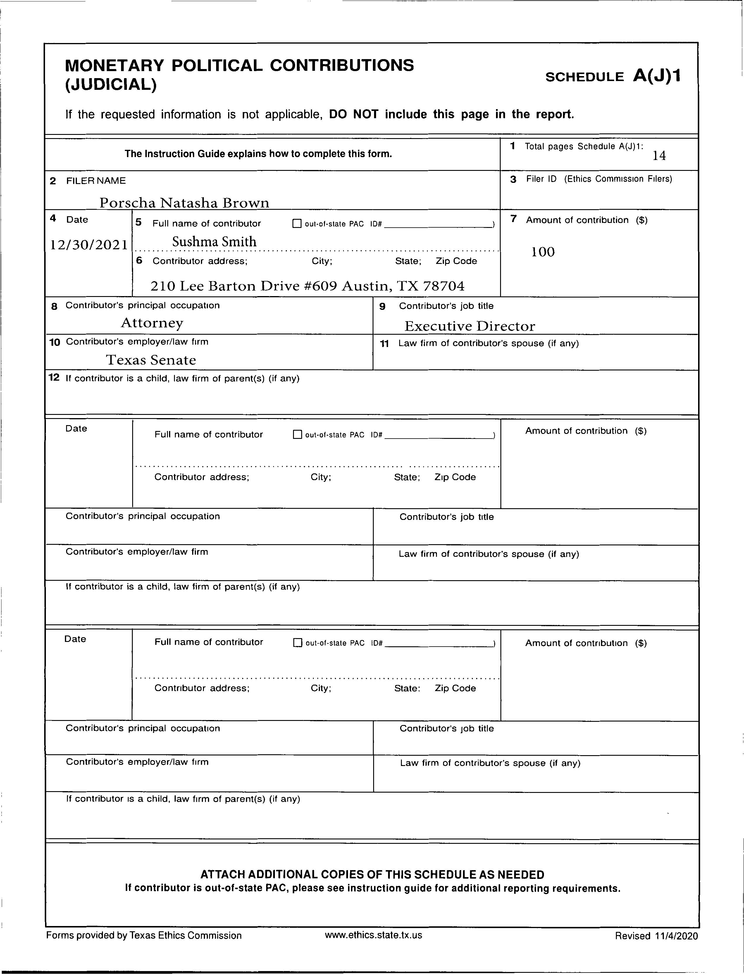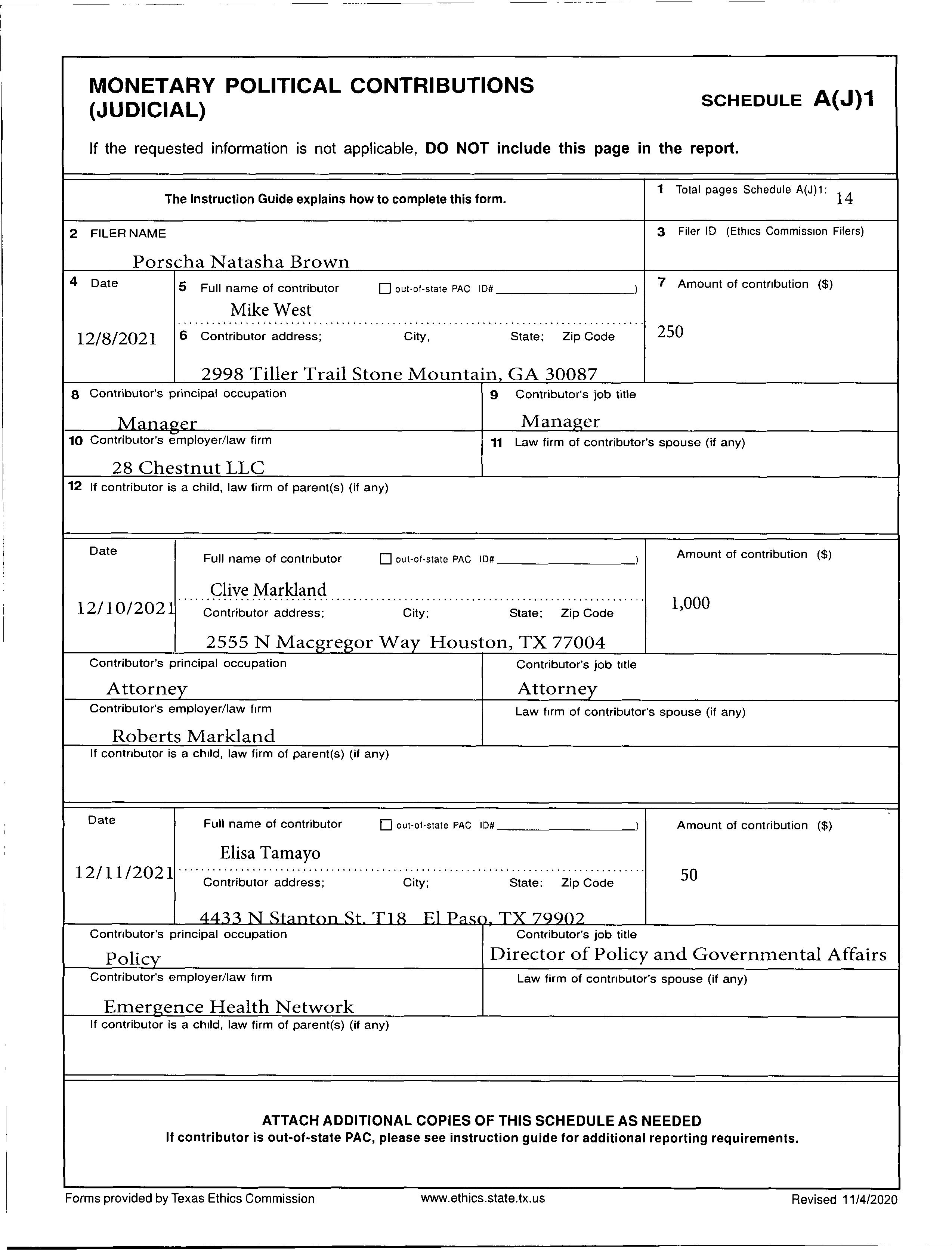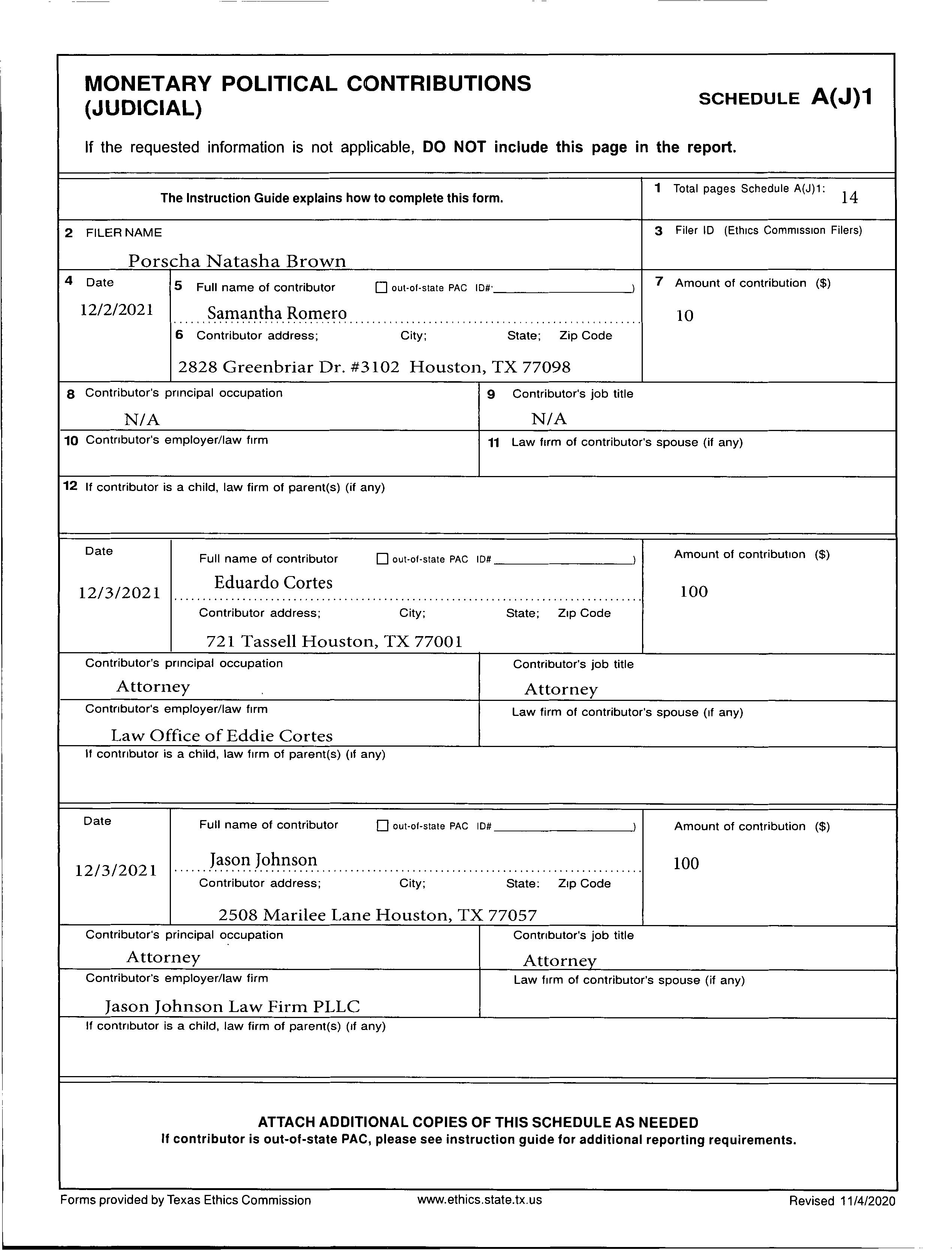 This campaign finance report was filed by Porscha Natasha Brown on January 18, 2022, with the Harris County Elections Administrator in the race for Judge, County Criminal Court at Law No.3. Aubrey R Taylor Communications is the publisher of Houston Business Connections Newspaper.