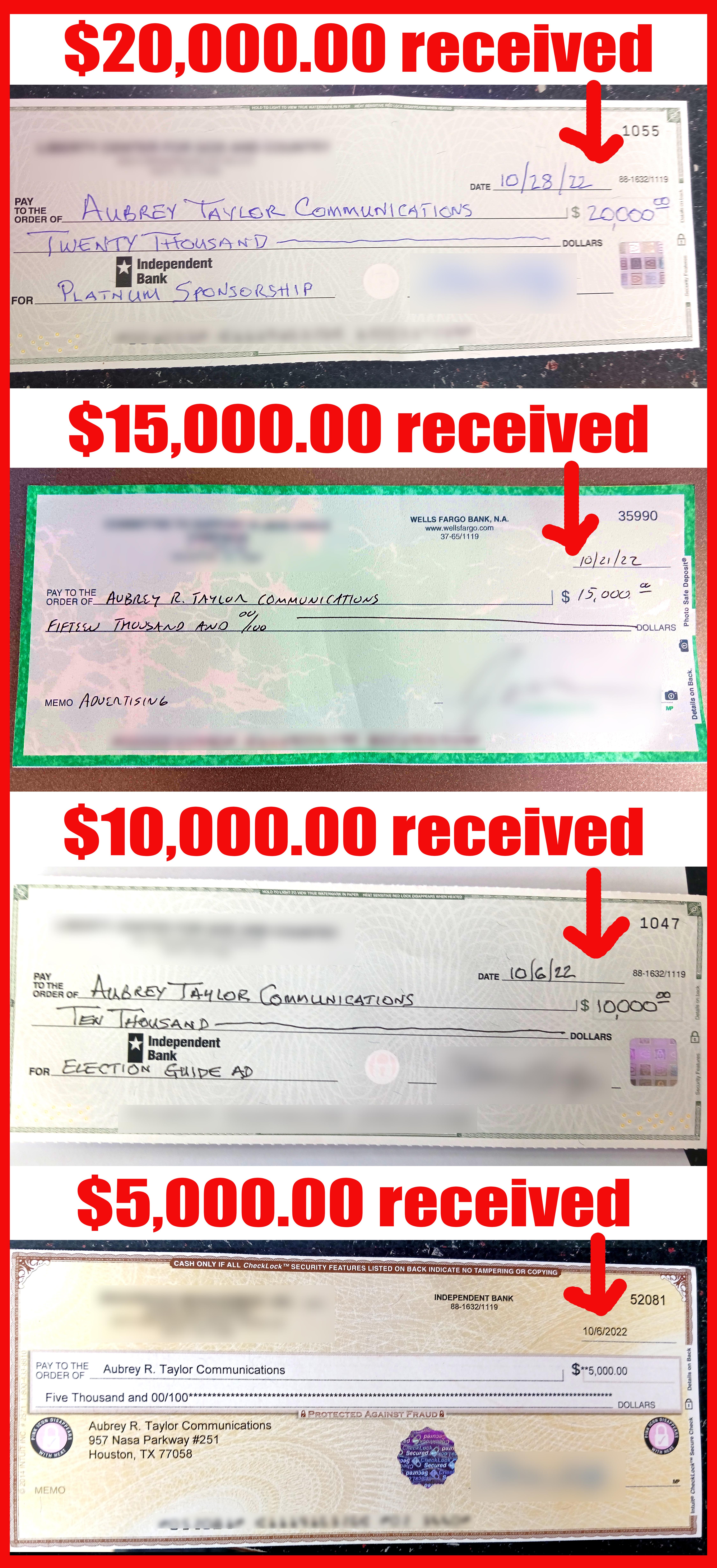 As an example of how Conservatives do business, back on October 28, 2022, Aubrey R. Taylor Communications received a check for $20,000.00 for a sponsorship. Back on October 21, 2022, Aubrey R. Taylor Communications received a check for $15,000.00 for advertising. Back on October 6, 2022, Aubrey R. Taylor Communications received a check for $10,000.00 from a conservative client to support our election guide. And a check for $5,000.00 was received from a conservative client as well. These four checks alone total $50,000.00 but only represent a fraction of what Aubrey R. Taylor Communications made during the 2022 Midterm Election cycle. Houston Business Connections Newspaper is published by Aubrey R. Taylor Communications. All Rights Reserved.