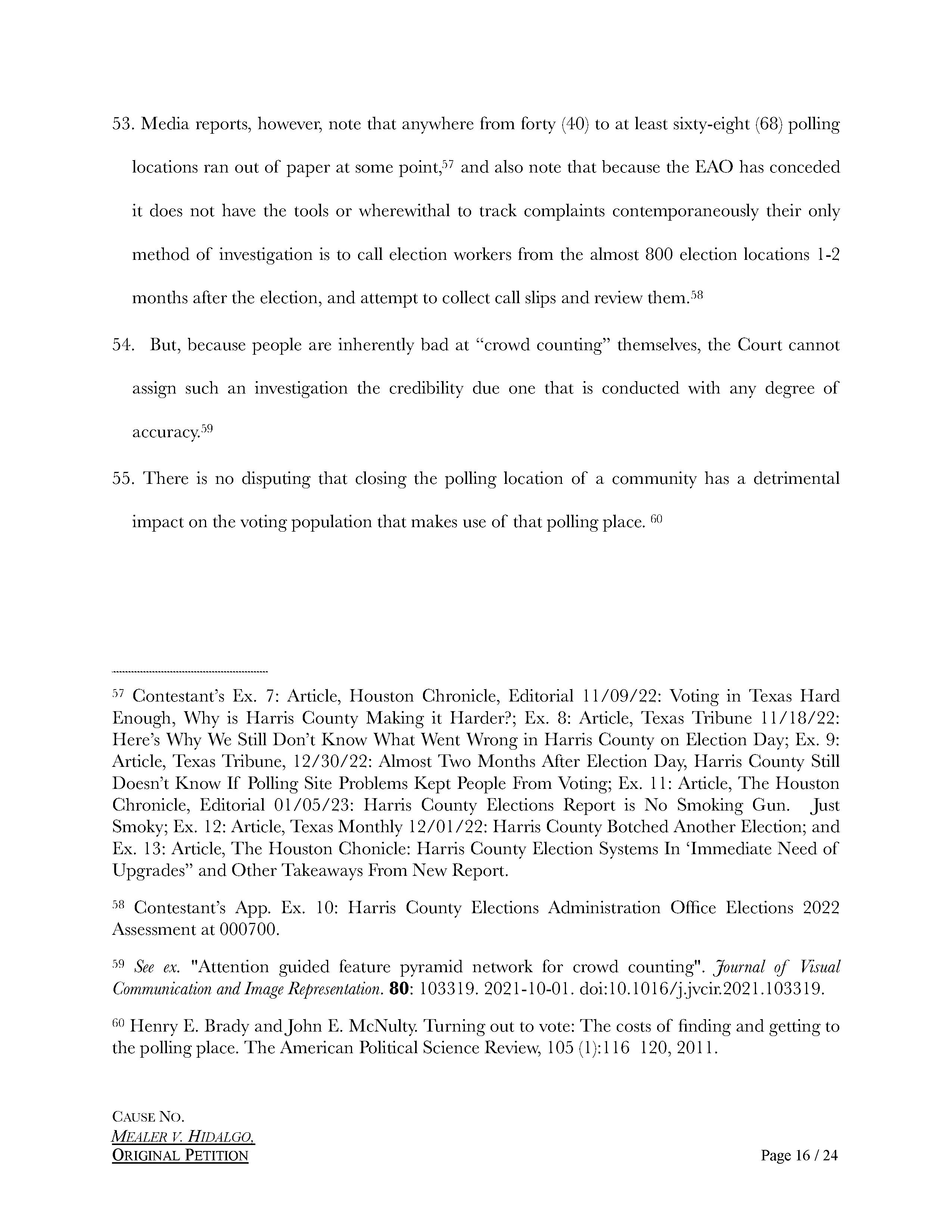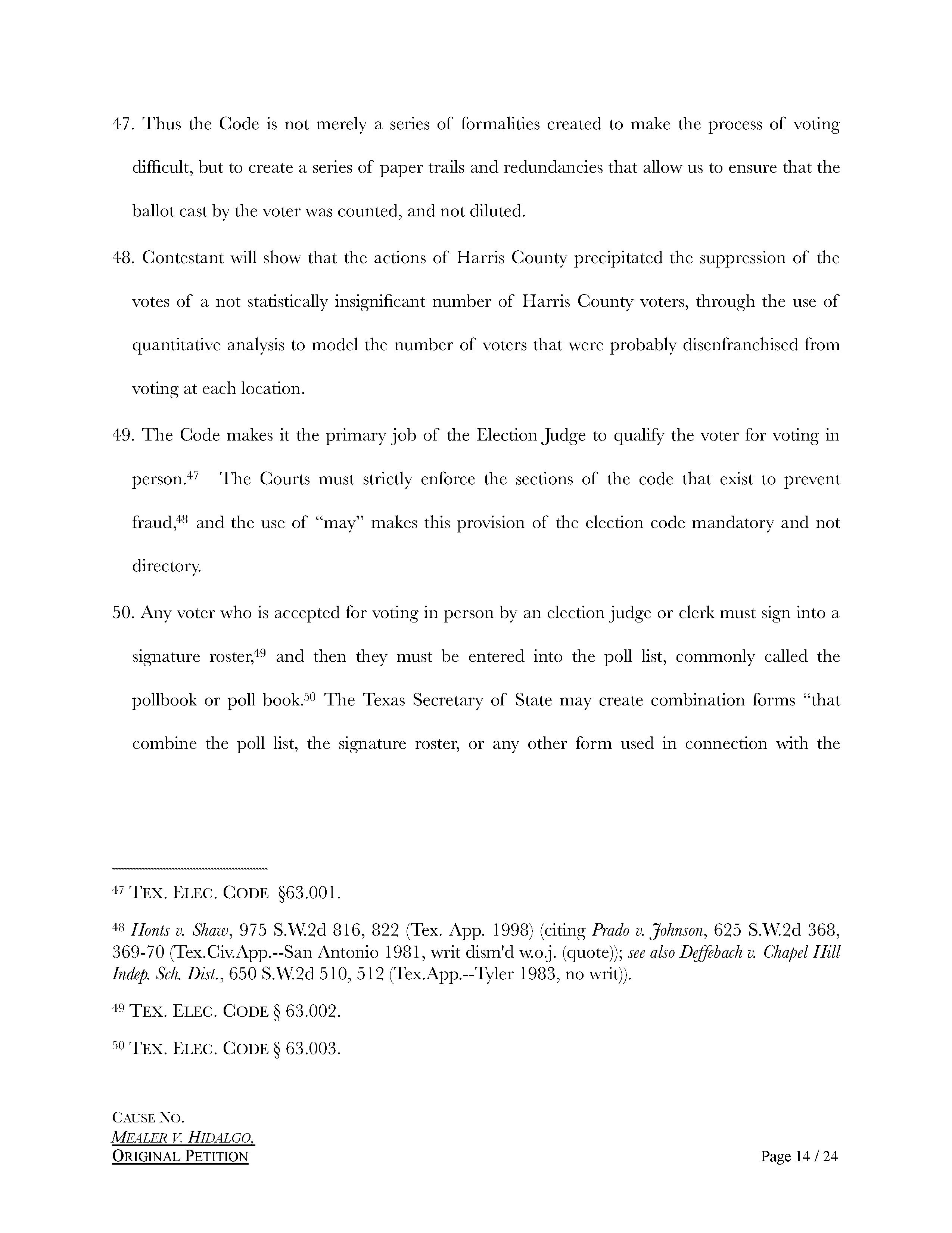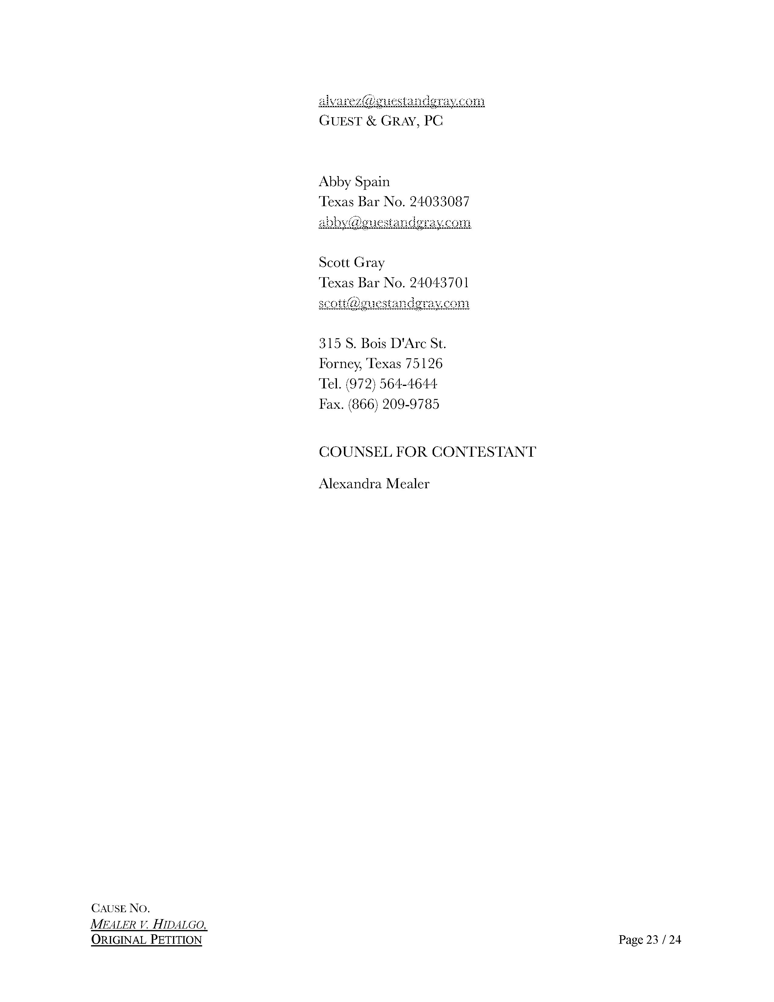 Alexandra del Moral Mealer’s lawsuit against Harris County Judge Lina Hidalgo was filed by on January 6, 2023, at 12:49 am., by Elizabeth D. Alvarez (Texas Bar No. 24071942), with Guest & Gray, P.C. out of Forney, Texas. Aubrey R. Taylor Communications is the publisher of the Houston Business Connections Newspaper. All Rights Reserved.