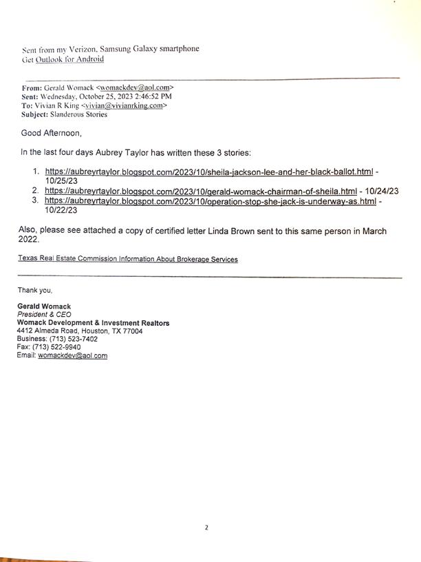 Gerald Womack sent Vivian King this personal email after he attacked Investigative Reporter Aubrey R. Taylor on Monday, October 23, 2023, to cover his tracks and have his friend and business associate, Vivian King, use her authority as the First Assistant District Attorney, to have Aubrey R. Taylor wrongfully indicted. Houston Business Connections Newspaper is published by Aubrey R. Taylor Communications. All Rights Reserved.