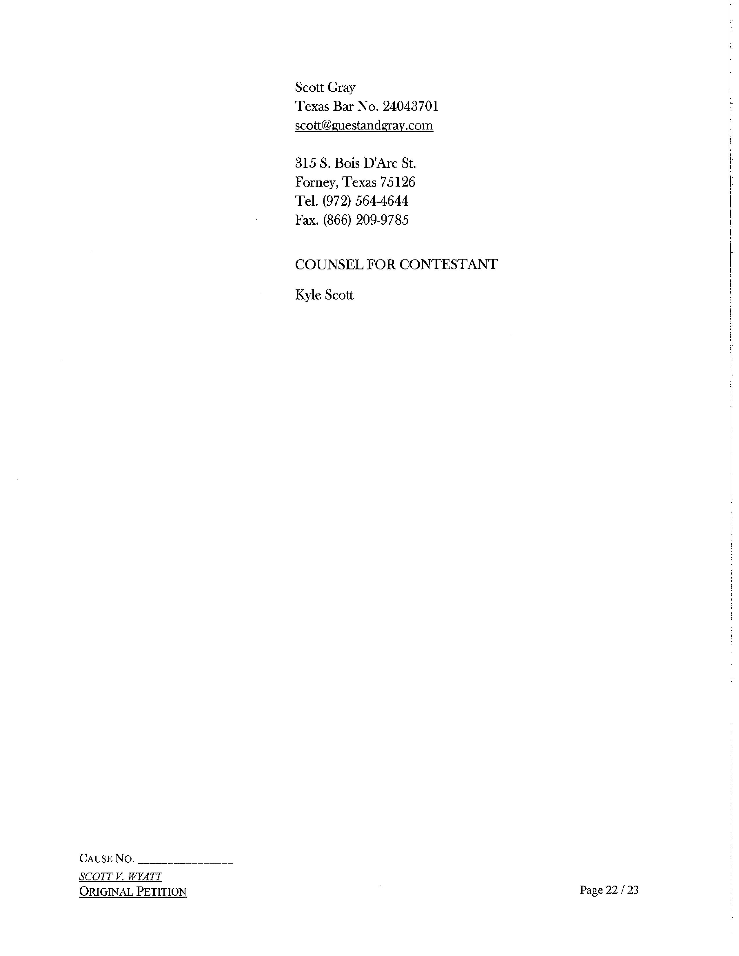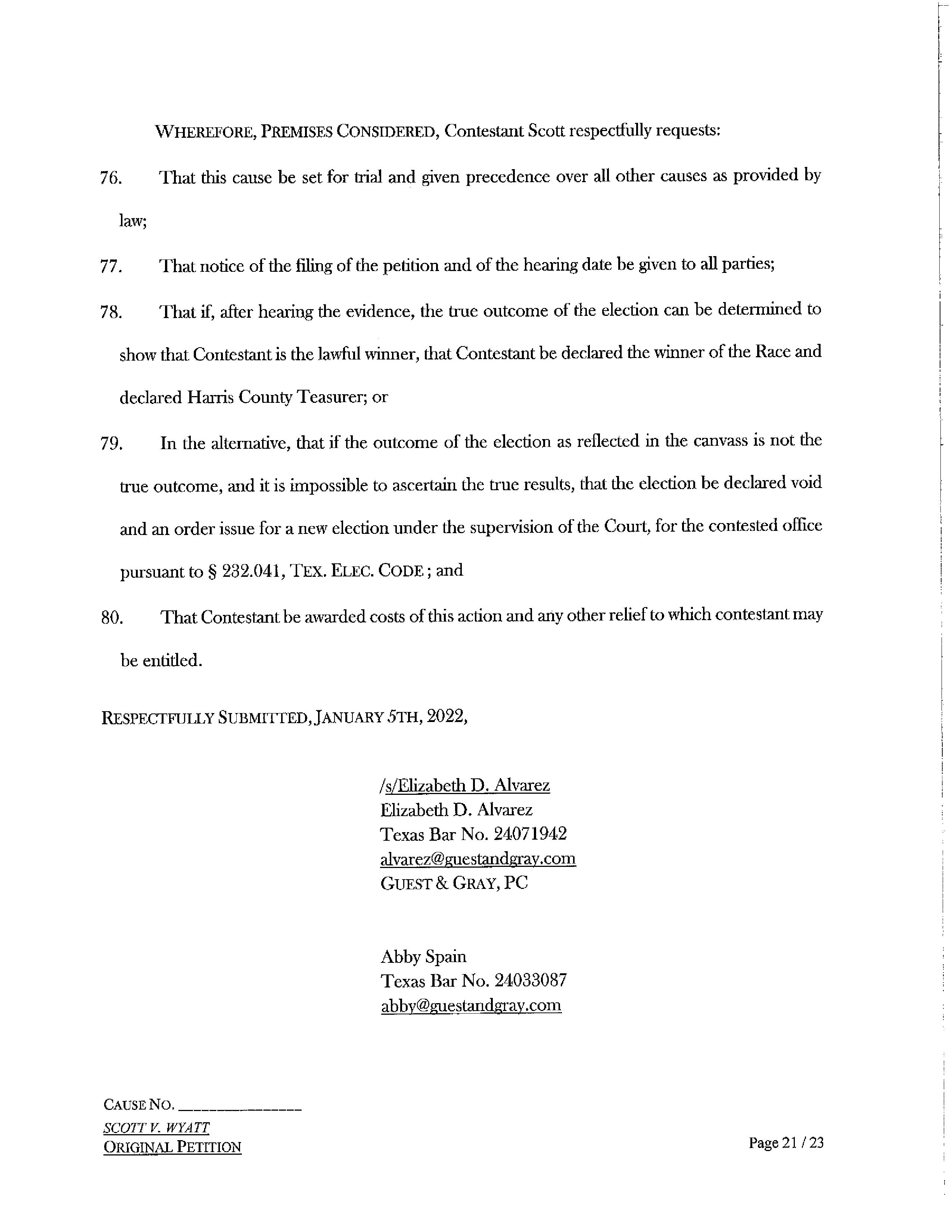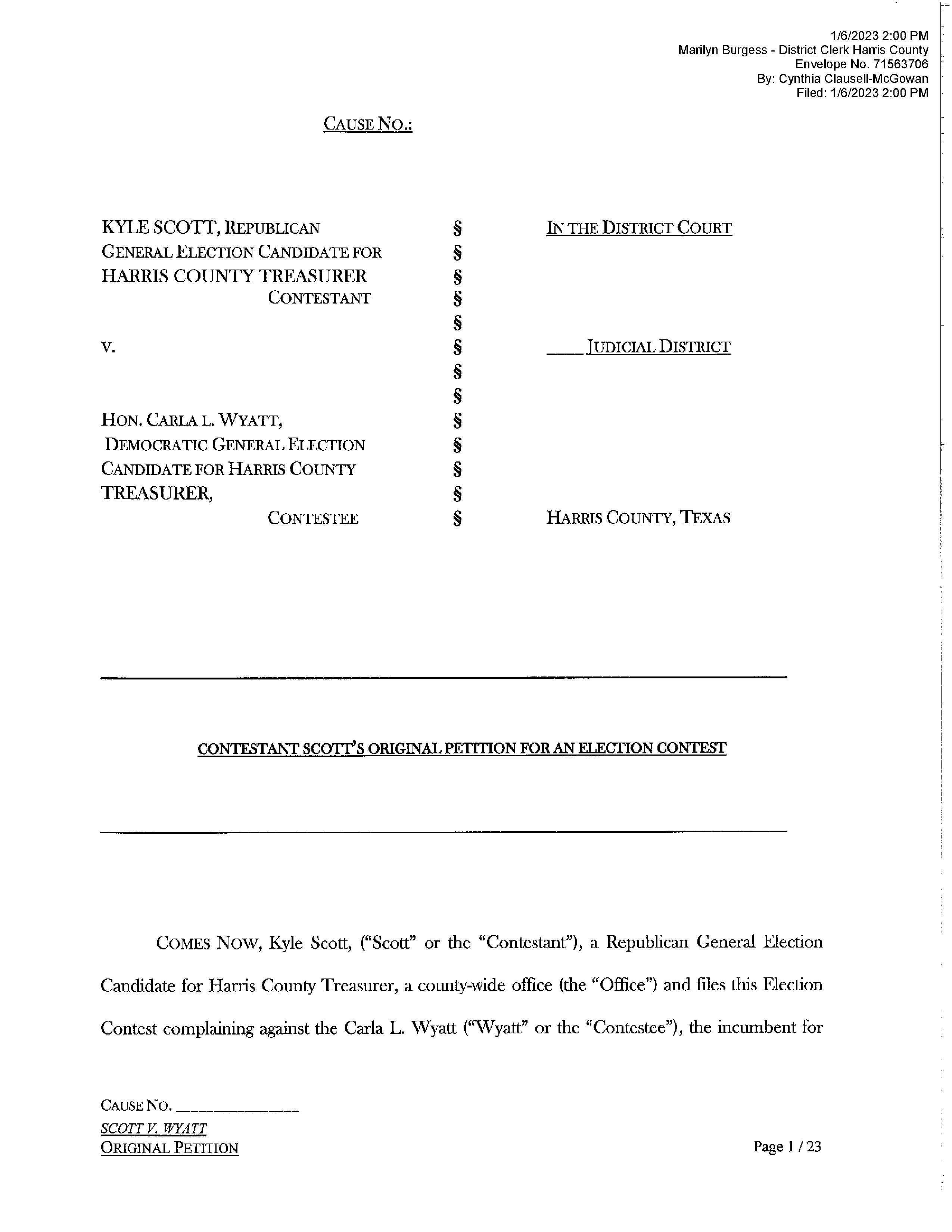 Kyle Scott’s lawsuit against newly elected Harris County Treasurer Carla L. Wyatt was filed on Friday, January 6, 2023, at 2:00 p.m., by Elizabeth D. Alvarez (Texas Bar No. 24071942), with Guest & Gray, P.C. out of Forney, Texas. Aubrey R. Taylor Communications is the publisher of the Houston Business Connections Newspaper. All Right Reserved.