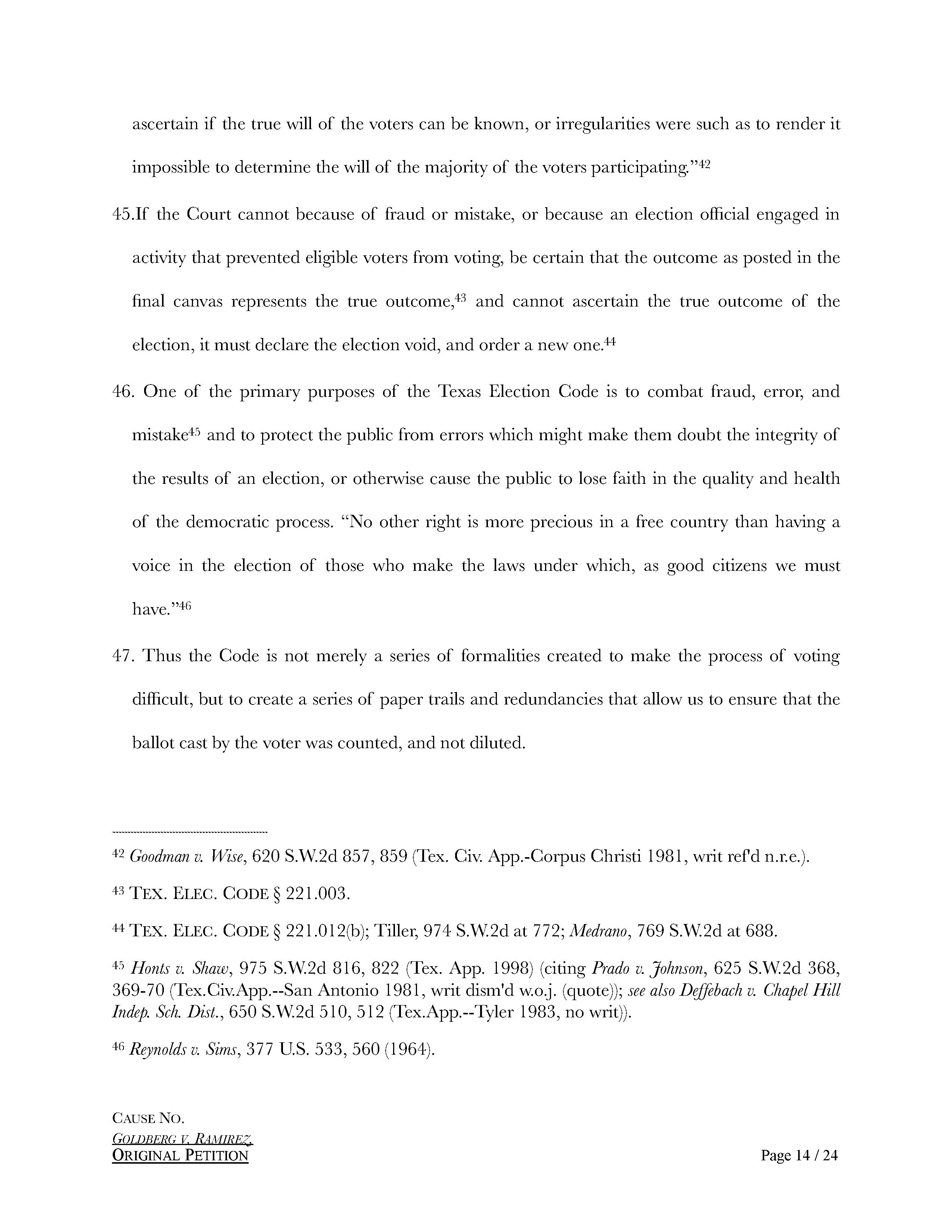 Mark Goldberg’s lawsuit against newly elected Judge Erika Ramirez was filed on Friday, January 6, 2023, at 3:22 p.m., by Elizabeth D. Alvarez (Texas Bar No. 24071942), with Guest & Gray, P.C. out of Forney, Texas. Aubrey R. Taylor Communications is the publisher of the Houston Business Connections Newspaper. All Rights Reserved.