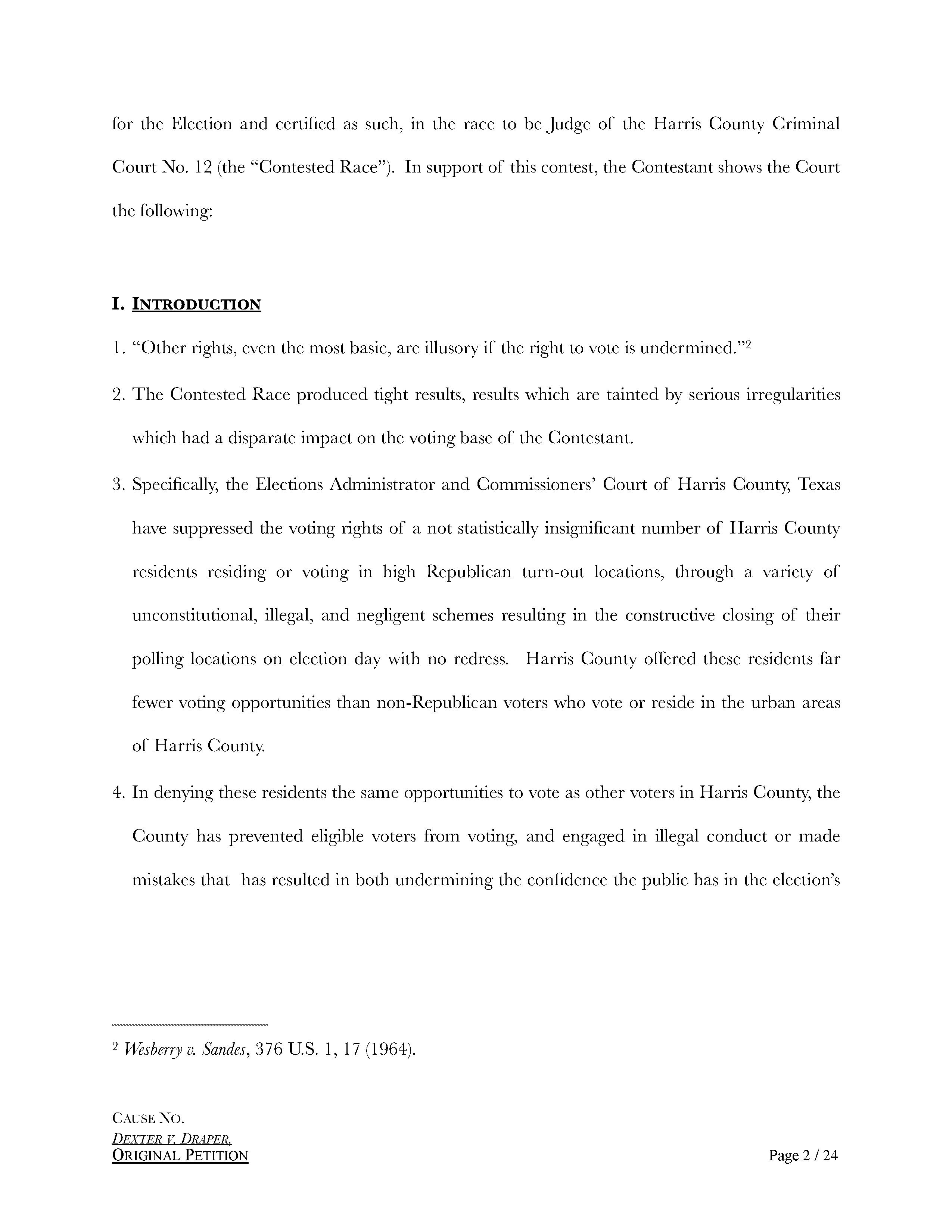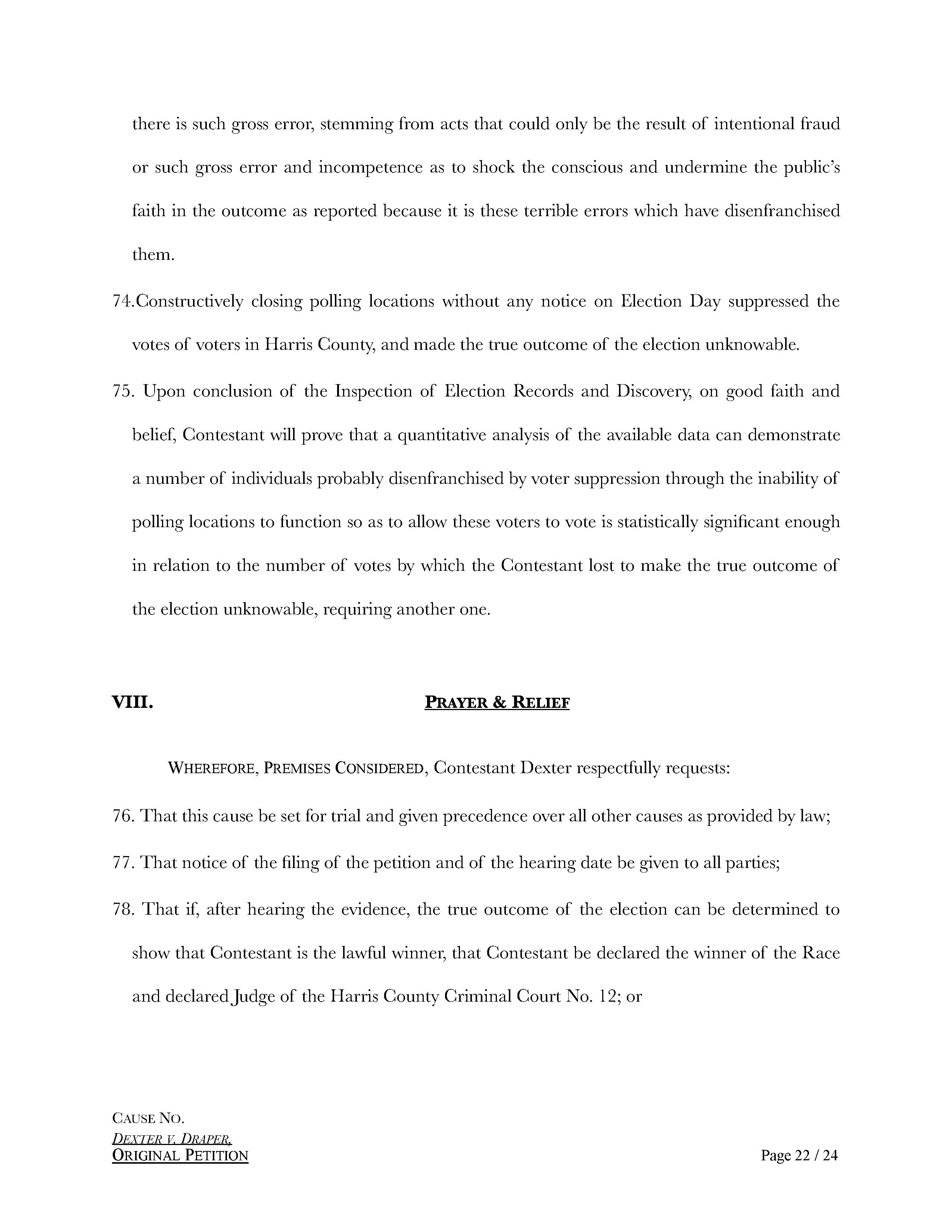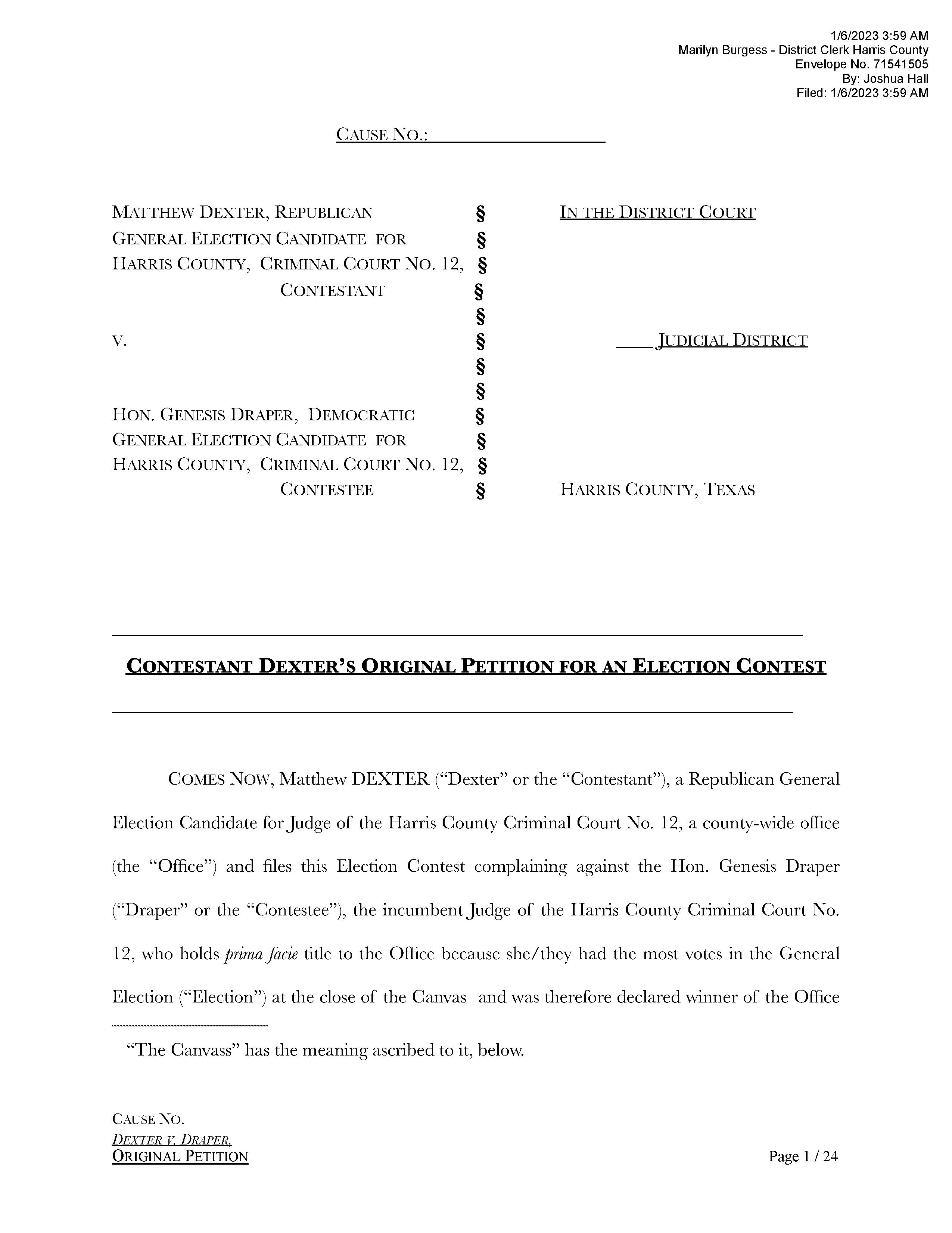 Matthew Dexter, a Republican, ran against Judge Genesis Draper, in the race for Judge, County Criminal Court at Law No. 12, and lost, back on Tuesday, November 8, 2022, in Harris County, Texas. Now, Matthew Dexter is suing Judge Genesis Draper to overturn the results of the race for Harris County Criminal Court at Law No. 12. A Republican judge by the name of Judge David Peeples, is the visiting judge who is overseeing this election challenge. Houston Business Connections Newspaper is published by Aubrey R. Taylor Communications. All Rights Reserved.