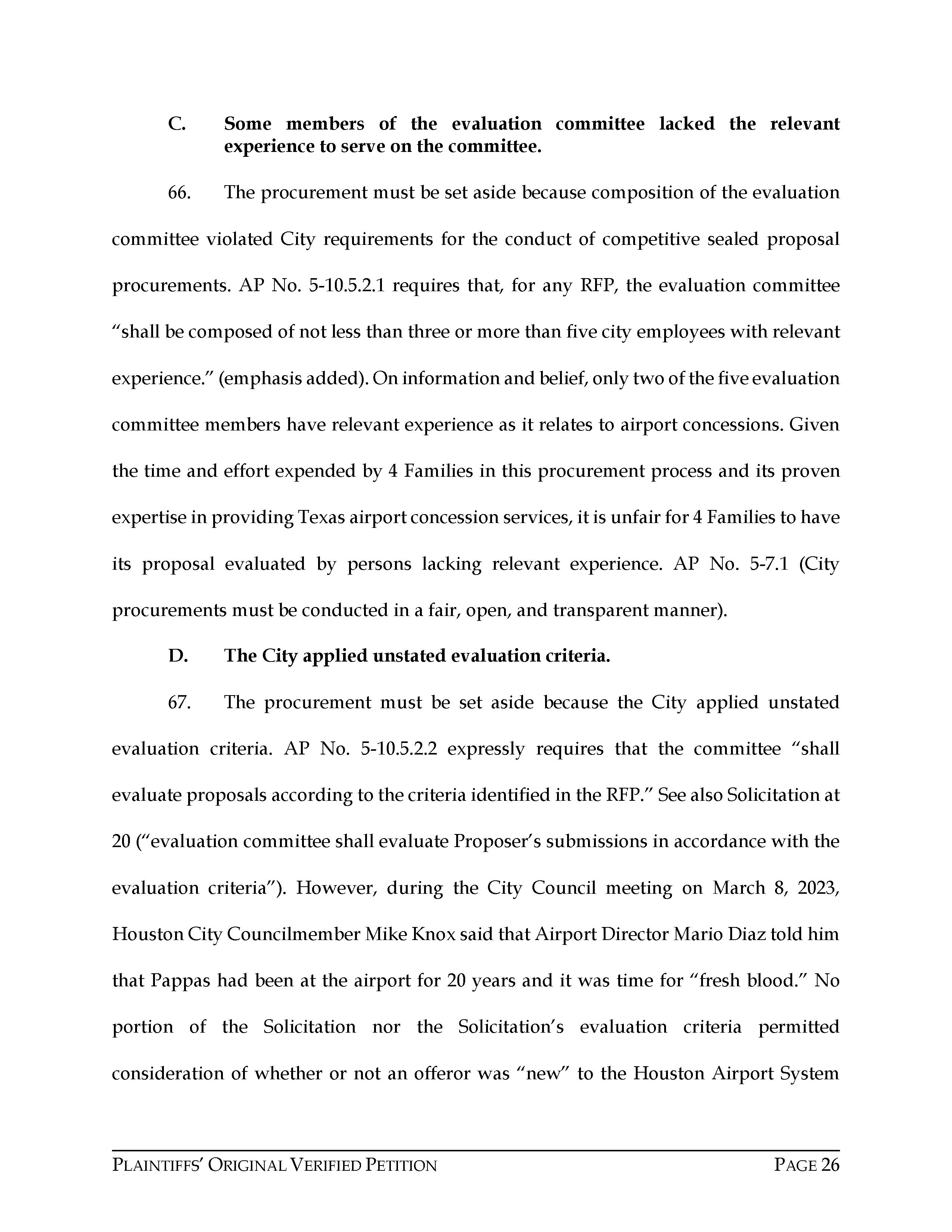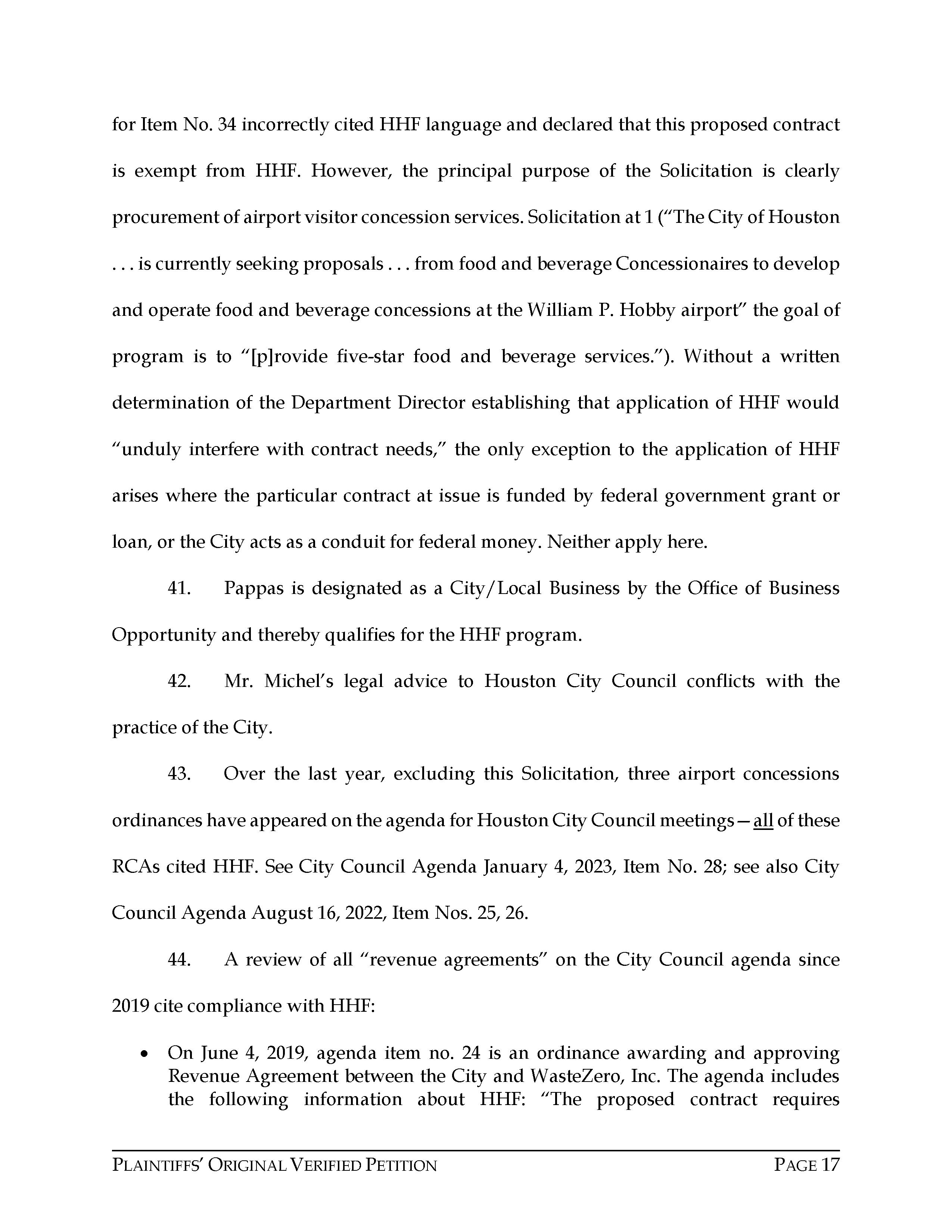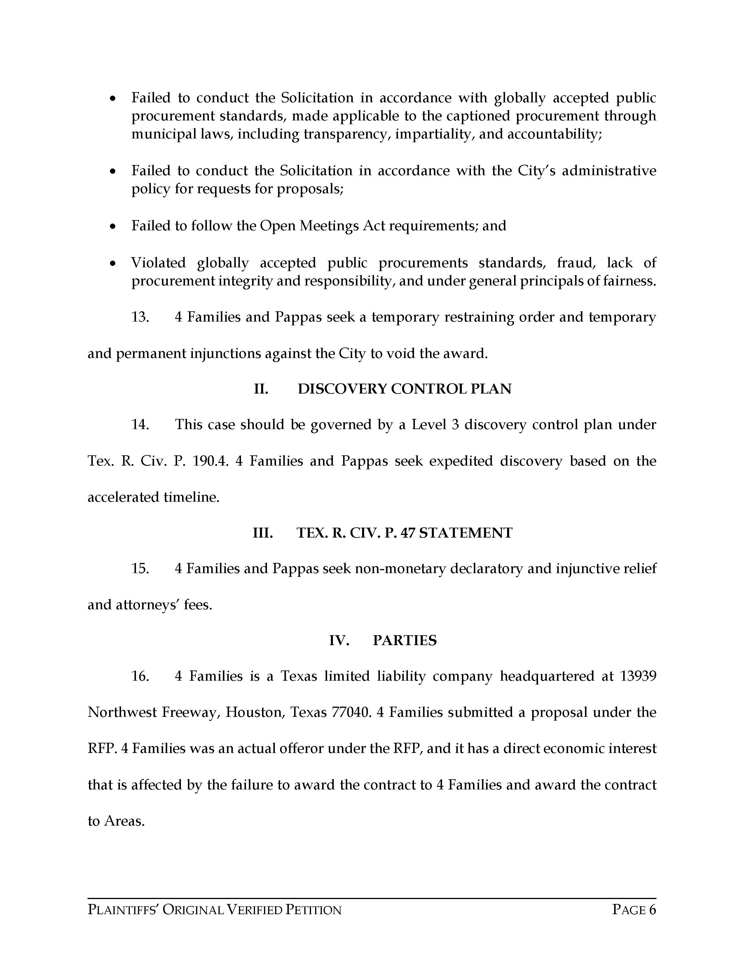Attorney Rachel Hooper filed this lawsuit against the City of Houston, Texas, and Areas HOV JV, LLC, on behalf of Chris Pappas, 4 Families of Hobby, LLC, and Pappas Restaurants, Inc., on April 11, 2023. The case number is 2023-23872 for this lawsuit. Aubrey R. Taylor Communications is the publisher of the Houston Business Connections Newspaper. All Rights Reserved.