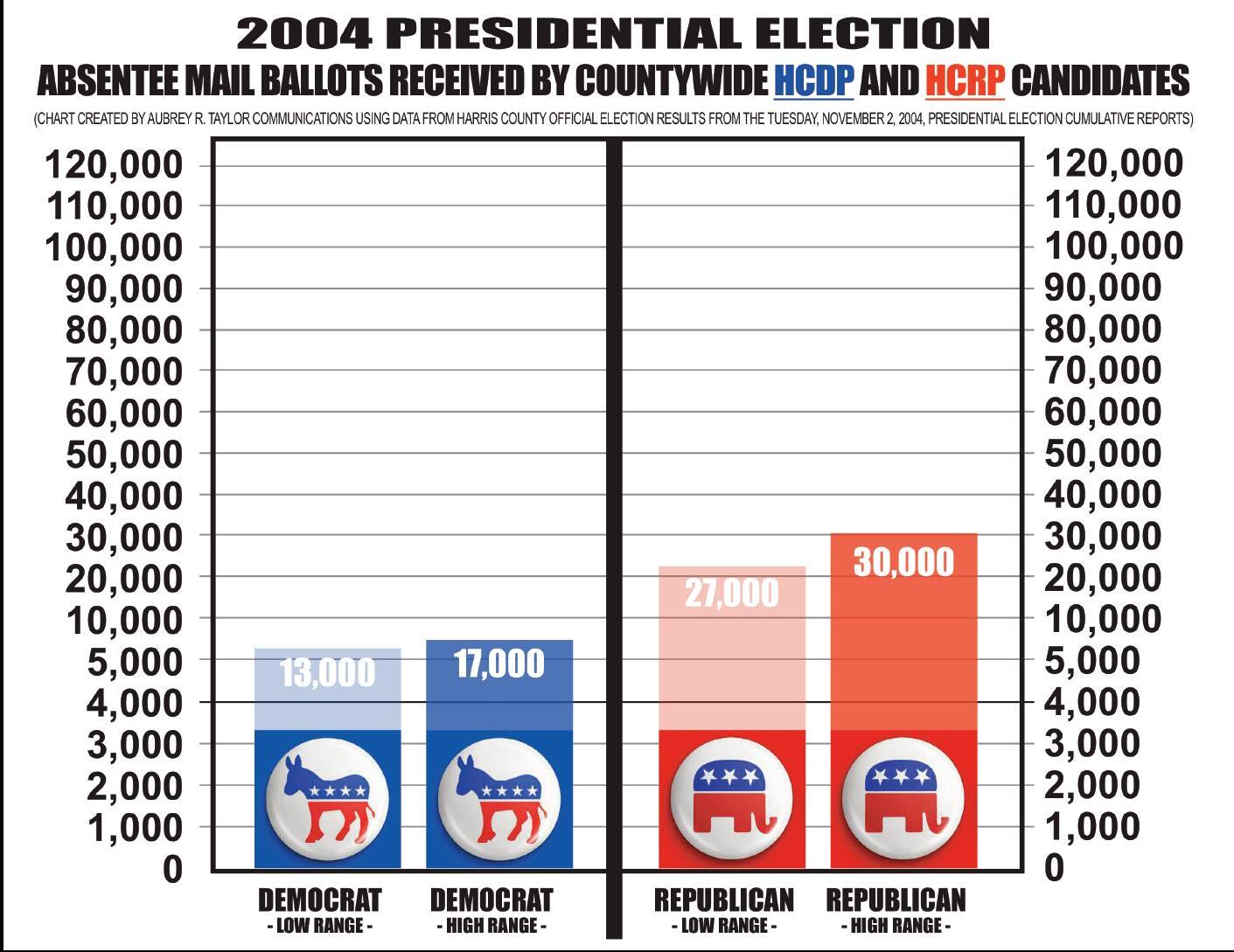 ABSENTEE MAIL BALLOT TOTALS: Back during the Tuesday November 4 2008 Presidential Election the ABSENTEE MAIL BALLOT RANGE” for Democrats was 18 000 on the low end and 24,000 on the high end Comparatively speaking, the “ABSENTEE MAIL BALLOT RANGE” fo Republicans running countywide was 37,000 on the low end, and 41,000 on the high end