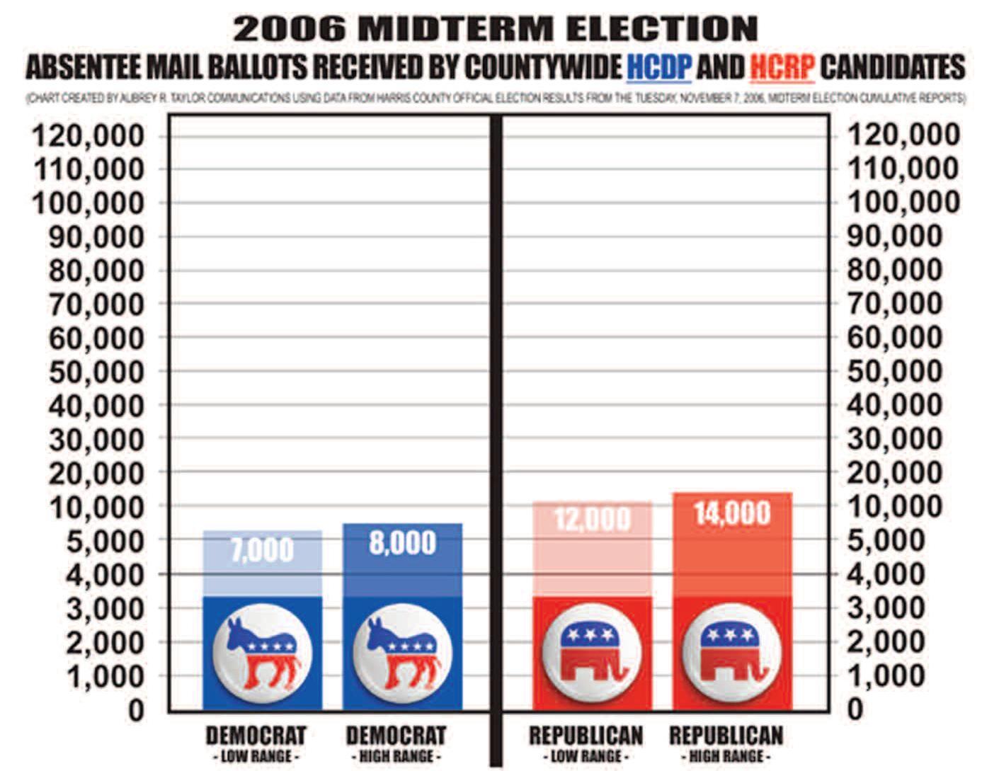 ABSENTEE MAIL BALLOT TOTALS: Back during the Tuesday November 2 2010 Midterm Election the ABSENTEE MAIL BALLOT RANGE” for Democrats was 16 000 on the low end and 22,000 on the high end Comparatively speaking, the “ABSENTEE MAIL BALLOT RANGE” fo Republicans running countywide was 32,000 on the low end, and 38,000 on the high end