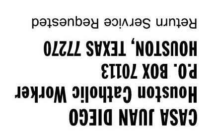 Casa Juan Diego was founded in 1980, following the Catholic Worker model of Dorothy Day and Peter Maurin, to serve immigrants and refugees and the poor. From one small house it has grown to ten houses. Casa Juan Diego publishes a newspaper, the Houston Catholic Worker, four times a year to share the values of the Catholic Worker movement and the stories of the immigrants and refugees uprooted by the realities of the global economy.