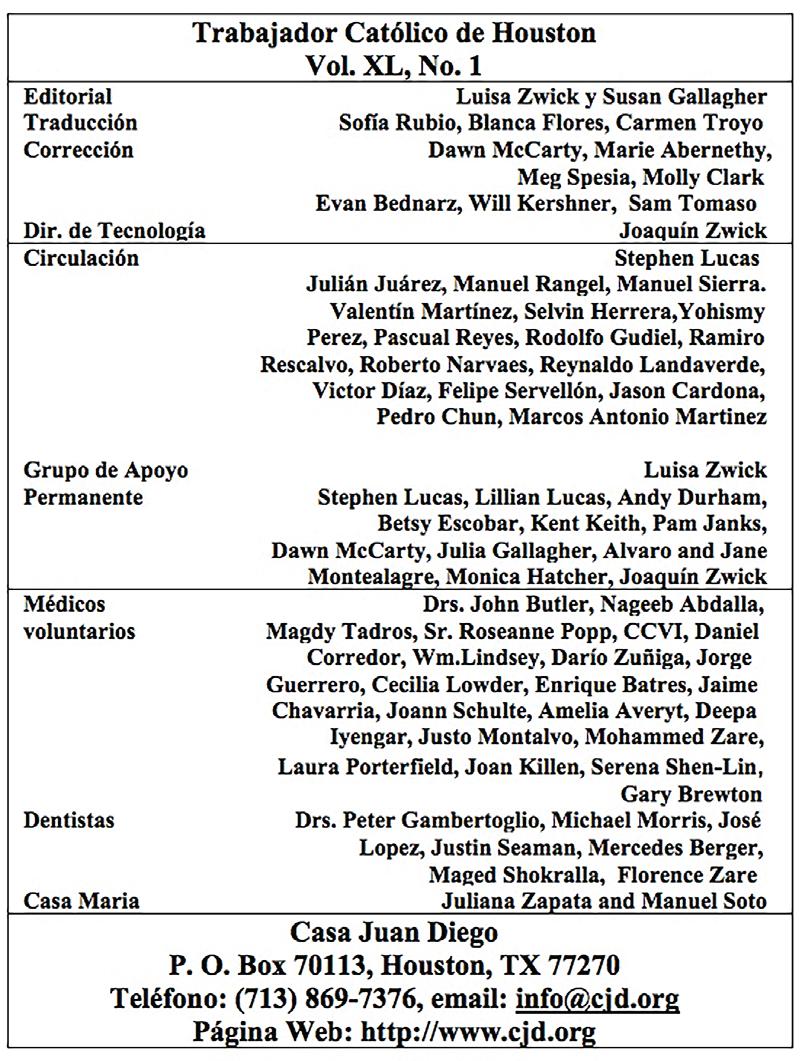 Estamos, muy agradecidos con las personas tan generosas que apoyan a Casa Juan Diego y al periódico del Trabajador Católico de Houston. Además estamos agradecidos con las muchas personas quienes hablan de “nuestro trabajo como el suyo- las que hablan con belleza de “sus” esfuerzos en “su propia” Casa Juan Diego. Ellos se han dado cuenta de que la revolución del corazón, de que vivir el Evangelio es la manera de cambiar el orden social.