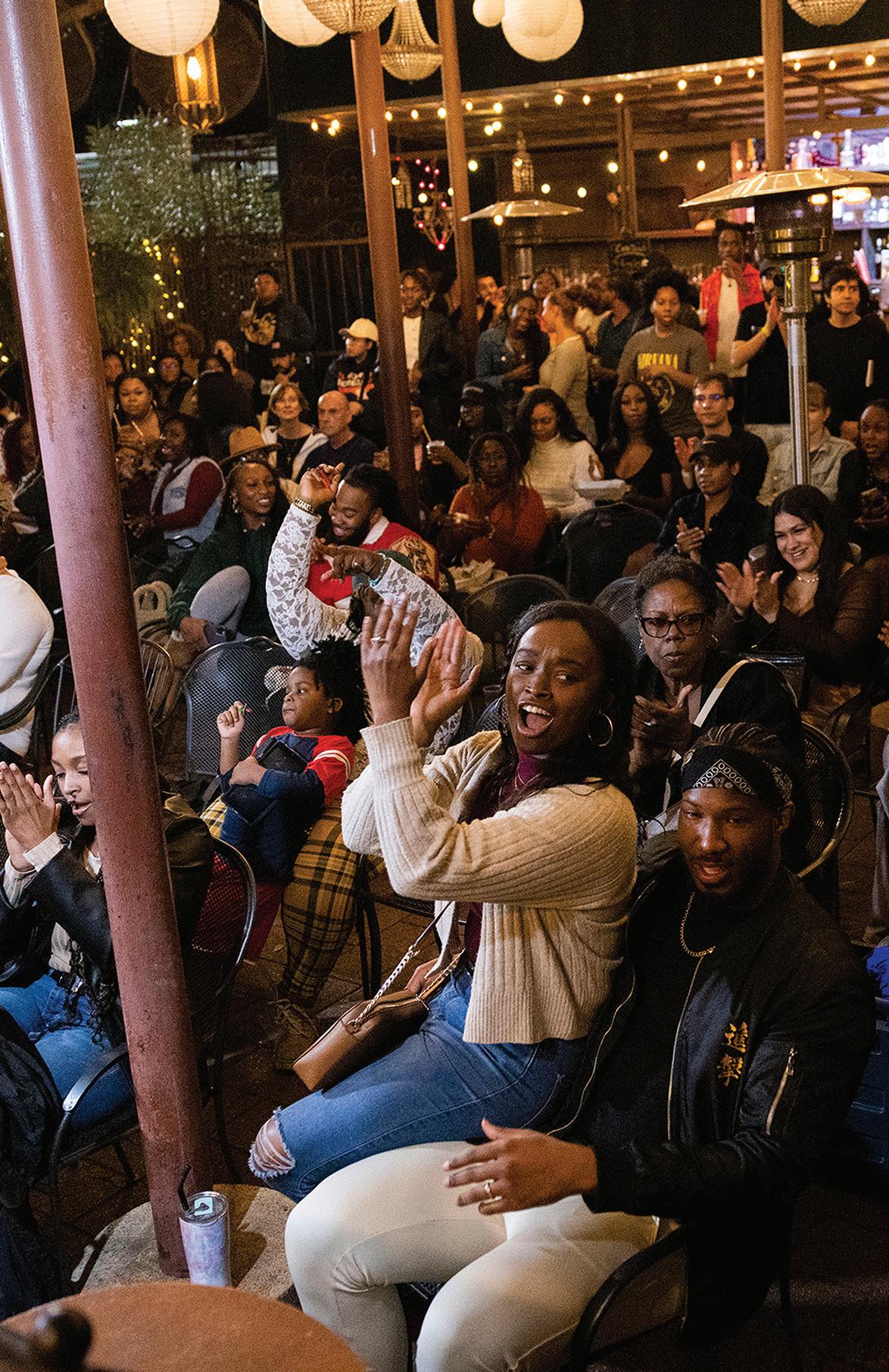 The poetry community welcomes Sherrika Mitchell to the stage at an open mic event organized by Write About Now. (Marie D. De Jesús/Houston Landing)