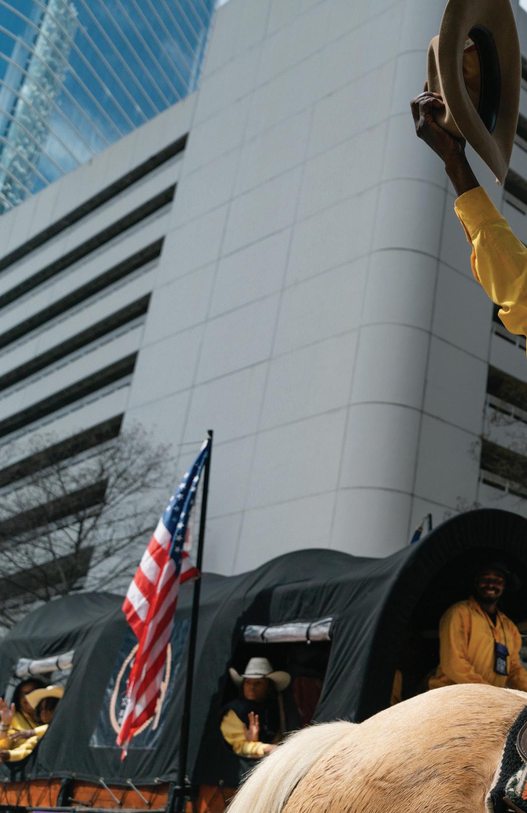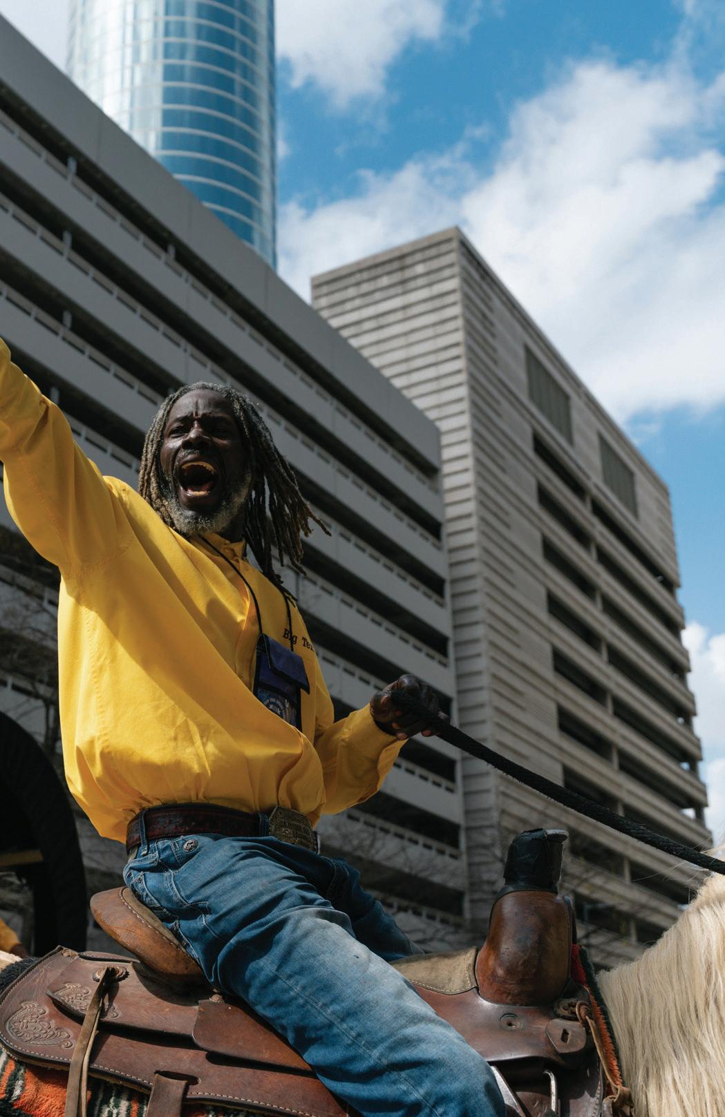 A member of the Prairie View Trail Ride cheers on his horse in the Houston rodeo parade. (Joseph Bui / Houston Landing)