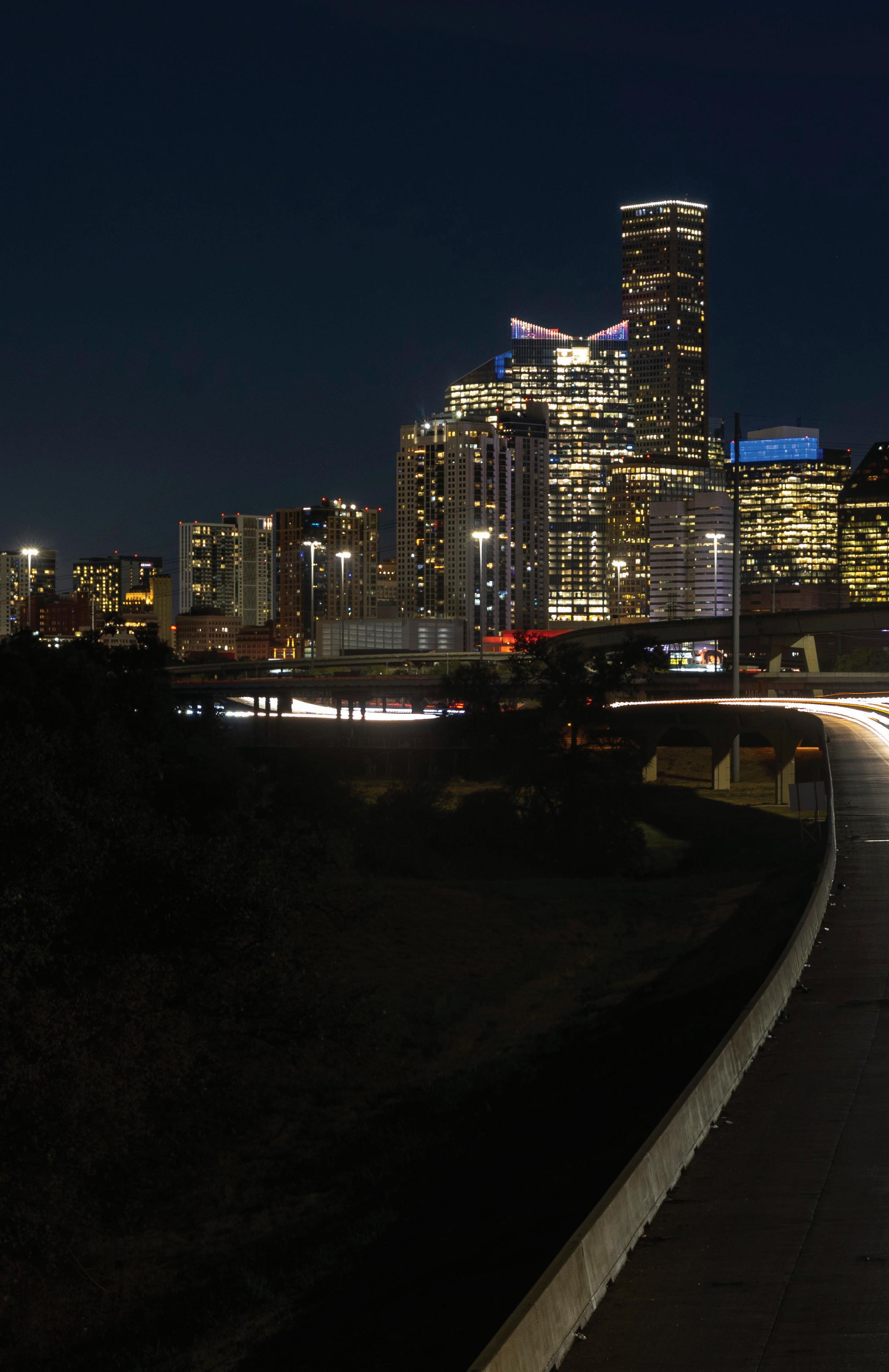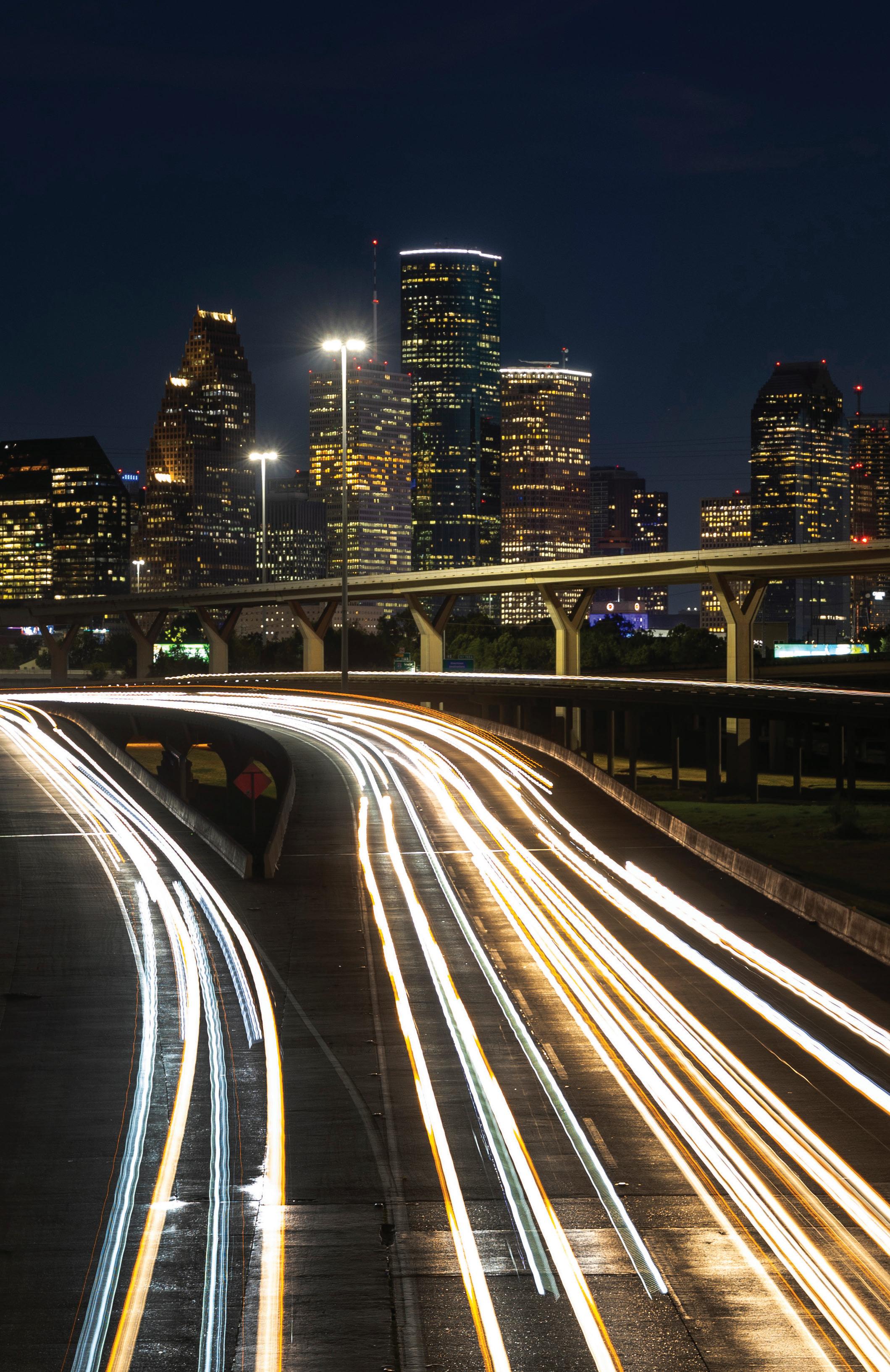 Cars leave streaks of light traveling north down Interstate 45 from downtown.