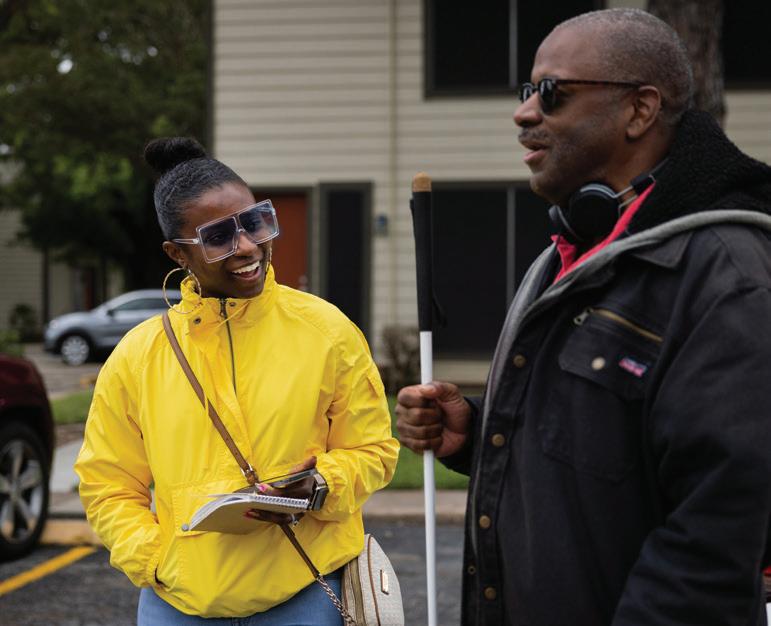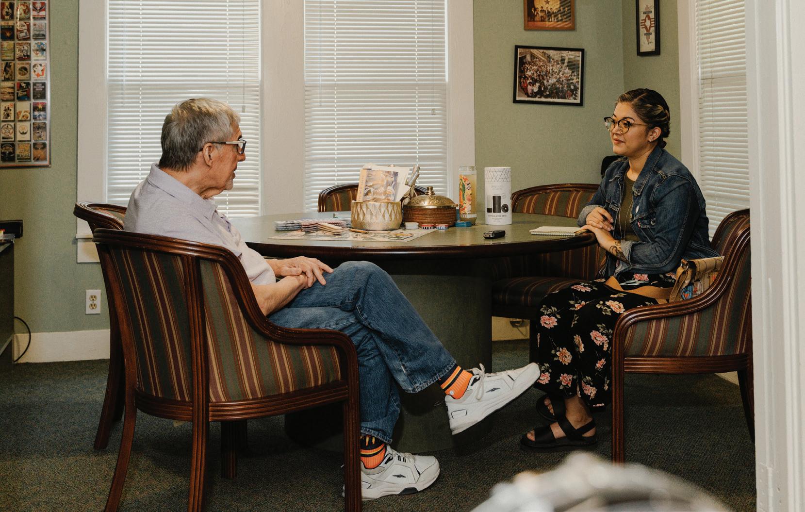 Monique Welch, diverse communities reporter, interviews George Battiste. (Marie D. De Jesús / Houston Landing)