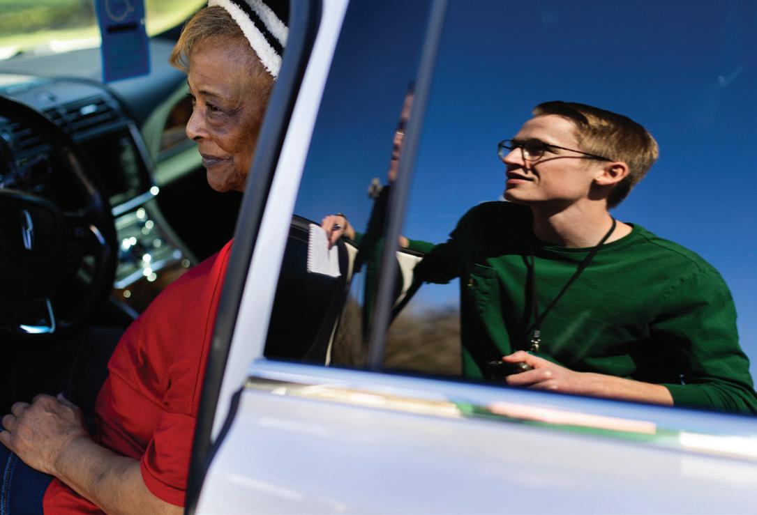 Paul Cobler, political reporter, talks to Houston resident Nelida Eaton, 75, while reporting for a story. (Marie D. De Jesús / Houston Landing)
