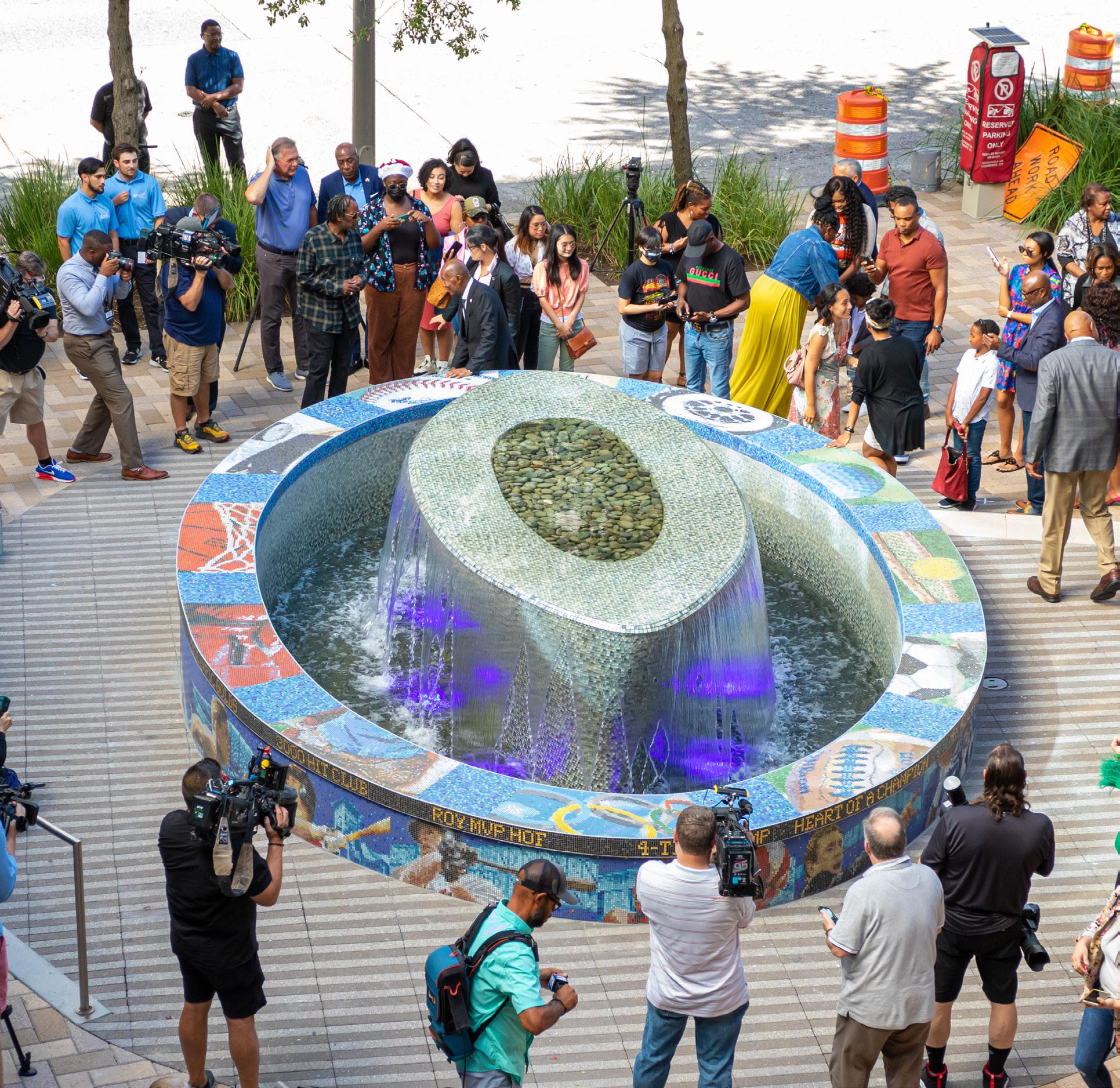 of Fame artist Opie Otterstad, was inspired by the Houston sports community. It features 13 Hall of Famers as well as some iconic Houston sports moments. This fountain will be a focal point for the Houston Sports Walk of Fame and is part of the continued efforts to build the Hall of Fame brand on GreenStreet.