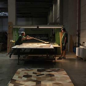 ELLEN: “Nadat Irma’s team het fineer gesor teerd heeft, worden de aangeduide fouten eruit gesneden door de productieoperatoren van de kapafdeling. Zij snijden de stroken ook mooi recht af. Die rechte delen plakken ze vervolgens aan elkaar tot je een groot, dun vel fineer krijgt van gemiddeld 0,6mm dik. In de persafdeling plakken andere operatoren het fineer op een plaat. Soms gaat het daarna rechtstreeks naar de nabewerking om te verzagen of te schuren. Andere klanten vragen nog een afwerking met vernis. In al die afdelingen werken productieoperatoren. De job is dus heel afwisselend. Bovendien is het belangrijk dat de operatoren goed weten wat elke schakel in de machinestraat doet. Daarom laten we hen langsgaan bij de andere afdelingen.”