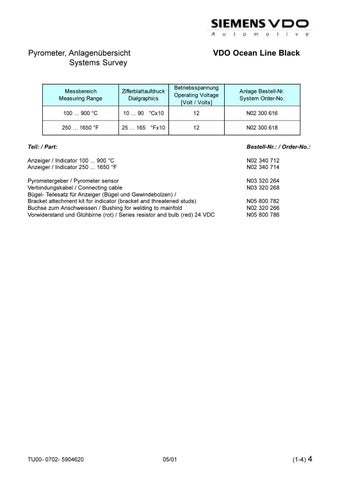 Pyrometergeber / Pyrometer sensor Verbindungskabel / Connecting cable Bügel- Teilesatz für Anzeiger (Bügel und Gewindebolzen) / Bracket attechment kit for indicator (bracket and threatened studs) Buchse zum Anschweissen / Bushing for welding to mainfold Vorwiderstand und Glühbirne (rot) / Series resistor and bulb (red) 24 VDC