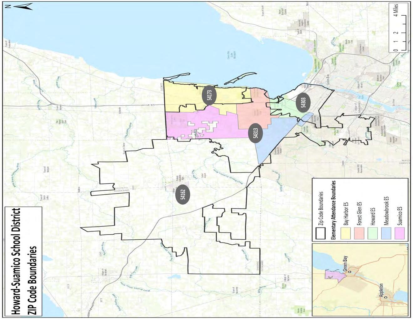 TheHoward-SuamicoSchoolDistrictislocatedinBrownCounty,WisconsinItservespartsorallofthe followinglocalities:GreenBayCity,Howardvillage,andSuamicovillage.Thedataonthefollowingpagesis aggregatedandcolor-coordinatedbytheboundariesshowninthemaponthefollowingpage