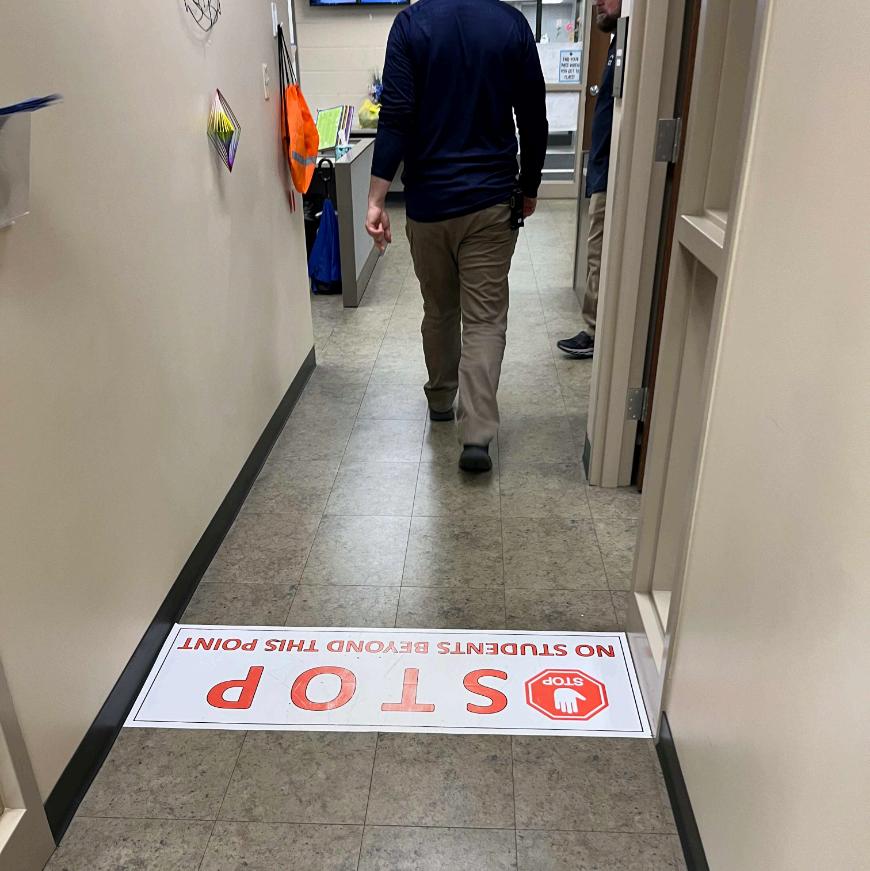 and are allowed to enter the first set of vestibule doors. Inner doors locked, office locked. Buzzed into office. Once in the office, there are no secondary means of control to restrict a person access to the school. (office door, principal's office door, back door)