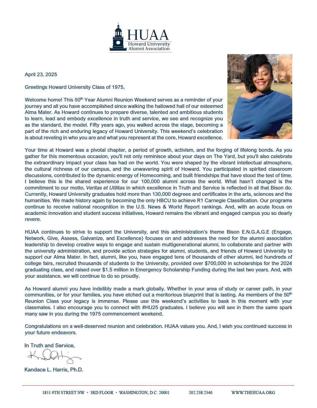 It is a privilege and an honor to welcome you back to your alma mater for this exceptional occasion. As Director of Alumni Relations, I am thrilled to extend my heartfelt gratitude for your unwavering support and engagement throughout the years. Your dedication to Howard University and your fellow alumni has truly been exemplary, and we are immensely proud of your achievements.