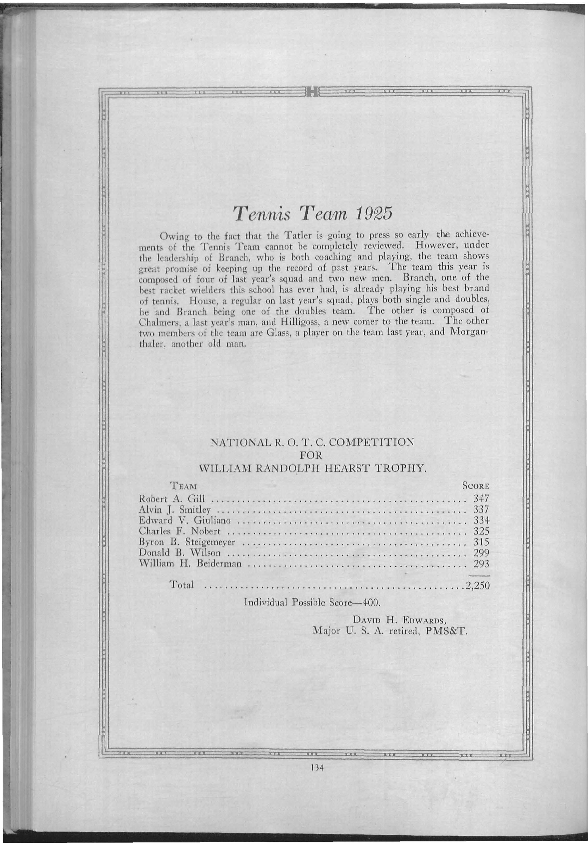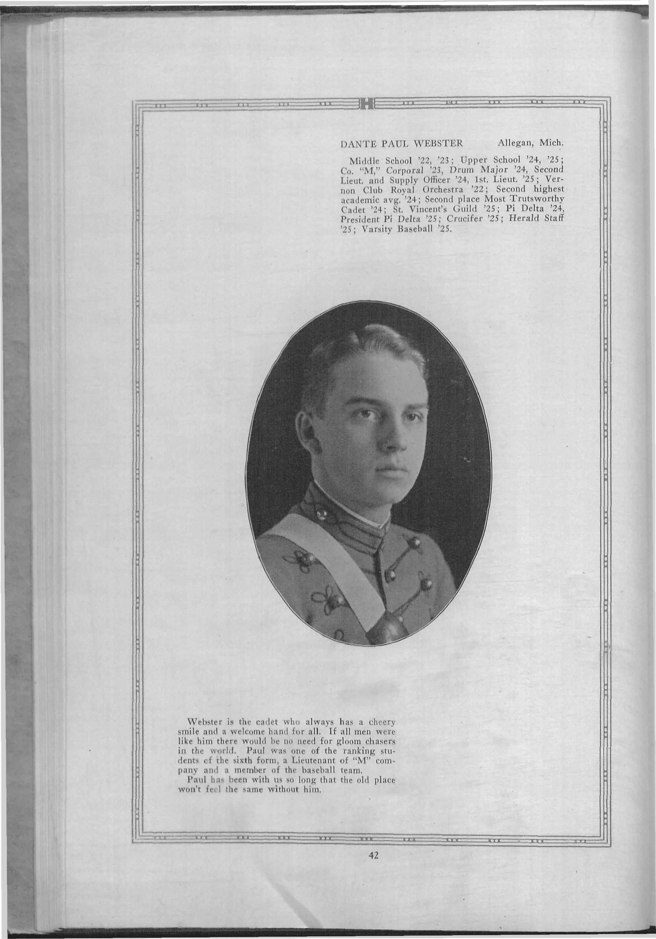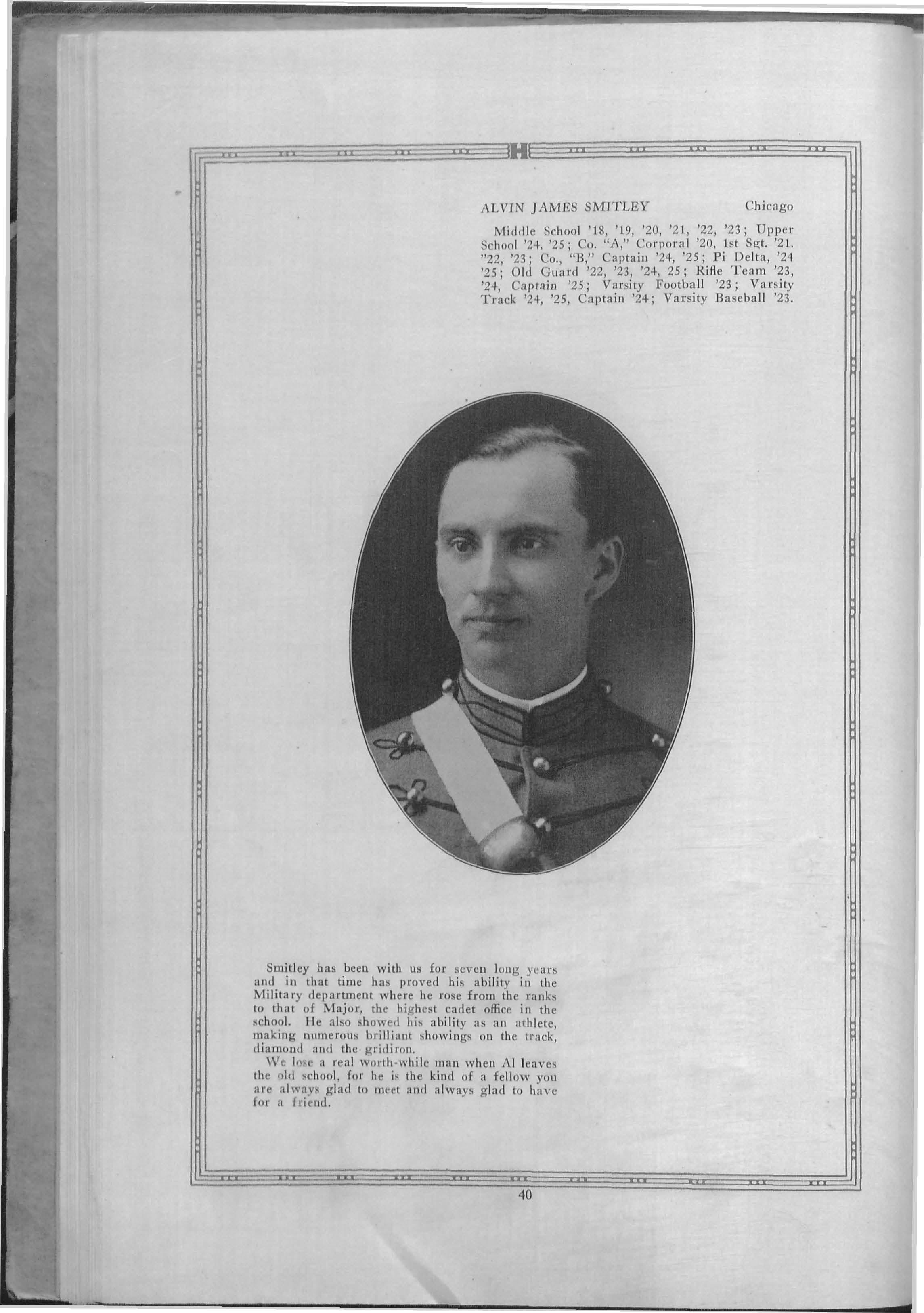 Middle Schoo l '22, ' 23; Upper Schoo l '2+, '25; Company "M," '22, '23, '24-, '25; Sergeant '23, '2+; Captain 'ZS; President of The Senior C la ss; Editor- in -Chief of T h e Ta tier; Pi Delta 'N,'25 ; A lph a Delta Tau H onorary Fraternity, Secretary '2S; Old Guard '25; Most Trustwort h y Cadet '22, '23; Best Drilled Cn d et '24; Vars ity l:lasketbn ll '22, '23, '25; Yan,i ty Ba,ball '23, '24; Varsity Track '22, '23; vVinner Oratorica l ontest '24; Pi Delta D eb ating 'l' enrn '2S; Stude nt Co un ci l ' 25; Dram a ti c C lub '23.