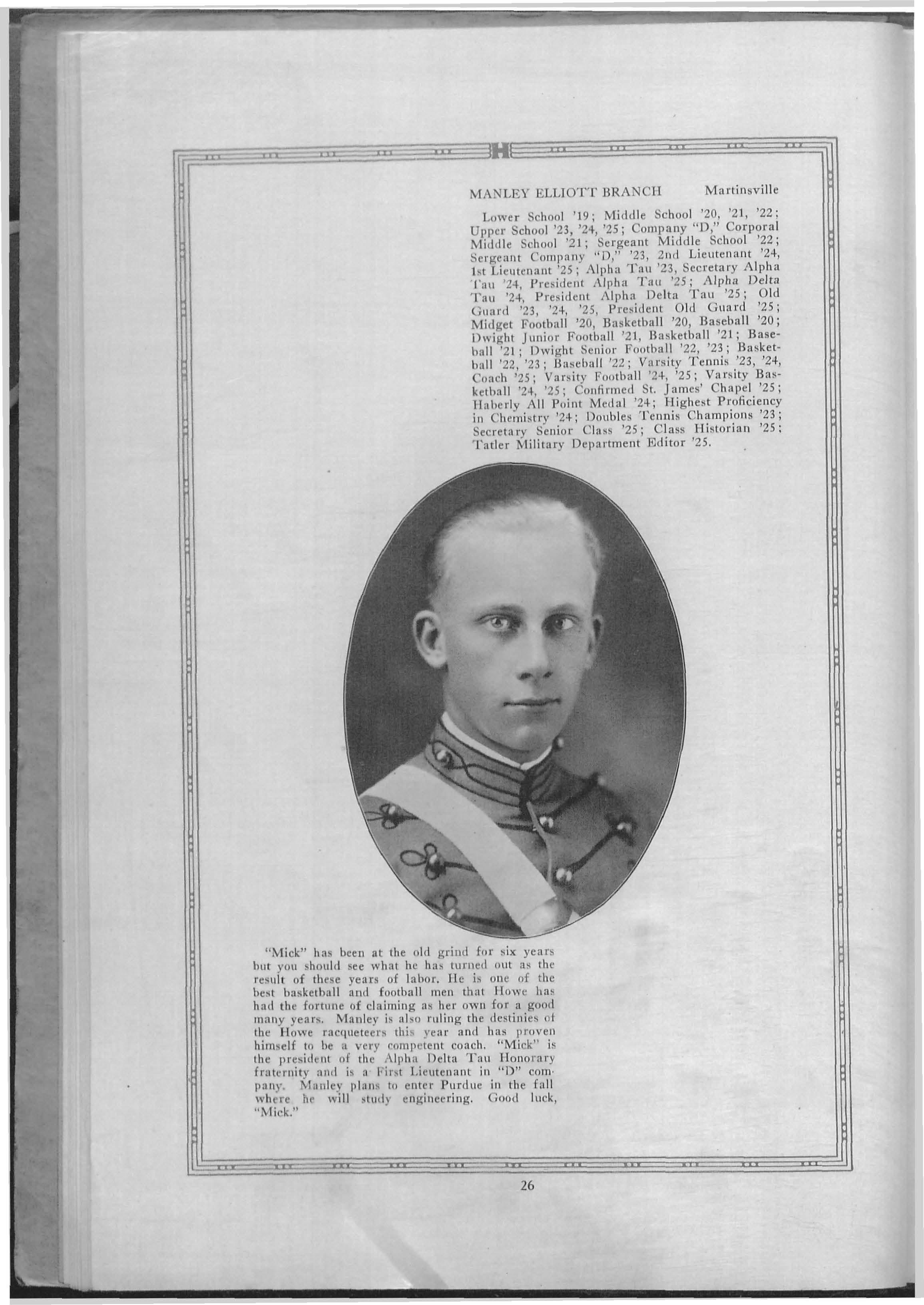 Lower School ' 19; Middle School '20, '2 1, '22 ; Upper School '23, '24, '25; Company "D," Corpora l Middle Schoo l '2 1; Sergeant Miclcl l e School '22; Scqzeant Company ''l)," '23, 2 nd Lieutenant '24, ht Lieutenant '25; A lph a Tau '23, Secretary A lpha f'au ' 2+, President Alphn Tau '25 ; Alp h a Delta Tau '2+, President A lph a Delta Tau '25; Old G u ard '23, '2+, '25, President O ld G uard '25; Midget Footba ll '20, Basketball '20, Baseball '20; Dwight junior Foo tb all '2 1, Basketball '21; Baseba ll '2 1 ; Dwight Se ni or Football '22, '23; Baskethall '22, '23; Basebal l '22; Vnrsity Tennis '23, '2+, Conch '25; Vars it y P'ootball '2+, '25; Varsity Basketball '2+, '25; Confirmed St. James' C hap el '25; llaberly A ll Point Medal '2 +; Highest Proficiency in C h em i st r y '2+; Doubl es Tennis C hampion s '23; Secretary Senior C lass '25 ; C l ass Historian '25: Tatler Military Department Editor '25.