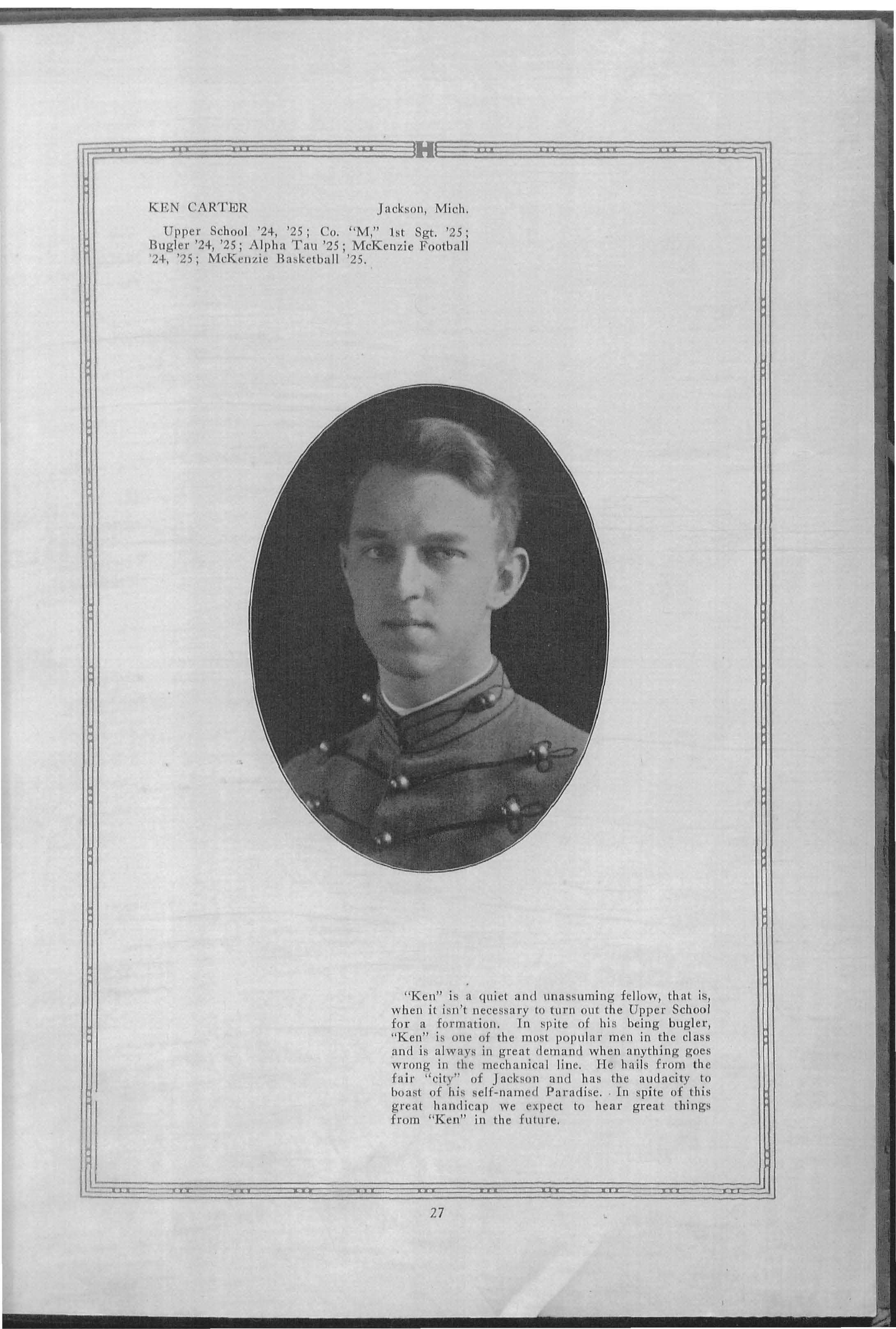 "Ke n" i s a quiet and unassuming fellow, that is, when it isn't necessary to turn out the Upper School for a formation. In sp ite of hi s be i ng bugler , "Ken" is one of the most p o pular men in t h e class and i s always in great demantl when anyt hin g goes wrong in the mechanical lin e. H e hail s from th e fair "ci ty" of Ja ckson a nd ha s the audacity to boast of his se lf-nam ed Paradise In s pite of this great handi cap we expect to h ear great things from "Ken" in the future.