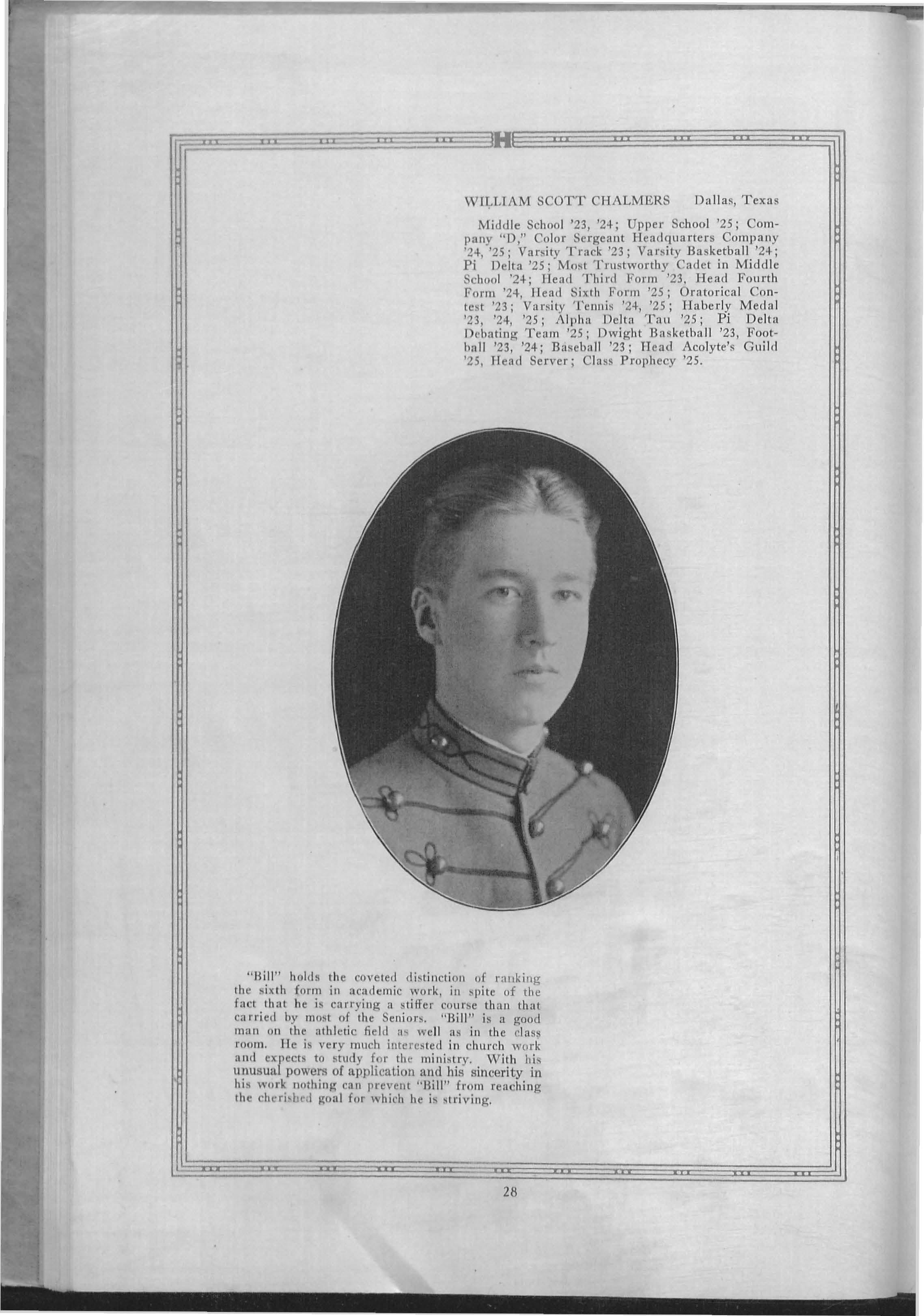 Midd le School '23, '2 4 ; Upper School '25; Co mpany " D ," Color Sergeant H eadq u arters Company '2 4, '25; Vars i ty Track '23; Varsity Ba sk etball '24; Pi De lta '25; Most Tru s tworth y Cadet in Middle Schoo l '2 +; Hearl Third Form '23 , Head Fourth li'orrn ' 24, ll e ad S ix th Form '25; Orato ri ca l Co nte s t '23; Var s ity Tenni s '24, '25; Il a b er ly Meda l '23, '2 4, '25; Alpha Delta Ta u '25; Pi Deltn D r hating Team '25; Dwight Ba s ketba ll '23, Foothnll '23, '24; Ba se ball '23; H ea d Aco ly t e's Gui l d '25, H ead Server; C l ass Proph ecy '25.