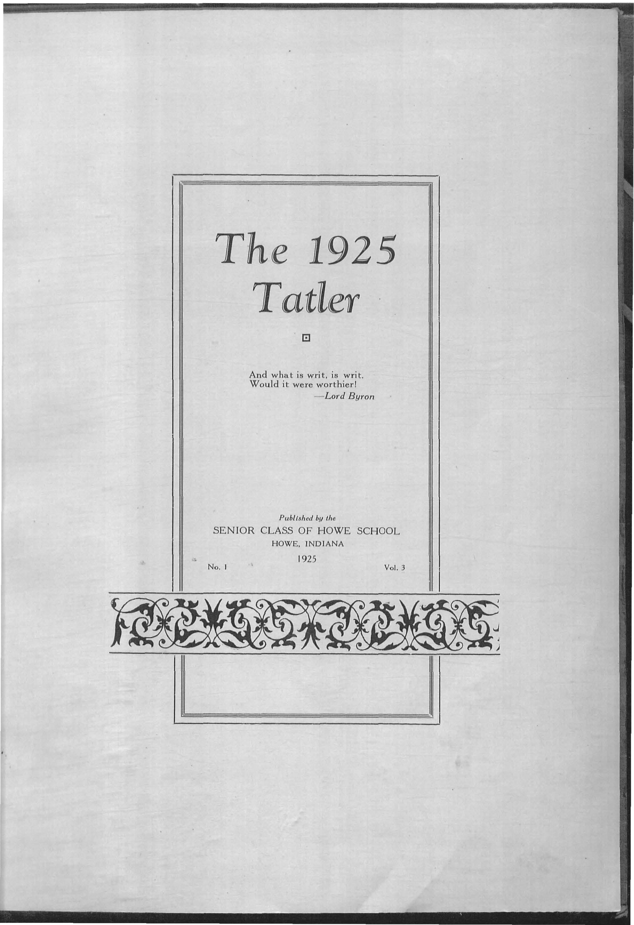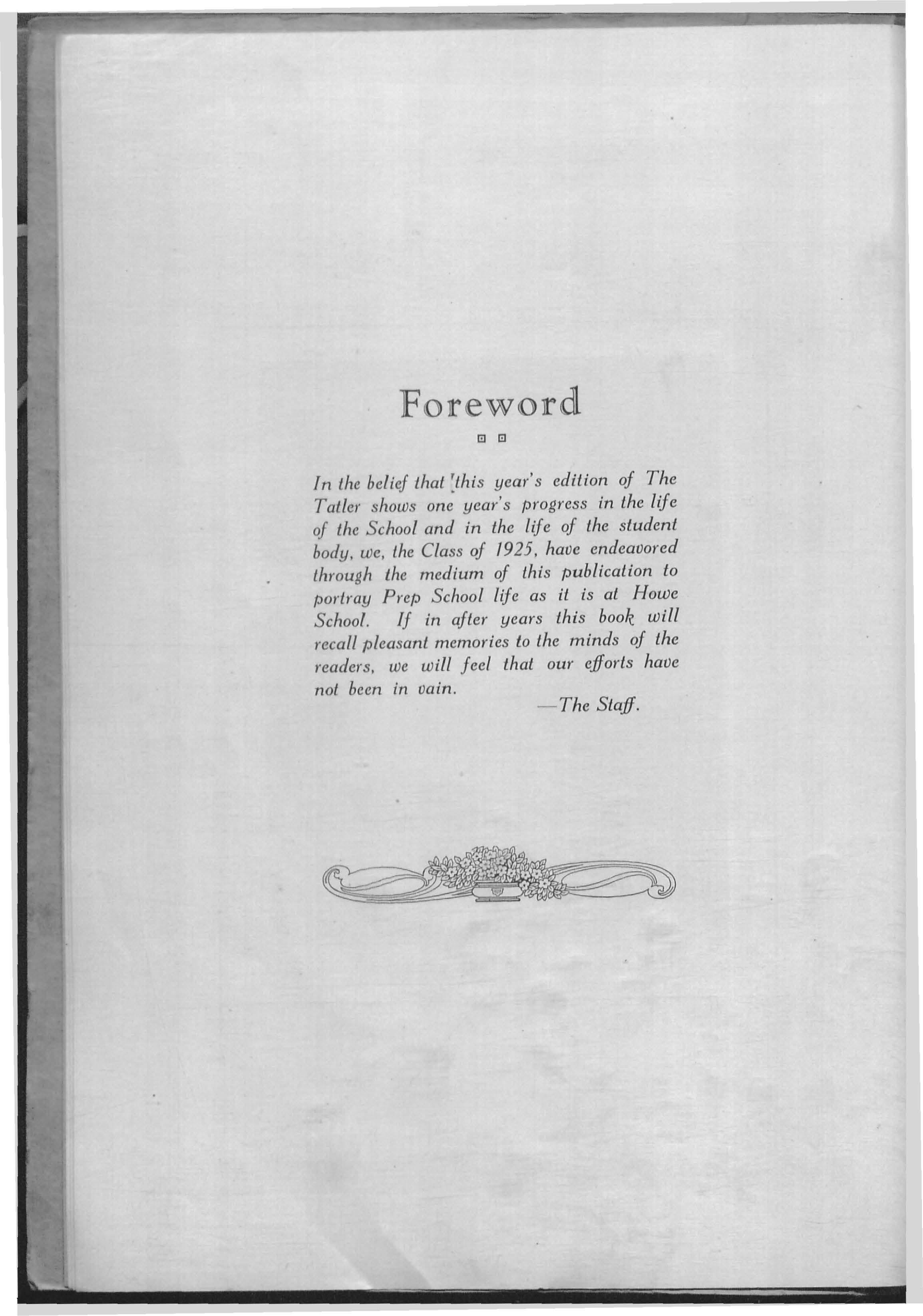 In the belief that :this year's edition of The T atlcr shows one year's progress in the !ife of the School and in the life of the student body, we, the Class of 1925, have endeavored through the medium of this publication to portray Prep School life as it is al Howe School. If in afler years this book will recall pleasant memories to the minds of the readers, we will feel that our efforts have not been in vain.