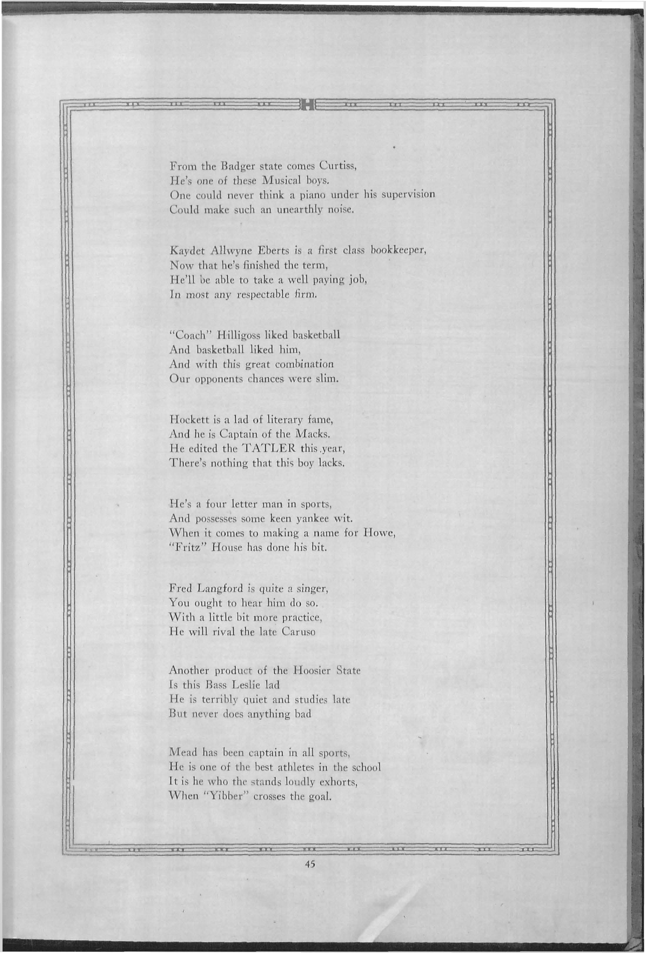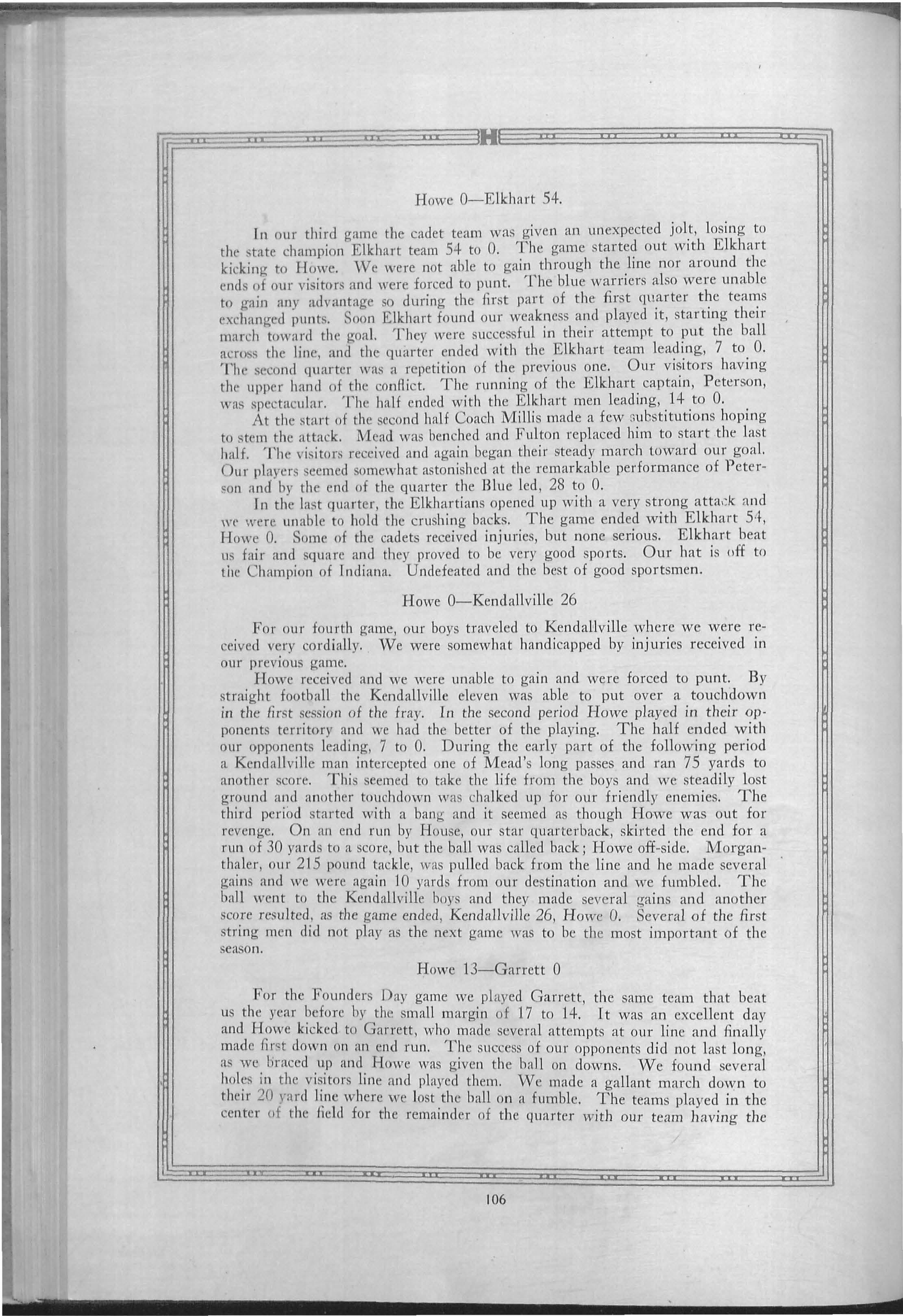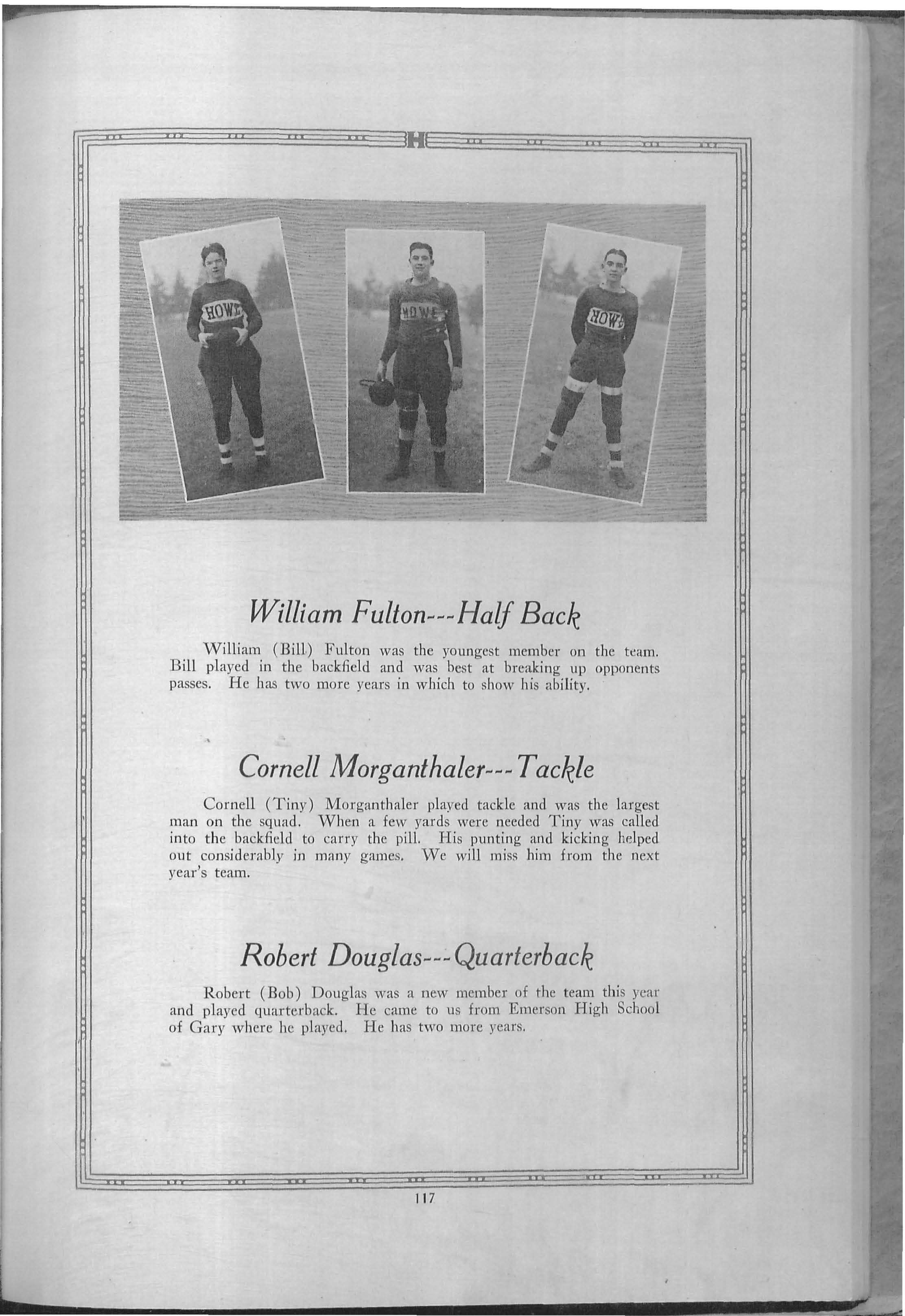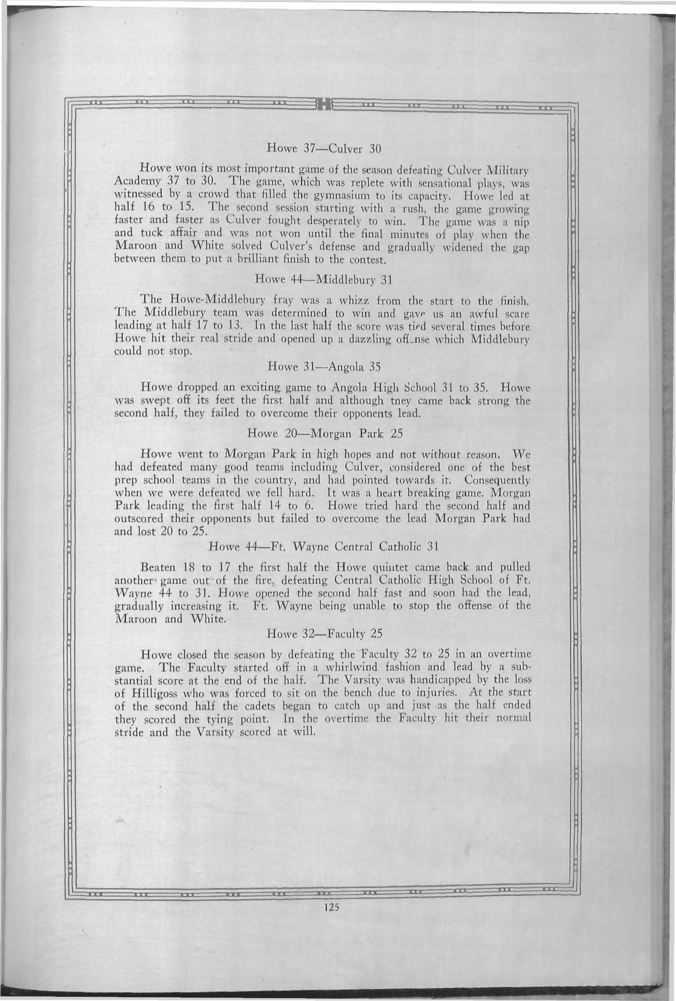 "Hi lli" is a fir s t year man but he ha s do ne wonders in hi s s hort stay at Howe. He was the very backbone of "T he Fighting Five" and he was larg e ly respordble for the dow nfall of the mighty Cu lv e r:. " Hilli" is one of the wittiest and best natured fellows of the Upper Pnd ha s the happy fac ulty of knowing that jok es were made to work two ways. H e is a rabid Hoosier first, la st and always. He int ends to continue hi s education at Indiana University.