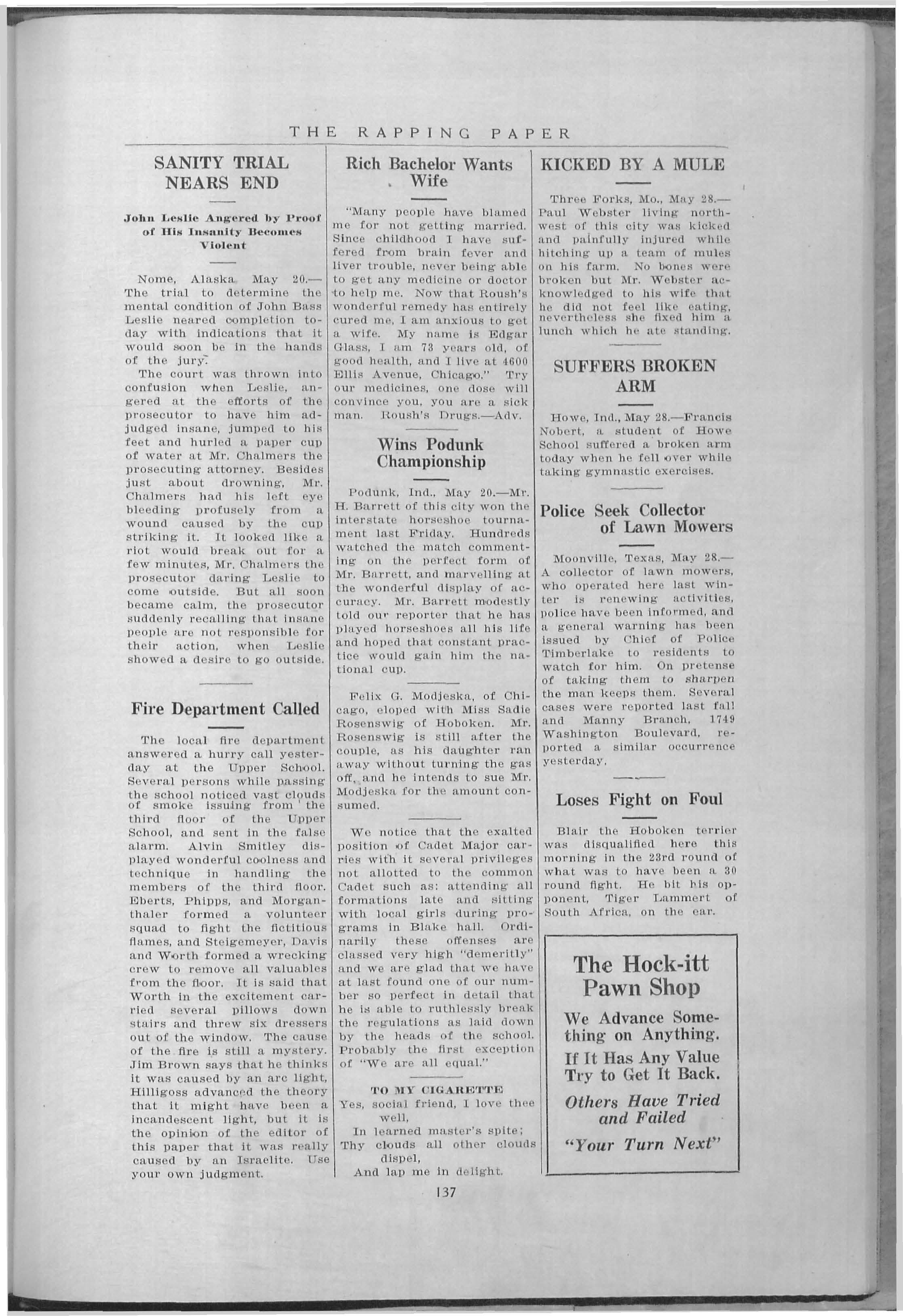 Werl n rsclu.y H ftr1·noon thr l l(>Ca l nm l H 11 Hnc0 ans \VPr<'cl n ruHh cn ll al Blake Hall. and A l vin 8mlt l ey Wfl.H tenderly ca rri e d from the h>tll. Dr. IJ A. 8l••dman o f lhc Armin1.;-to11 Charily H oHJ)ila l sta.lt•cl t. l111 l was suffe rin g- from 11 ' r ooe:> lili s," an ail111t• nt which b ol l! h 0 n ncl Pnt.rianLC'he >LCf!Uir ecl b y excess i ve u se or. the lun g·" in bl ow in g whif1ll eR In Bhik e Hall. Th e p a tr onH of thi s Lh ea Lo1· ar c overjoyf'<l ul t h iH tnig-ic cve T1t an cl a r l'