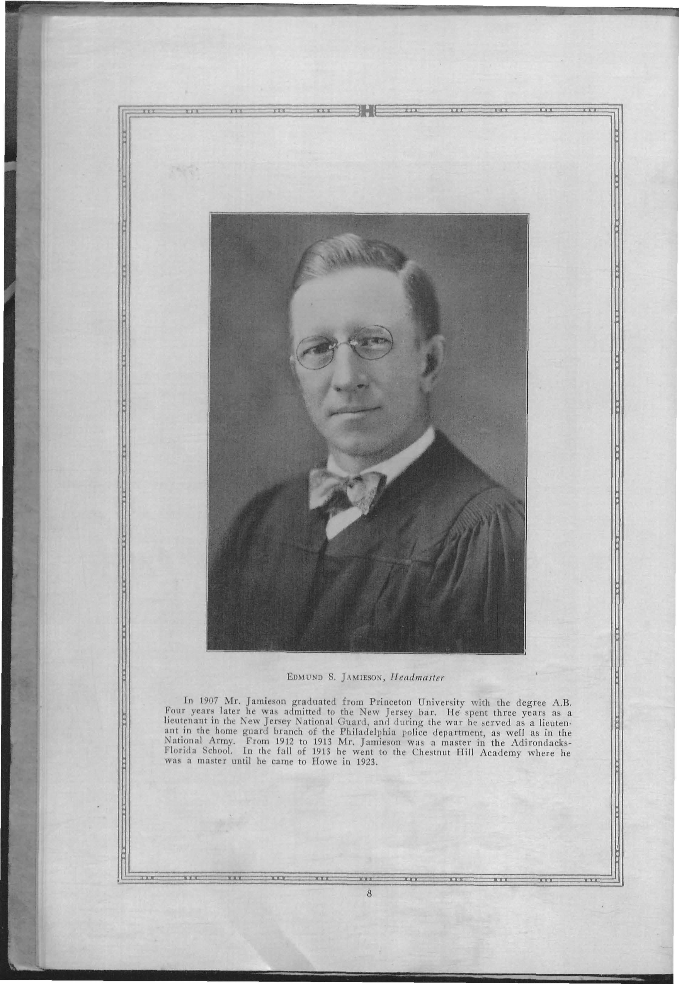Jn 19 07 Mr. Jami eson g raduated fro m Princeton University with th e degr ee A.B. Four ye:1r s Int er h e wn' admitted to the New J ersey bar. He' spe nt three years a s a li eu t e nant in th e ] er;ey Na tional Guard, and during the war h e >e rved as a li e ut e nant in the h o m e guard br:mch of th e Philadelphia po lic e department , n s we ll a s in the Na ti ona l Army. From 191 2 to 1913 Mr. Jamie so n was a maste1· in the AdirondacksF lor ida Schoo l. In th e fall of 1913 h e went to th e l'he>rnut Hill Academy where he wns a master until he came to Howe in 1923.