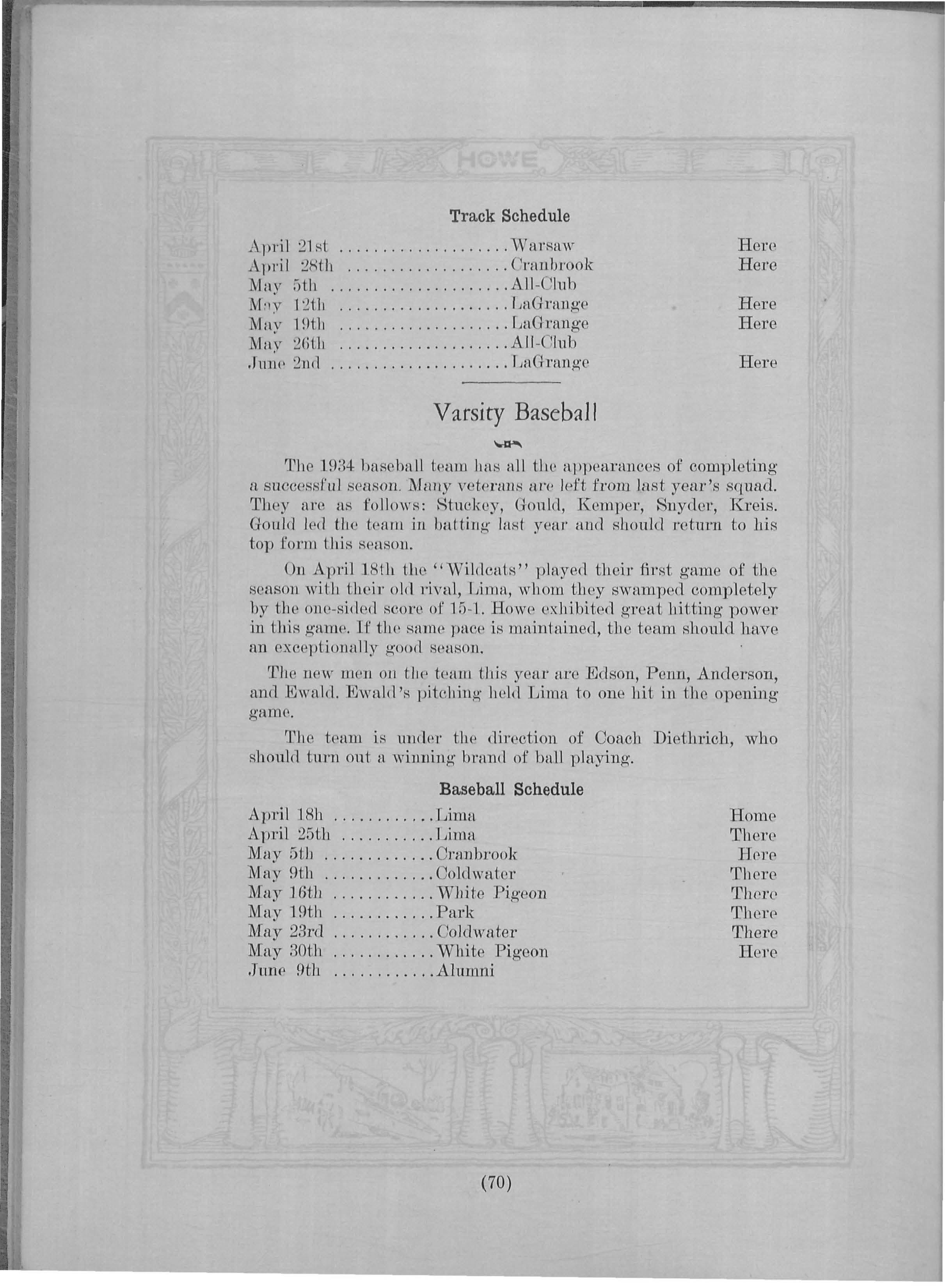 On Ap ril 18th the "Wi ld ca t :-;" plRye(l th ei r first game of the se ason with their old i·ival, ljima, whom they swamped comp l etely by the 01w-si d e< l score ol' 1 5- 1. Howp exhibitf'<l g r eat hittin g power in U1i R µ;anw. If tlu• samp J HI CP is mainl ained, the team s hould have an c.xcppt ion a ll y goo d HPason.