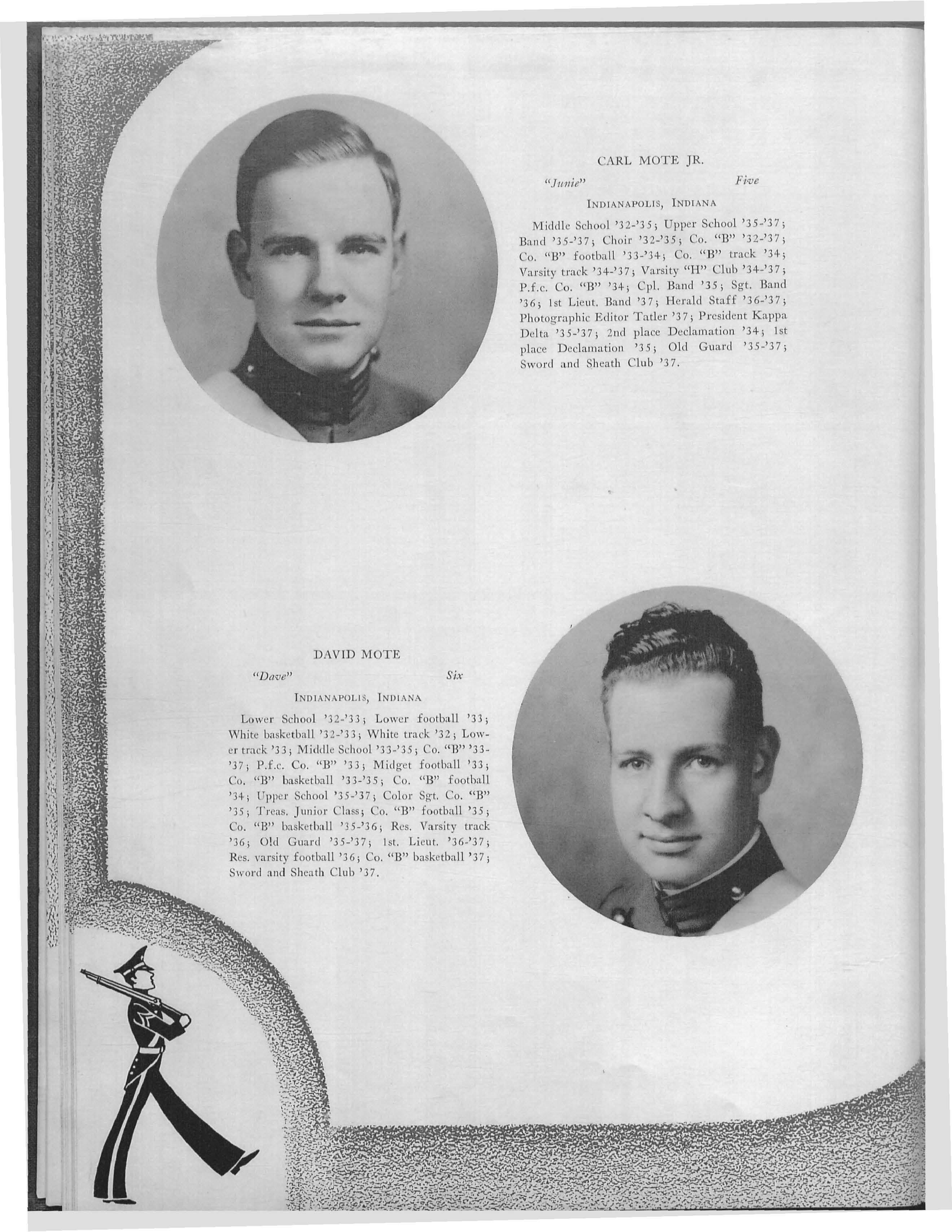 Upper School '35-'37; P.f.c. Co. "B" '36; Cp l. Co. "B" '36-'37; Co. "B" baskct lx tll '35-'37; Capta in Co. "13" footba ll '36; Conduct Ribbon g roup '35-'3 7; B usin ess Manager Herald '36-'3 7; Co. "B" t rack '36; H.i g hcst o ndu ct Record '35-'36; Tatlcr Staff '37; Captai n Co. "B" bask etball '37; Vn 1·sity track '37; Varsity "H"