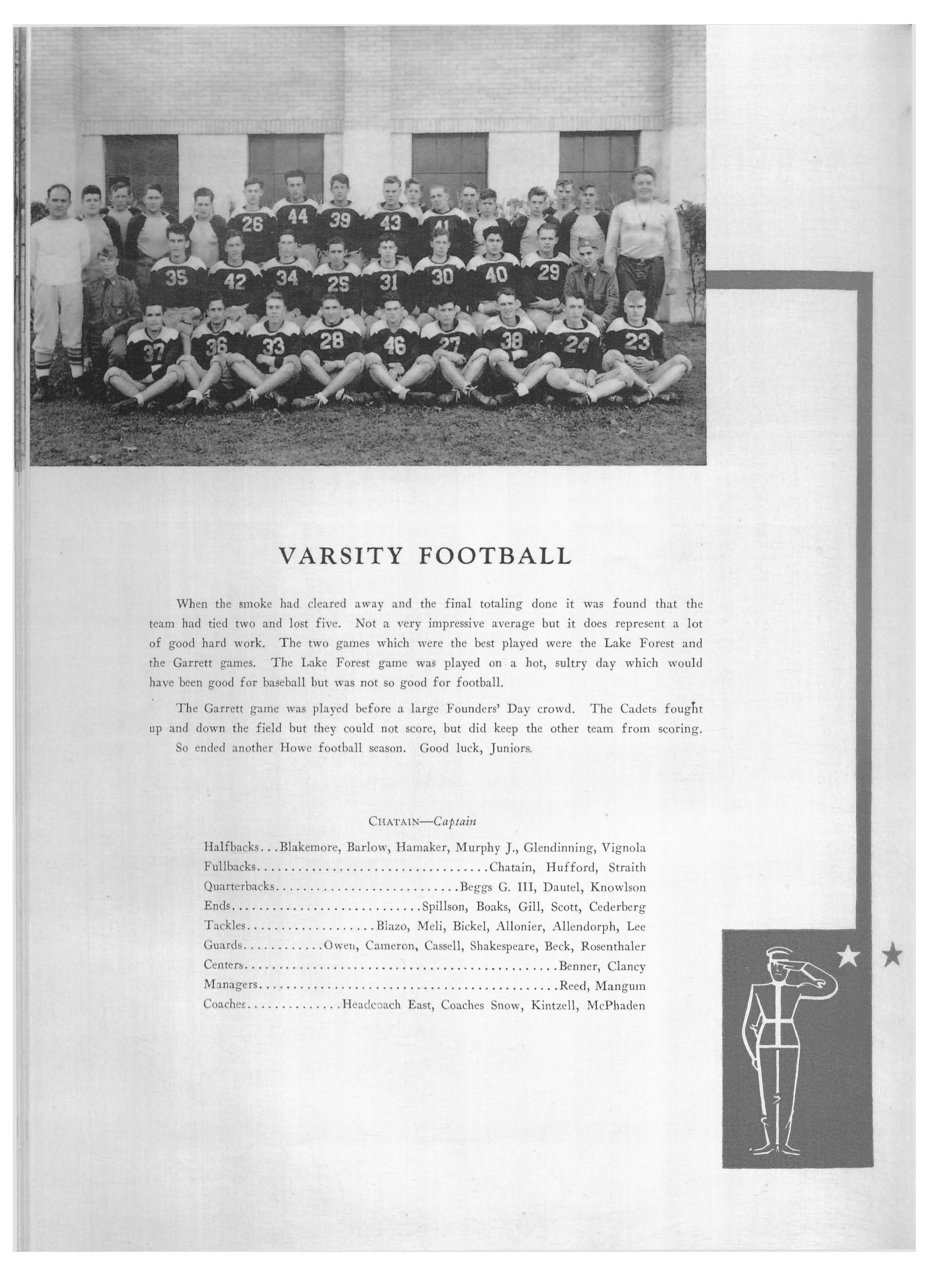 Low e r Sc h ool '32-'35; Lower football '32-'35; Low er basketball '34-'35; Lower bas e ball '32-'35; Lower track '34-'35; Tumbling team '32-'35; Soccer '32-'35; A ll Point Medals '32-'3+; Ch oir '32-'39; Conduct Ribbon Group '32-'35; Star Li st '32-'35; Legion of Honor '32-'35; Corpora l Company "L" '33-'34; lst Se rg eant Company ''L» '34-'35; Company "B" '35-'39; Sergeant-at-A rm s Freshman Class; Corporal Company "B" '36-'37; Company " B" football '35-'36; Company "B" bask e tball '35-'39; Varsity track '35-'39; Old Guard '35-'39; Varsity football '3 6-'39; Conduct Ribbon Group '35-' 39; Sergeant Company "B" '3 7-'3 8; Commander Old Guard '3 8-'39; Rifl e t ea m '37-'39; 2 nd Li e ut e n ant Company "B" '38-'39; Pistol Marksmanship me dal '38; Fort Knox gro up '38.