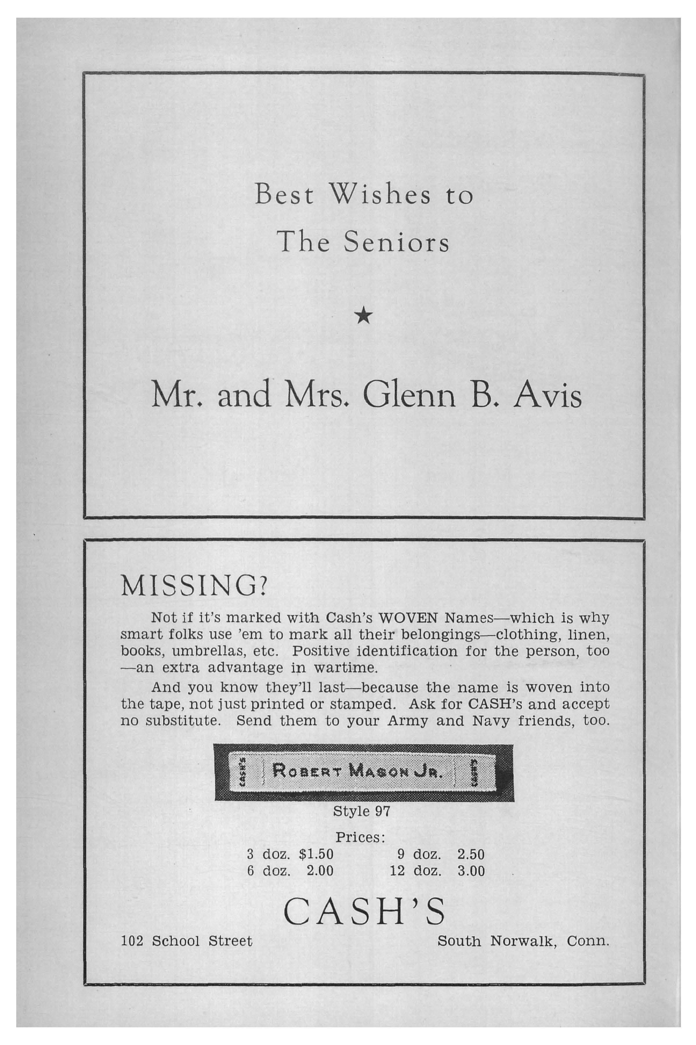 MISSING? Not if it's marked with Cash's WOVEN Names-which is why smart folks use 'e m to mark all their belongings-clothing , linen , books , umbrellas , etc. Positive identification for the person , too -an extra advantage in wartime. And you know they ' ll last--because the name is woven into the tape , not just printed or stamped. Ask for CASH's and accept no substitute. Send them to your Army and Navy friends, too. Style 97 Prices: 3 doz. $1.50 9 doz. 2 .50 6 doz. 2.00 12 doz. 3.00 CASH'S 102 School Street South Norwalk , Conn.