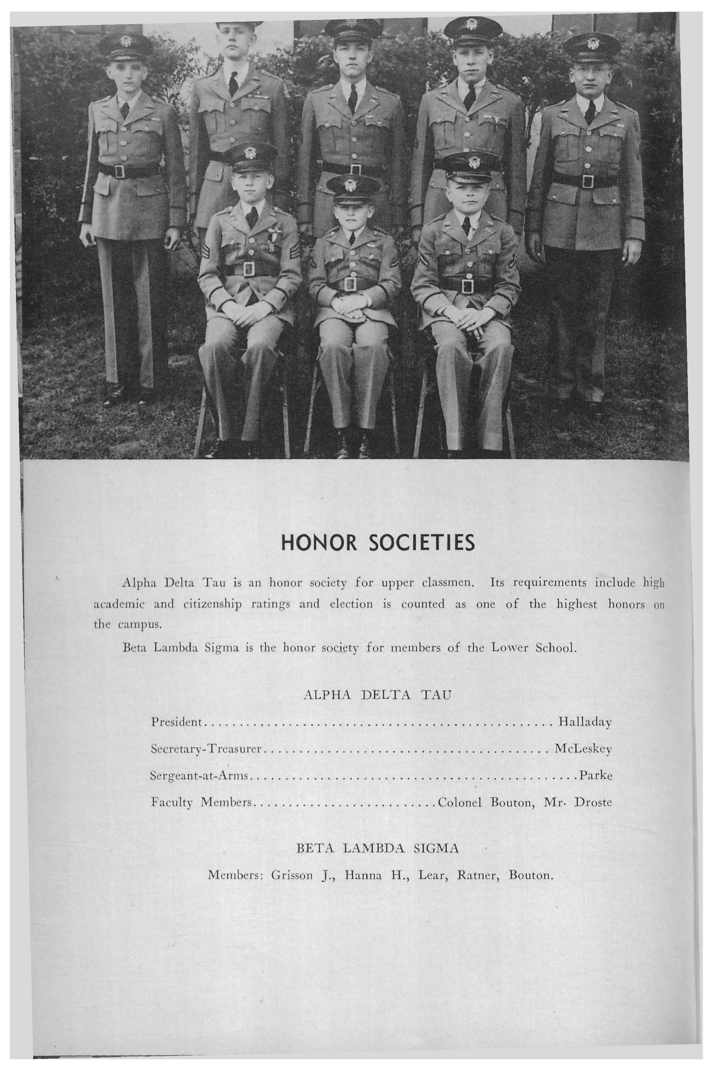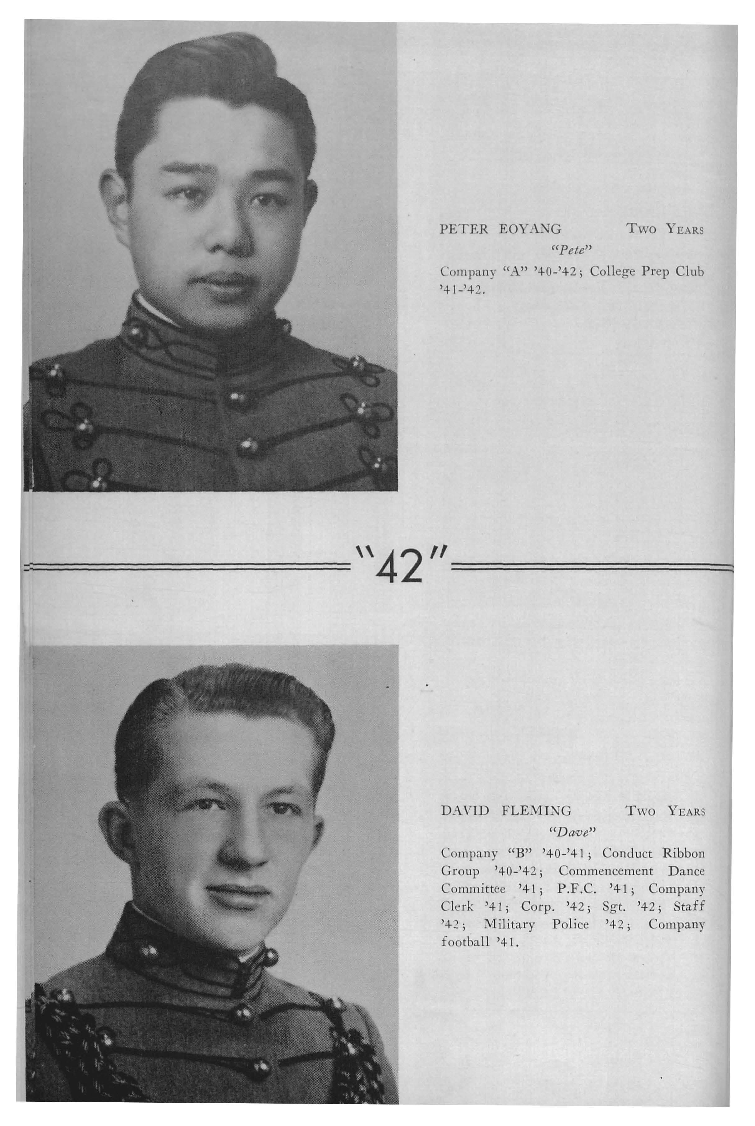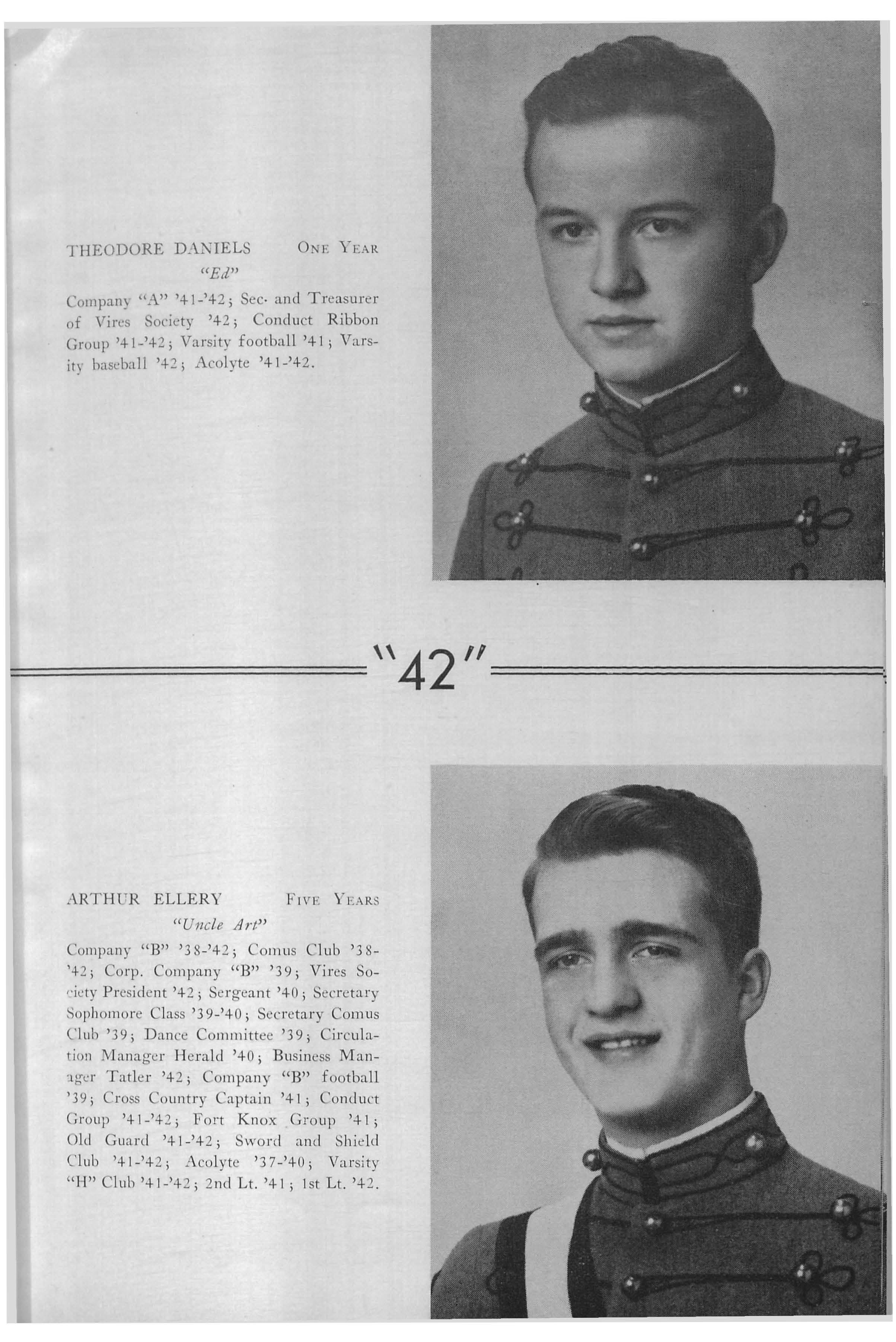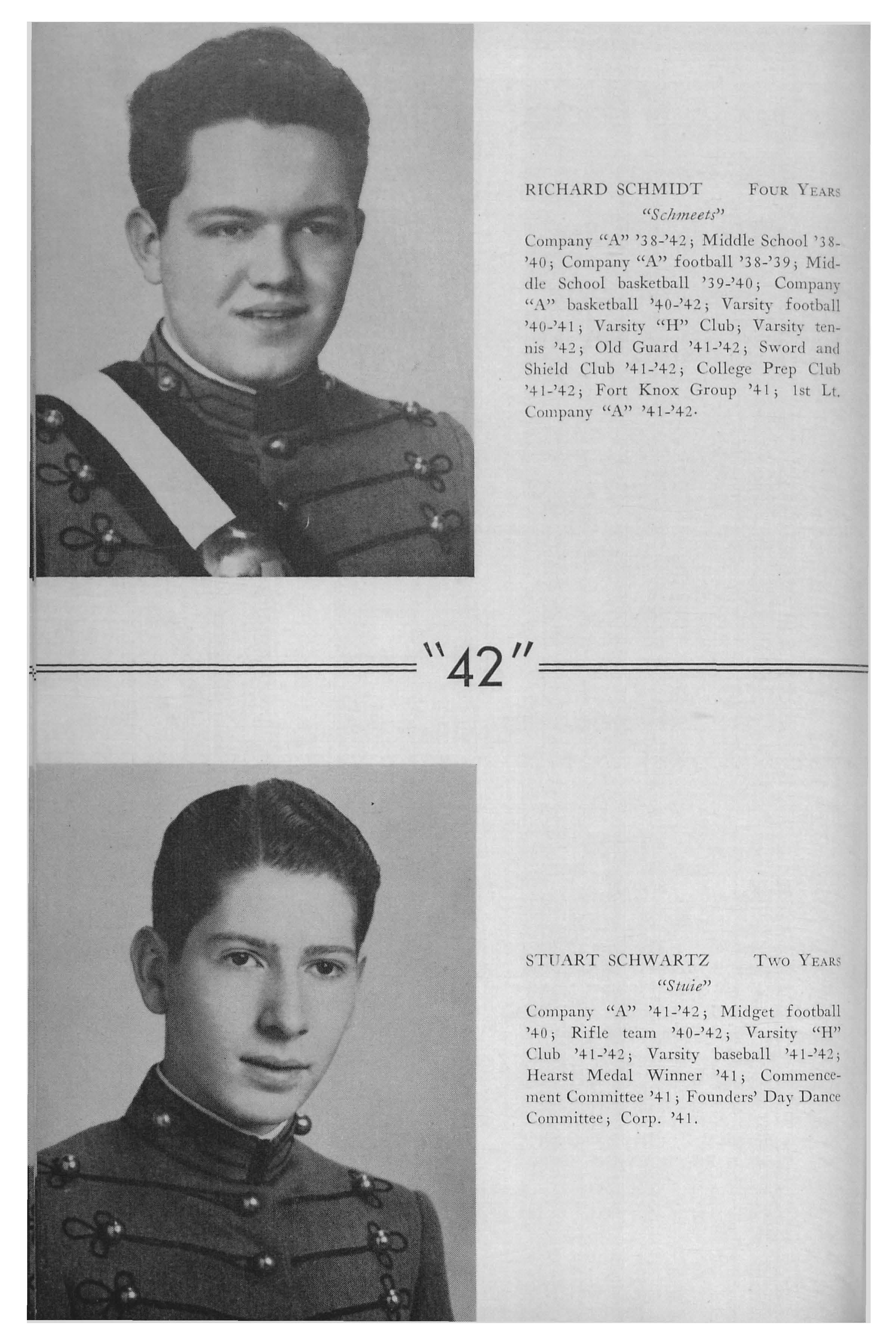 Tumbling '38-'40; Choir '38-'40; o. "A" '3 8-'42; How e Union '3 8-'42; "A" Company football '3 8 '42; Conduct Ribbon Group '38-'40; Asst. Stage Mgr. "Journey' End)) '39; Midd l e Sc ho ol bakt:tba ll '39; Honor Ca rd Group '39; Outstanding Mi l itary Ac hi eve ment Medal '+O; Spring Dance Comm ittee '40; Comus Club 140-'42; Kappa D e lta '4 0-'41; Company bask et ball '40-'4 1 ; Commencement Dance Committee '4 1 ; Old G u ard '41-'42; Varsity football '4 1 ; Sgt. at Arms Juni or Cl ass 1 40-'4 l; Sgt . at Arms Com u s C lub '40-'+ 1; Vice-Pres. oll ege Pr e p Cl ub '4 l'4 2; Stage Mgr. "C up of Tea" '42; VicePn:s· Camus C lub '42; Sword and Shield Club 1+2; Vict.:-Pres Se ni or Class '4 1-'4 2; Captain "A,, Company '4 1- '42