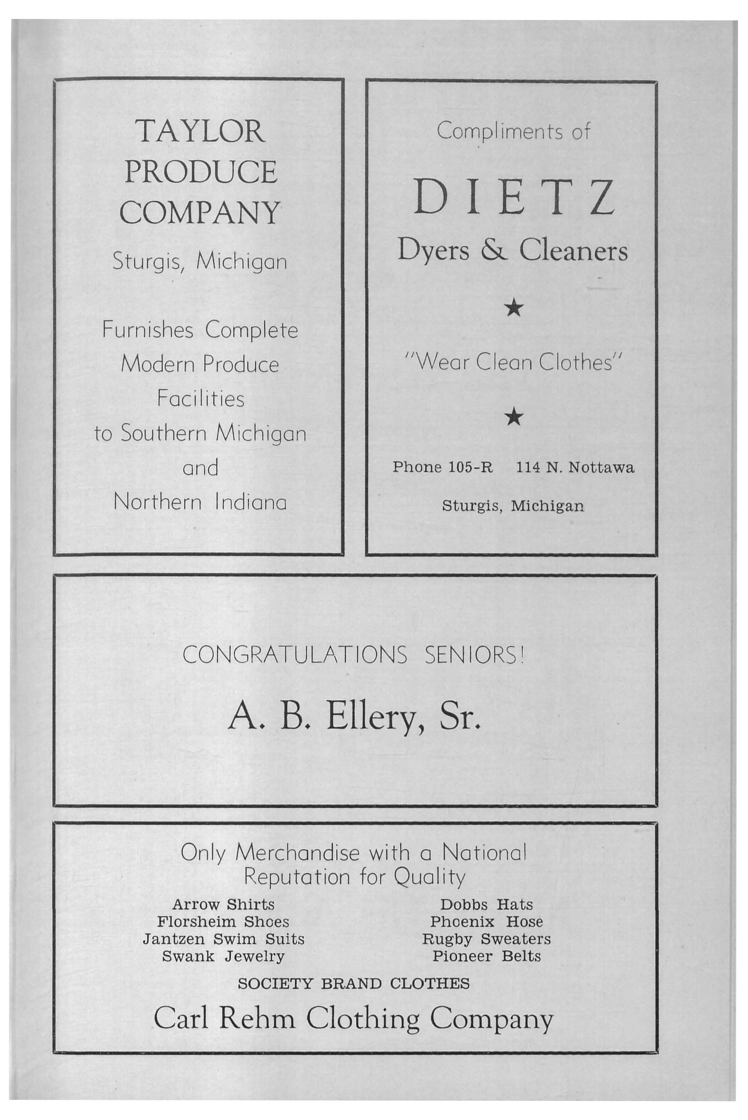TAYLOR PRODUCE COMPANY Sturgis, Michigan Furnishes Com plete Modern Produce Faciliti es to So uthern Mi c higan and Northern Indiana Compliments of DIETZ Dyers & Cleaners * "Wear Cleon Clothes" * Phone 105-R 114 N. Nottawa Sturgis, Michigan CONGRATUL!\TIONS SENIORS! A. B. Ellery, Sr. Only Merchandise with a Notional Reputation for Quo Iity Arrow Shirts Florsheim Shoes Jantzen Swim Suits Swank Jewelry Dobbs Hats Phoenix Hose Rugby Sweaters Pioneer Belts SOCIETY BRAND CLOTHES Carl Rehm Clothing Company