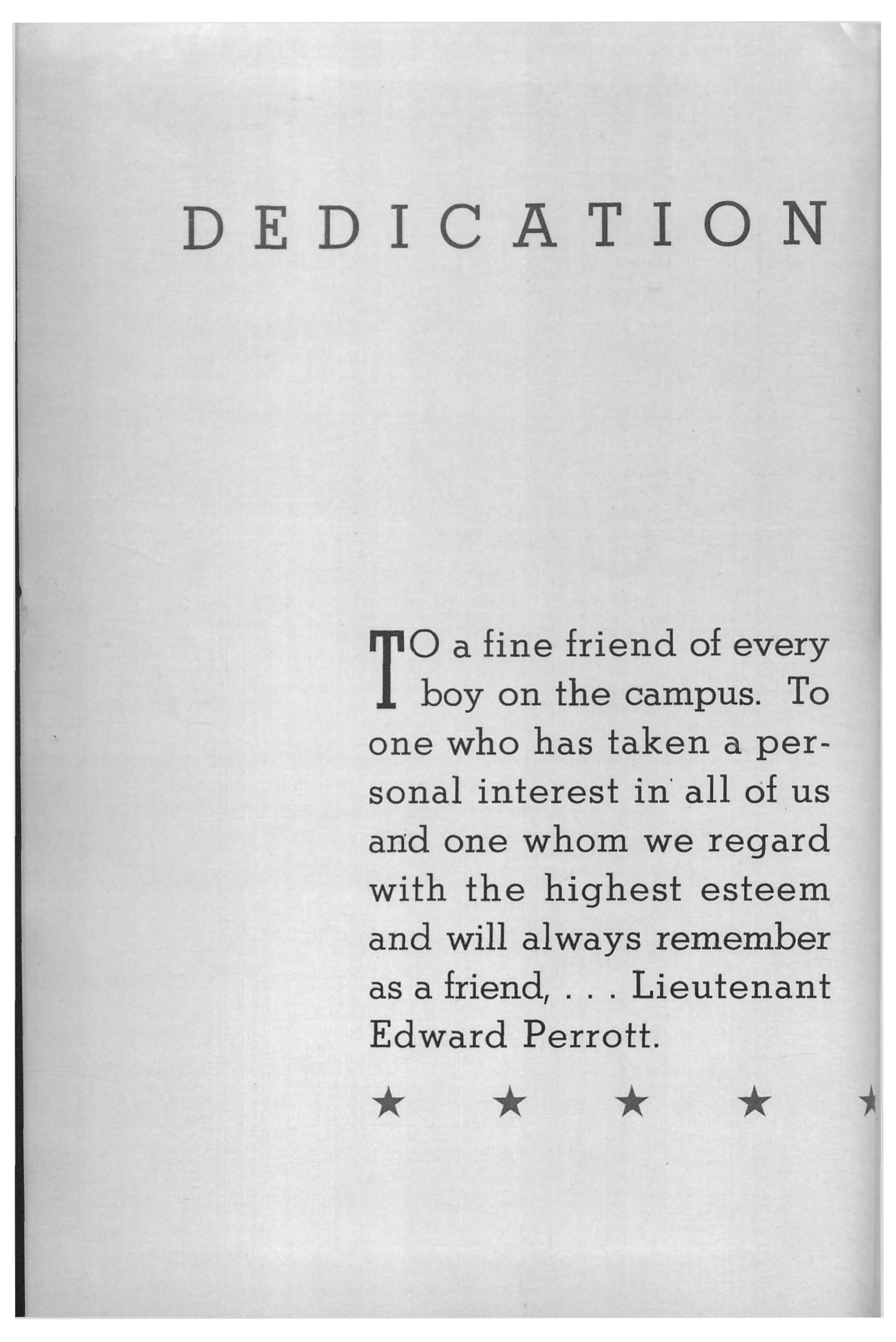 T o a fine friend of every boy on the campus. To o n e who has taken a personal interest in· all of us and one whom we regard with the highest esteem and will always remember as a friend, ... Lieutenant Edward Perrott.