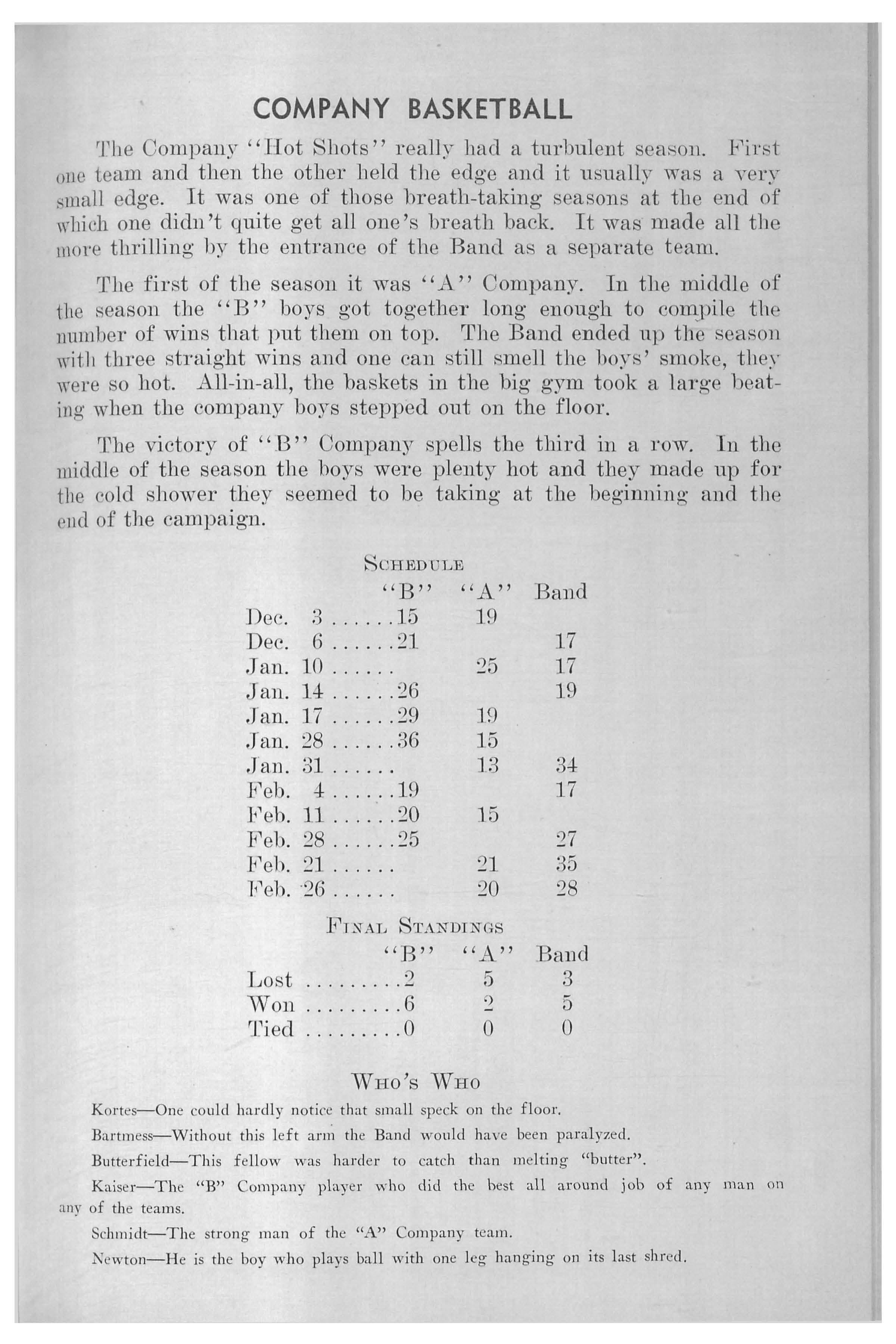 P ebnwry 11-1-Iowe defeats Rome City. Annual company snowlml l battle held; '' B'' aud Band rout ''A'' Company. Co mus Club f eecl.