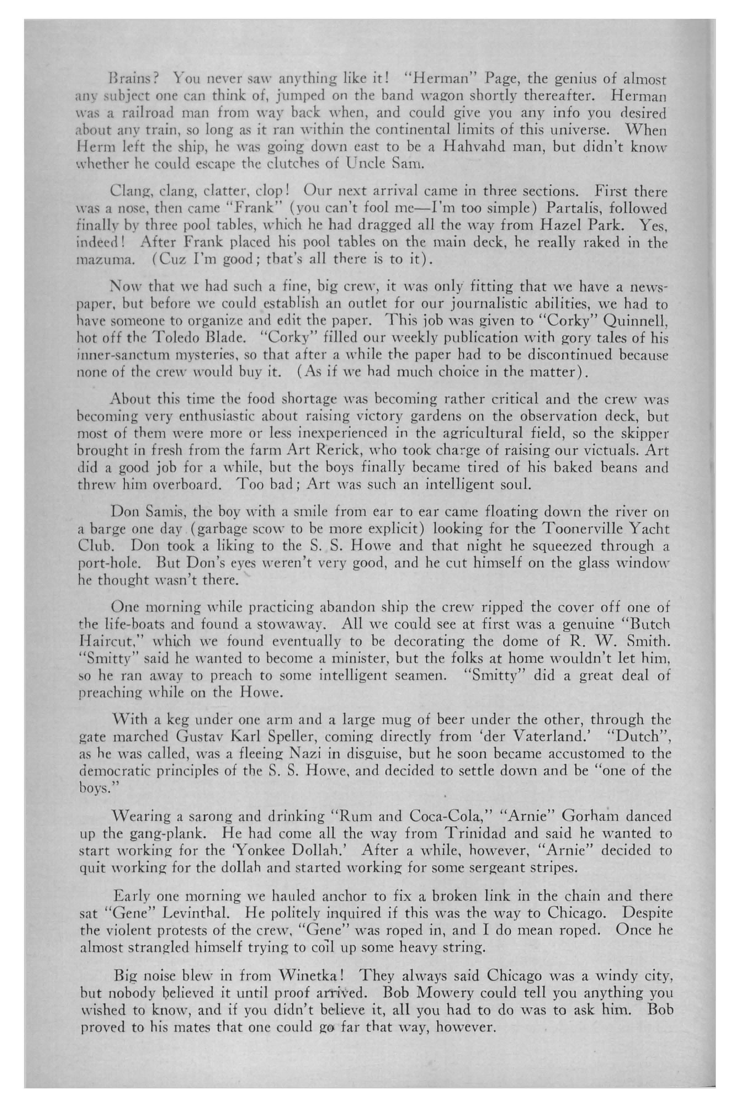 "\Valt" Fader made hi entree on the S. S. Howe that same year. Walt was long and lanky with a voice that almost everyone mistook for a fog horn. I say almost evervone. One of those exception was <leek-hand first class "Spook" Rerick, who boar.ded ship that same year. "Spook" spent most of his night running all over the haunting the skipper and the rest of the crew. He was called deck-hand first class because of his prnfitable proficiency with a pack of cards. Spook also brought on board a basketball, which he kept tossing through the hoop during his days on the Howe.