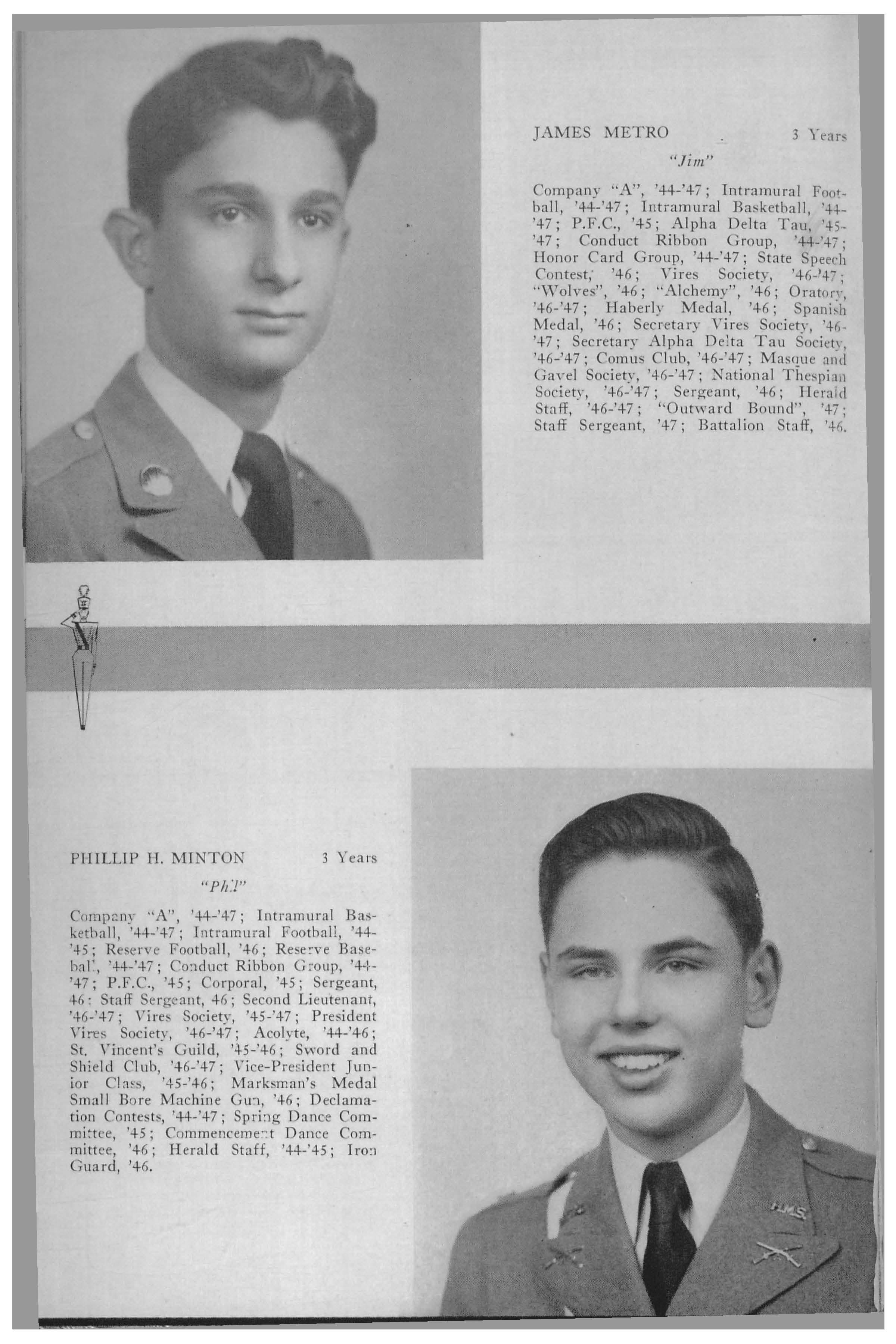 Company "B" '45-'47 · Aco lyte '45-'47 · St. vincent's Gui l d, '4S-'47; ' P F.C , '45; Sergeant, '46; Varsity Tr.ack, '46-'47; Varsity Football, '46; Varsity "H" Club, '46-'47; Intramura l Footba ll, '45-'46; Intramural Softba ll , '45; Band, '45-'47; Intramural Basketba ll , '45-'47; Sharpshooter's Medal, '45; Conduct Ribbon Group, '45; Iron Guard, '46; Founders' Day Dance Committee, '46; Hera l d Staff, '45'46; All Star "B" League Football Team, '46; Intramura l Basketba ll Champions, '47.