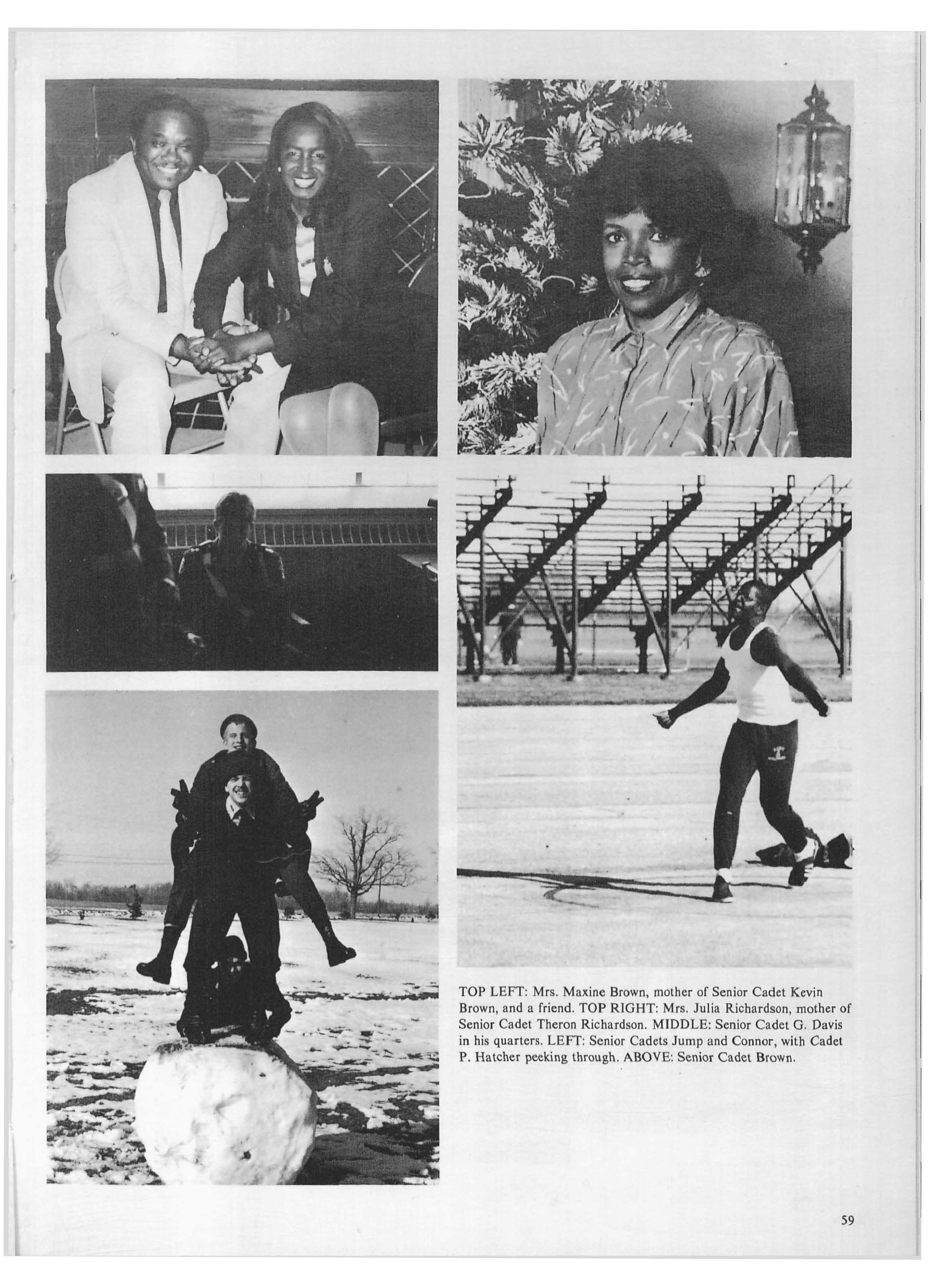 TOP RIGHT : Mrs . Julia Richardson, mother of Senior Cadet Theron Richardson MIDDLE: Senior Cadet G. Davis in his quarters LEFT: Senior Cadets Jump and Connor, with Cadet P. Hatcher peeking through. ABOVE: Senior Cadet Brown 59