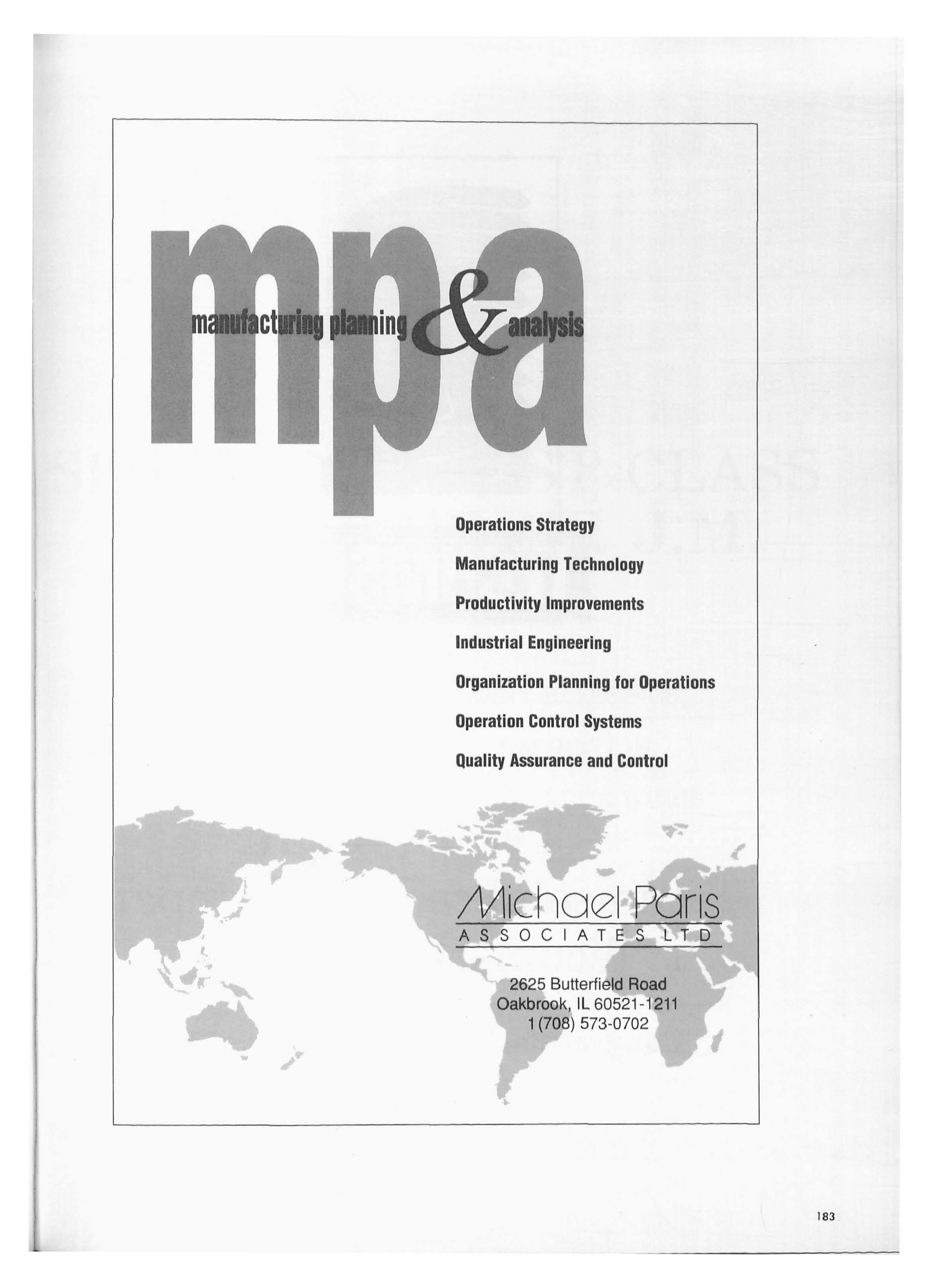 Operations Strategy Manufacturing Technology Productivity Improvements Industrial Engineering Organization Planning for Operations Operation Control Systems Quality Assurance and Control Michael Paris ASSOCIATES LTD 2625 Butterfield Road Oakbrook , IL 60521-1211 1 (708) 573-0702 ' 183
