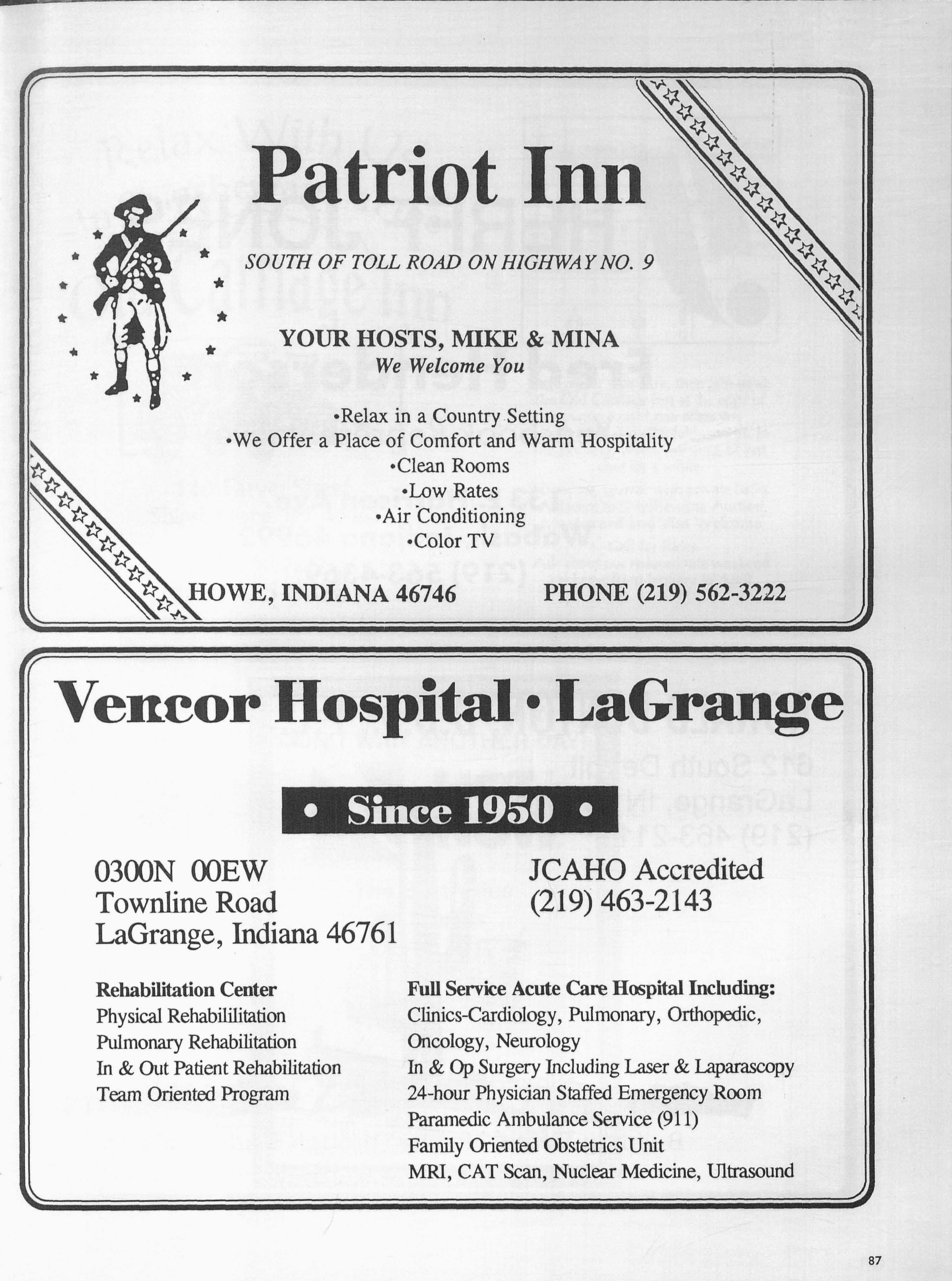 * * Patriot Inn SOUTH OF TOLL ROAD ON HIGHWAY NO. 9 • * * YOUR HOSTS, MIKE & MINA We Welcome You •Relax in a Country .Setting •We Offer a Place of Comfort and Warm Hospitality ·Clean Rooms •Low Rates ·Air ·conditioning ·Color TV PHONE (219) 562-3222 Vencor Hospital• LaGrange • Since 1950 • 0300N OOEW Townline Road LaGrange, Indiana 46761 Rehabilitation Center Physical Rehabililitation Pulmonary Rehabilitation In & Out Patient Rehabilitation Team Oriented Program JCAHO Accredited (219) 463-2143 Full Service Acute Care Hospital Including: Clinics-Cardiology, Pulmonary, Orthopedic, Oncology, Neurology In & Op Surgery Including Laser & Laparascopy 24-hour Physician Staffed Emergency Room Paramedic Ambulance Service (911) Family Oriented Obstetrics Unit MRI, CAT Scan, Nuclear Medicine, IBtrasound 87
