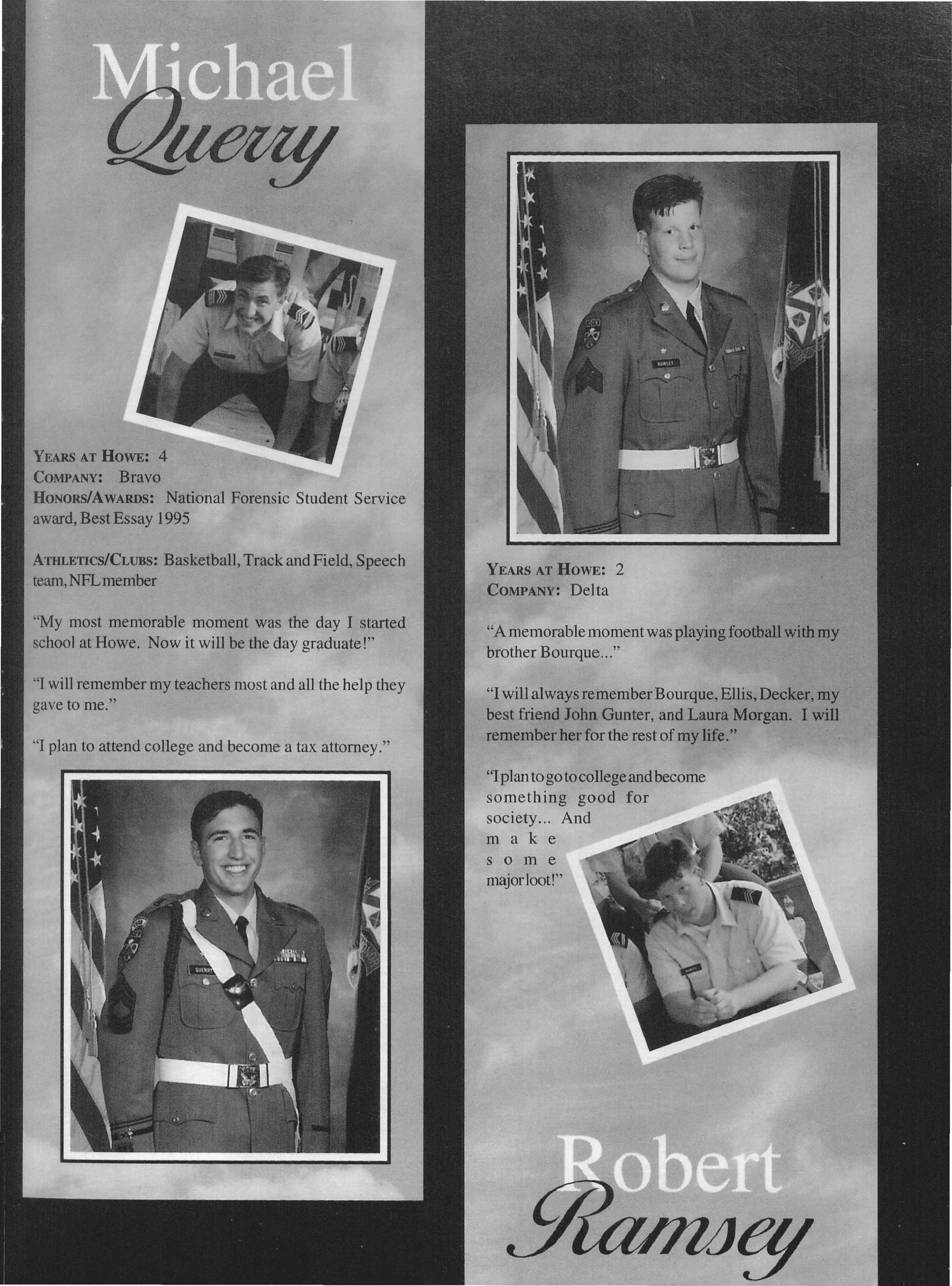 YEARS: 3 COMPANY: Delta ATHLETICS/CLUBS! Rifle team, baseball, Environmentally Concerned Students, Acolyte, Radio Club, Habitat for Humanity. "I will remember Mr. Pagin the most from Howe." "I plan to go to college and major in marine biology, then join the airforce." "My Favorite teacher was Mr. Pickard. He was the first English teacher to actually give me an A!" YEARS AT HoWE: 4 COMPANY: Echo HoNoRS/AwARDS: All American Scholar , Who's Who in American High Schools