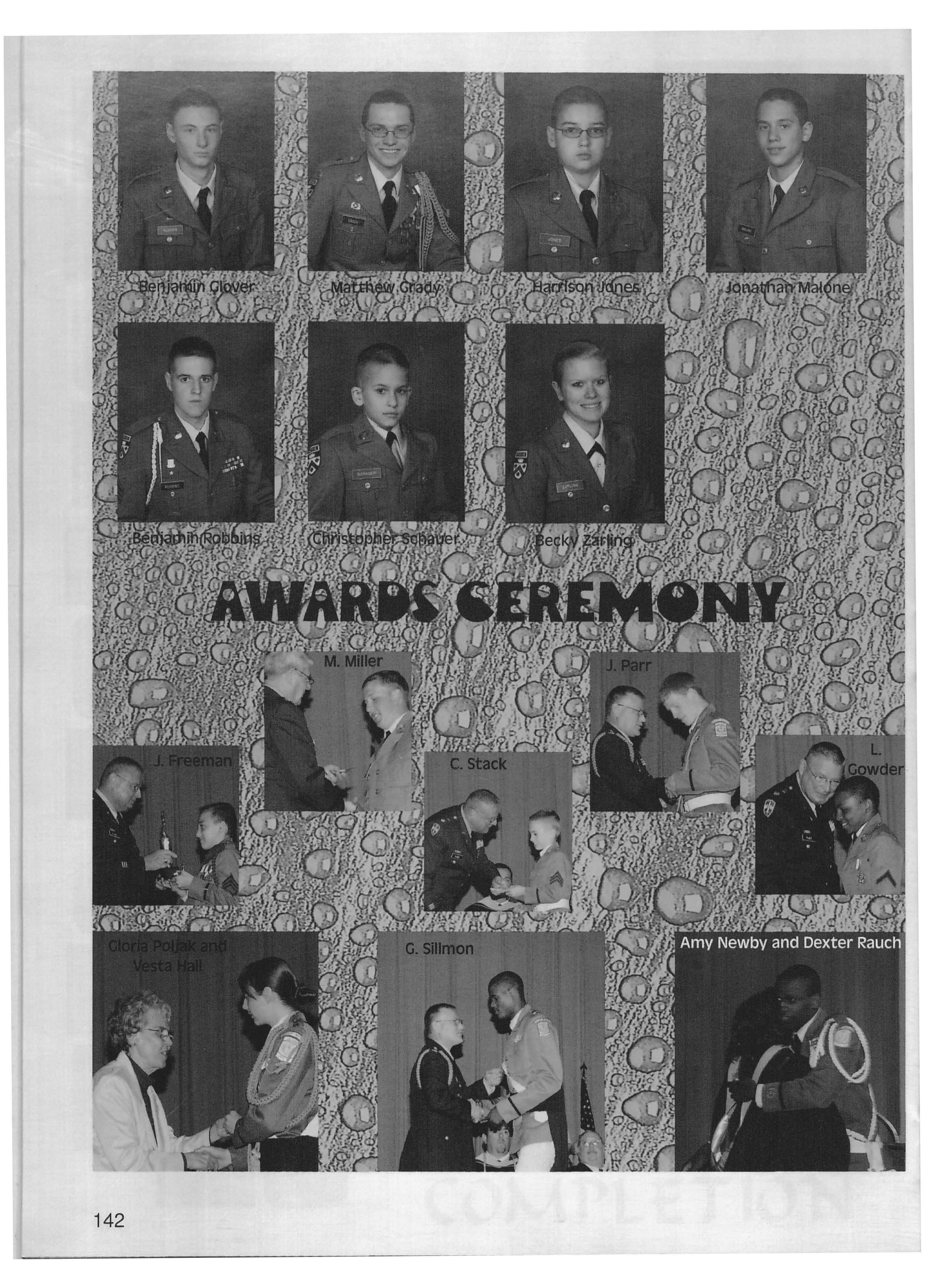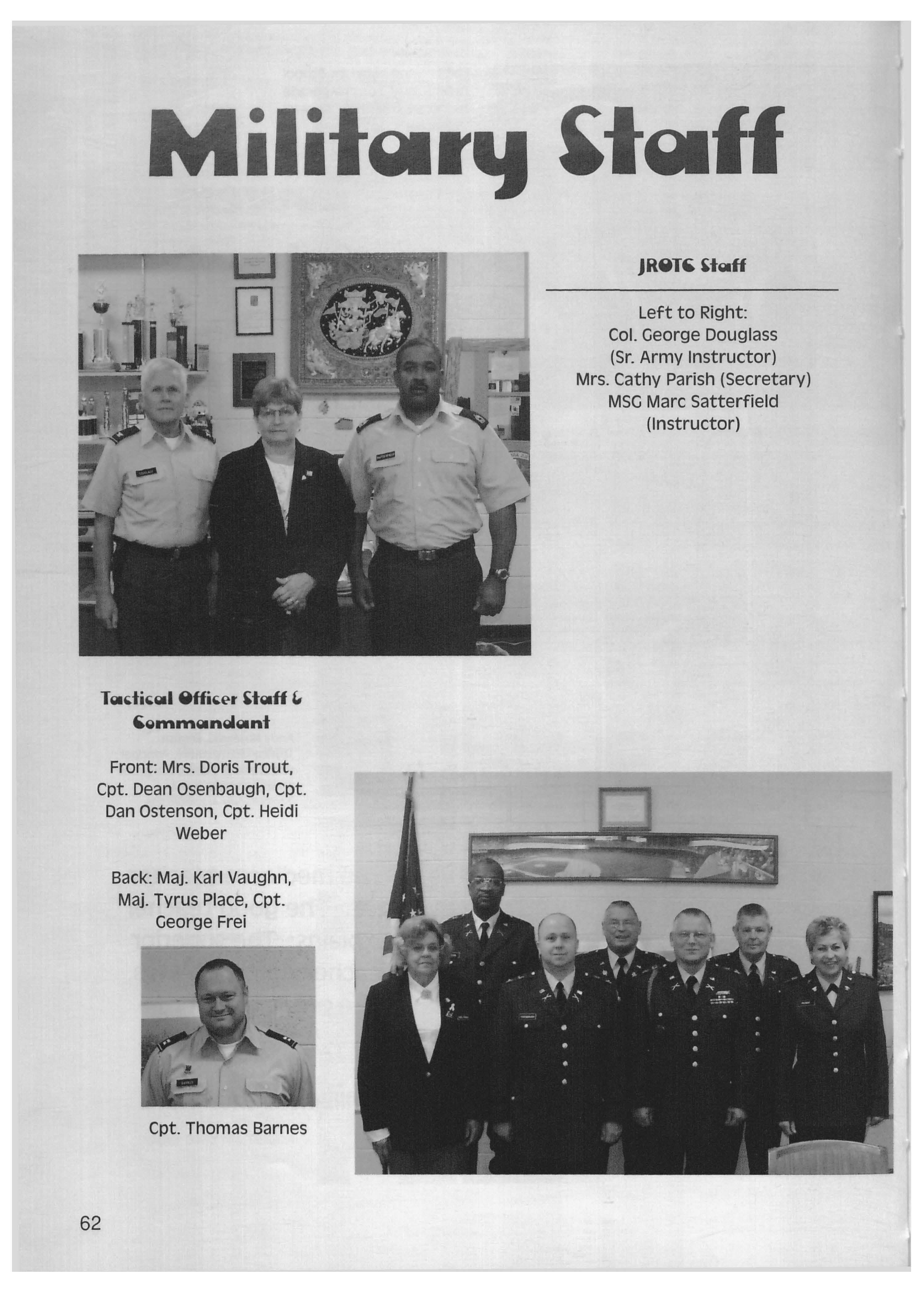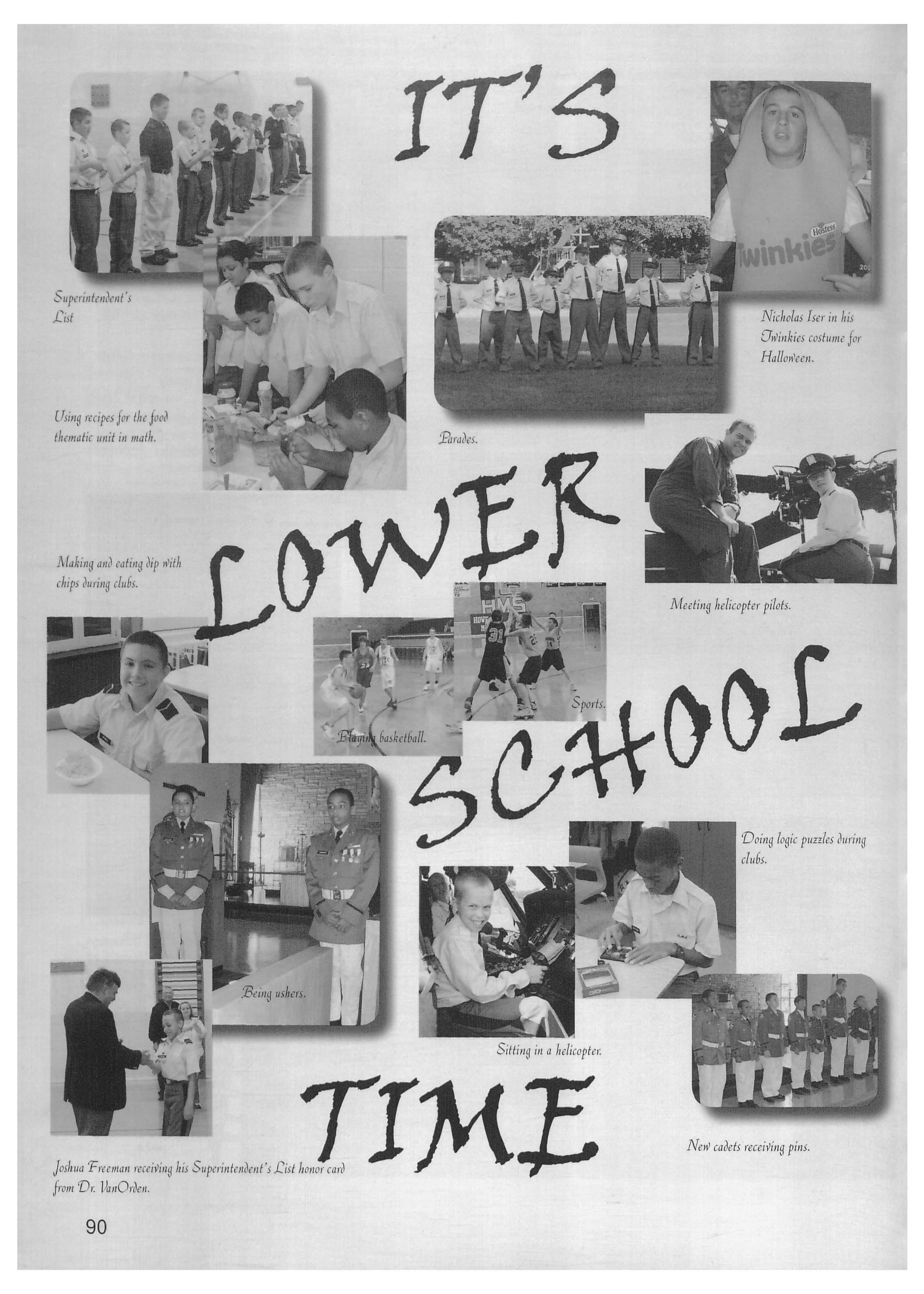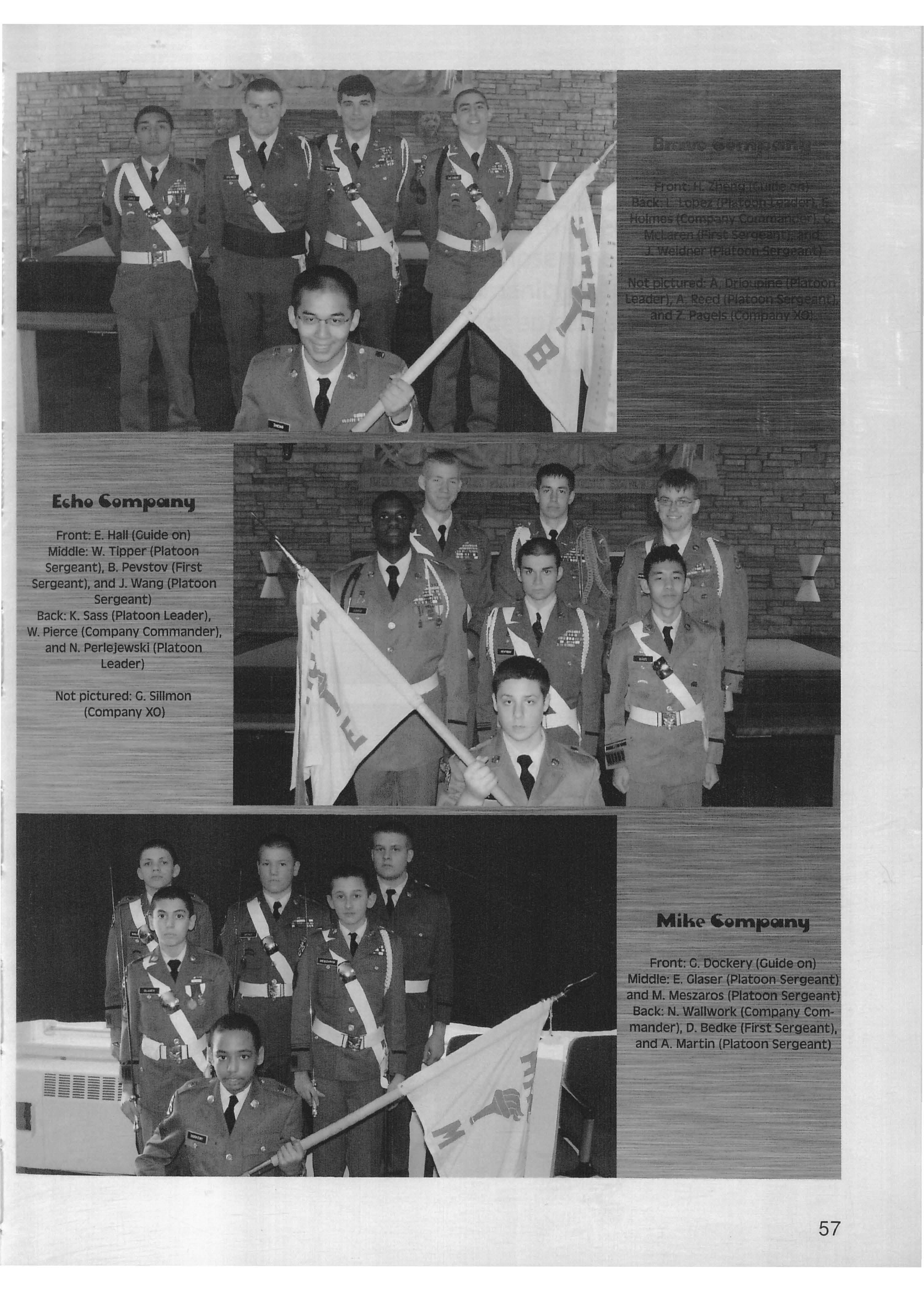 [)edic:atiC>ti .......................................................................LI. Seti iC> rs ................. ............................................................. 6 MC>c:k Elec:tiC>tiS ...............................................................15 U11derc:lassmen ....................................................................16 CC> rps' TC>p Ten ................................................................... 2 6 1nternatiC>11al Students ................................................. 27 Fall SpC>rts ......................................................................... 28 Winter sp C> rt s................................................................. 3 6 CC>mpanies .......................................................................46 Batta liC>ti/ CC>m pa 11v Staff ............................................ 5 6 Fac:ulty & Staff ................................................................ 58 Caught in Class ................................................................66 Clul:Js ...................................................................................68 Spec:ial Eve11ts .................................................................. 74 LC>wer Sc:hC>C>I .................................................................... 90 LC>wer Sc:hC>C>I SpC>rts ....................................................... 92 LC>wer Sc:hC>C>I Cl u IJs ......................................................... 98 GeC>graphy /Spelli11g Bee ...............................................100 LS Sc:ienc:e Fair..................................................................102 Fifth Grade ........................................................................104 Sixth Grade ........................................................................105 Seventh Grade ..................................................................106 Eighth Grade .....................................................................108 LS Events ...........................................................................110 Ads ................... ...................................................................112 CC>rps C>f Cadets ..............................................................12 5 AutC>graphs ......................................................................126 Spring Supplement. .......................................................12 9 3