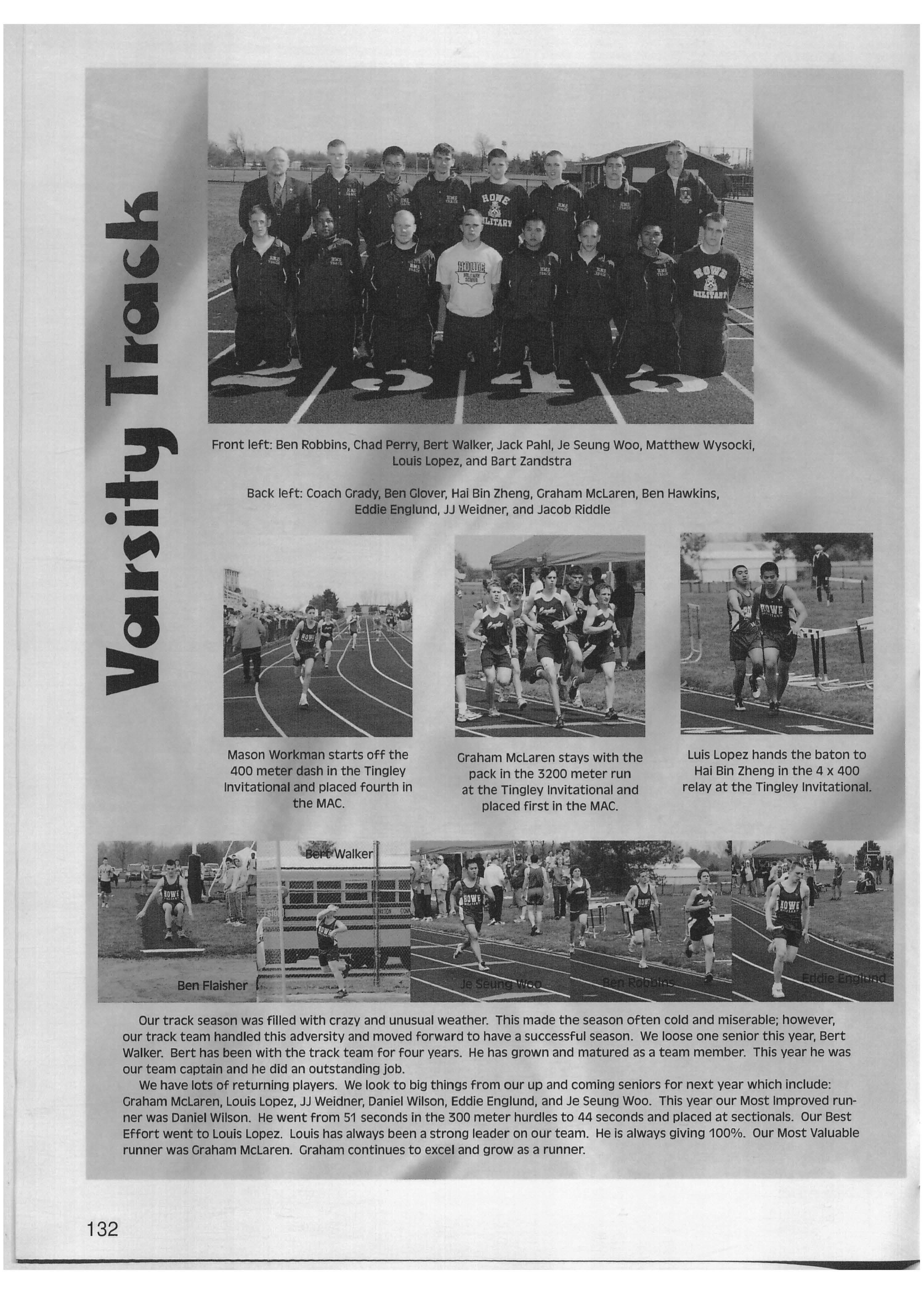 our track season was filled with crazy and unusual weather. This made the season often cold and miserable; however, our track team handled this adversity and moved forward to have a successful season. We loose one senior this year, Bert Walker. Bert has been with the track team for four years. He has grown and matured as a team member. This year he was our team captain and he did an outstanding job.