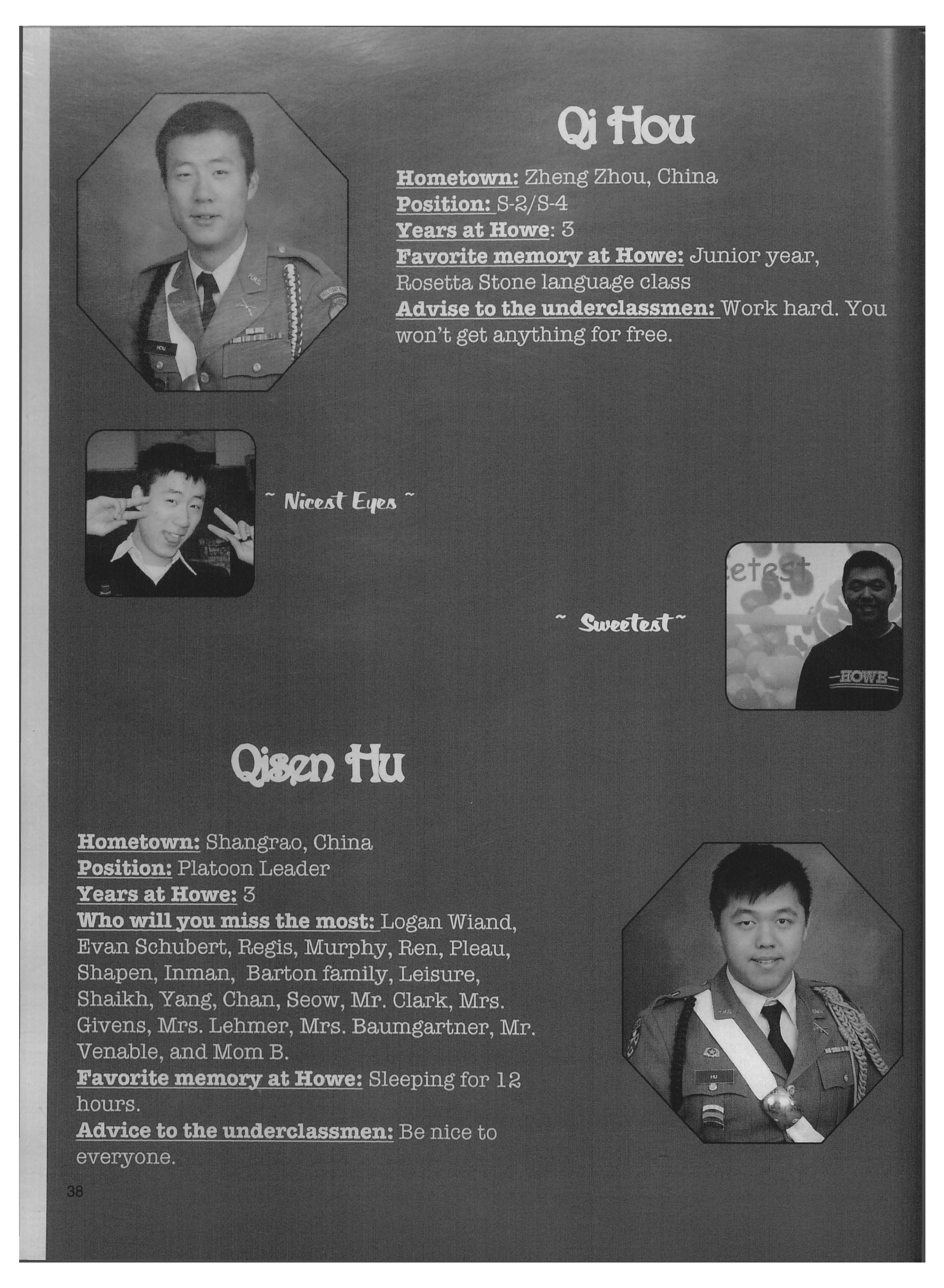 Qisen "Justin" Hu is from Shanghai, China. What he likes the most about America is less homework. One of the biggest differences between America and China is the food and the language. His favorite hobby is eating good food. His favorite movie is The Sound ofMusic and his favorite music artist is Katie Perry.